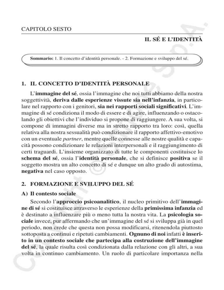 CAPITOLO SESTO IL SÉ E L’IDENTITÀ Sommario: 1. Il concetto d’identità personale. - 2. Formazione e sviluppo del sé. 1. IL CONCETTO D’IDENTITÀ PERSONALE L’immagine del sé, ossia l’immagine che noi tutti abbiamo della nostra soggettività, deriva dalle esperienze vissute sia nell’infanzia, in particolare nel rapporto con i genitori, sia nei rapporti sociali significativi. L’immagine di sé condiziona il modo di essere e di agire, influenzando o ostacolando gli obiettivi che l’individuo si propone di raggiungere. A sua volta, si compone di immagini diverse ma in stretto rapporto tra loro: così, quella relativa alla nostra sessualità può condizionare il rapporto affettivo-emotivo con un eventuale partner, mentre quelle connesse alle nostre qualità e capacità possono condizionare le relazioni interpersonali e il raggiungimento di certi traguardi. L’insieme organizzato di tutte le componenti costituisce lo schema del sé, ossia l’identità personale, che si definisce positiva se il soggetto mostra un alto concetto di sé e dunque un alto grado di autostima, negativa nel caso opposto. 2. FORMAZIONE E SVILUPPO DEL SÉ A) Il contesto sociale Secondo l’approccio psicoanalitico, il nucleo primitivo dell’immagine di sé si costituisce attraverso le esperienze della primissima infanzia ed è destinato a influenzare più o meno tutta la nostra vita. La psicologia sociale invece, pur affermando che un’immagine del sé si sviluppa già in quel periodo, non crede che questa non possa modificarsi, ritenendola piuttosto sottoposta a continui e ripetuti cambiamenti. Ognuno di noi infatti è inserito in un contesto sociale che partecipa alla costruzione dell’immagine del sé, la quale risulta così condizionata dalla relazione con gli altri, a sua volta in continuo cambiamento. Un ruolo di particolare importanza nella 60 Capitolo Sesto costruzione del concetto di sé è assunto dunque dal contesto sociale, il quale ci fornisce continui feedback su ciò che noi siamo, attraverso le opinioni degli altri. Uno dei primi teorici della psicologia sociale che si soffermò ad analizzare come le opinioni degli «altri significativi» (amici, genitori, fratelli ecc.) assumano un ruolo di primo piano nella formazione del concetto di sé, fu George H. Mead. Egli considerò l’ambiente sociale come una sorta di specchio, che svolge una funzione riflettente, in cui si modellano parti della propria identità. Il rinforzo positivo, inteso nel senso di approvazione che l’ambiente sociale fornisce all’individuo, influenza decisamente la propria autostima e più partirà da persone significative, più contribuirà ad aumentarla. Così impariamo a considerarci e a modellare il nostro comportamento, anche in funzione del rinforzo positivo (approvazione) o negativo (disapprovazione) fornitoci dalle opinioni altrui. L’importanza giocata dall’approvazione degli altri viene confermata anche dal fatto che, persino quando sono le persone per noi significative a ricevere dagli altri approvazione o lode, indirettamente noi stessi ci sentiamo gratificati. Questo meccanismo che conduce in pratica a «bearsi per gloria riflessa» appare evidente nello sport ove, ad esempio, la vittoria della squadra del cuore riesce ad alzare il morale anche del tifoso e la sconfitta, a sua volta, ad abbassarlo. In altre parole, se ci rapportiamo con persone che consideriamo socialmente degne di rispetto, la nostra autostima ne risulterà accresciuta. Allo stesso modo, qualsiasi nostra scelta, dagli amici, al lavoro o alla scuola, sarà sempre basata sulla conferma dell’immagine del proprio sé. Questa, a sua volta, è condizionata anche dal modo in cui le persone si percepiscono distinte o distinguibili dagli altri. Lo stesso ambiente sociale infatti, se da una parte spinge al conformismo, dall’altra può costituire un fattore di affermazione delle differenze dei singoli. Ad esempio, i gruppi etnici minoritari che si trovano in paesi diversi da quelli in cui sono nati, sentiranno il bisogno di affermare il proprio sé in opposizione al nuovo contesto sociale. In una ricerca, Mindy Csikszentmihalyi e Eugene Rochberg-Halton hanno analizzato come la gente, pur avendo in comune gli stessi oggetti offerti dal mercato, attribuisse loro valori diversi. È emerso che nonostante l’uguaglianza degli oggetti, le persone li sceglievano in base a motivazioni profondamente personali e diverse tra loro. Insomma, questi rappresentavano i simboli della loro unicità. Il sé e l’identità 61 Oltre ai fattori sociali infine, anche i propri ricordi personali, in particolare quelli positivi, sembrano contribuire al miglioramento dell’immagine di sé. B) Il ruolo All’interno della società ognuno di noi riveste diversi ruoli, alcuni dei quali ascritti (essere maschio o femmina, appartenere ad un certo gruppo etnico), altri invece acquisiti (la professione, essere padre, madre, casalinga ecc.). Il problema sorge nel momento in cui si giunge ad identificarsi totalmente con essi, dimenticando che il proprio sé non è riducibile al ruolo sociale. Può anche accadere, al contrario, che pur rivestendo un certo ruolo non si riesce ad identificarvisi: come nel caso di chi è padre, ma non ne svolge i doveri. O ancora, che vi sia una distorsione dell’immagine di sé e ci si percepisca per ciò che si crede di essere e non per ciò che realmente si è: ad esempio, sentirsi capoufficio ma non esserlo. Ogni giorno, ci troviamo a recitare inconsapevolmente dei copioni di vita, adattandoci di volta in volta ai diversi contesti; in altre parole, ci mettiamo una maschera che alla lunga diventa la nostra realtà, condizionando l’immagine di noi stessi e ostacolando il divenire della nostra identità. C) L’identità stabile Il continuo mutamento dell’immagine del sé, determinato dall’ambiente sociale, non esclude comunque l’esistenza di un nucleo stabile dell’identità che ci consente il mantenimento di una determinata 