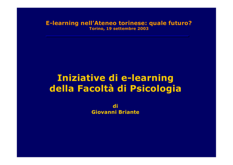 E-learning nell’Ateneo torinese: quale futuro? Torino, 19 settembre 2003 Iniziative di e-learning della Facoltà di Psicologia di Giovanni Briante Facoltà di Psicologia settori disciplinari interessati Î Psicologia giuridica Î Psicologia generale Î Neuroscienze Î Psicologia del lavoro Î Psicologia dello sviluppo Î Psicometria Facoltà di Psicologia tipologia progetti Î Sostegno alla didattica Î Orientamento Î Classe virtuale Î Web corso di laurea Î Laboratorio multimediale Î Formazione docenti e tutor Facoltà di Psicologia progetti realizzati o da completare Î “Deontologia professionale” Î Processi di base in psicologia Î Sito di Neuropsicologia Î Web corso di laurea… Î Laboratorio multimediale Î Formazione docenti e tutor Deontologia psicologica on-line http://ecdl.cisi.unito.it/area2/index2.htm resp. resp. scientifico scientifico dott.ssa dott.ssa Georgia Georgia Zara Zara resp. resp. tecnico tecnico dott. dott. Fabio Fabio Cappello Cappello Obiettivo: creare un corso a cerniera tra la psicologia accademica, la professione e la comunità, e permettere una concreta divulgazione del Codice Deontologico degli Psicologi Italiani (CDPI) a tutti gli studenti di psicologia, futuri psicologi. Deontologia psicologica on-line http://ecdl.cisi.unito.it/area2/index2.htm Il corso è composto da oltre 400 file, organizzati in circa 30 cartelle; è strutturato secondo un percorso didattico (moduli e unità didattiche) per facilitare allo studente una comprensione coerente e funzionale del corpus deontologico. I processi di base in psicologia responsabile prof. Dario Galati Î Sensazione Î Percezione Î Emozione Sensazione Î Soglie sensoriali Î Psicofisica Percezione Î Organizzazione percettiva Î Illusioni ottiche Emozione Î Emozione, adattamento e comunicazione Î Emozione e conoscenza Sito dei corsi di Neuropsicologia e Psicologia fisiologica resp. resp. scientifico scientifico dott. dott. Marco Marco Neppi Neppi Modona Modona resp. resp. tecnico tecnico dott.ssa dott.ssa Daniela Daniela Massimo Massimo Il sito di tipo informativo-distributivo contiene: Î materiali delle lezioni (Power Point) Î articoli scientifici di approfondimento (pdf) Î simulatore prova esame scritto (test online) Sito dei corsi di Neuropsicologia e Psicologia fisiologica Îlink a laboratori di neuropsicologia italiani Îlink a siti o riviste di interesse neuropsicologico Î descrizione aree di interesse di ricerca dei docenti CDL in STP dello Sviluppo e dell’educazione resp. resp. scientifico scientifico prof.ssa prof.ssa Paola Paola Molina Molina Î implementazione del sito web Î sito studenti costruito dai medesimi Î accesso on-line ai laboratori Î tutoraggio on-line Struttura pagina web del Corso di Laurea in S.T.P. dello Sviluppo e dell’educazione Corso di laurea in STP dello sviluppo e dell'educazione Tutor Pagine docenti M-PSI/03 ... ... ... ... Punto Informativo Pagina studenti Laboratori didattici Sito degli studenti Sito del tutor Î Attivazione a.a. 2002/2003 Corso di laurea a distanza in Scienze e tecniche psicologiche: organizzazione e lavoro Î Costituzione del Polo tecnologico Î Formazione tutor a distanza