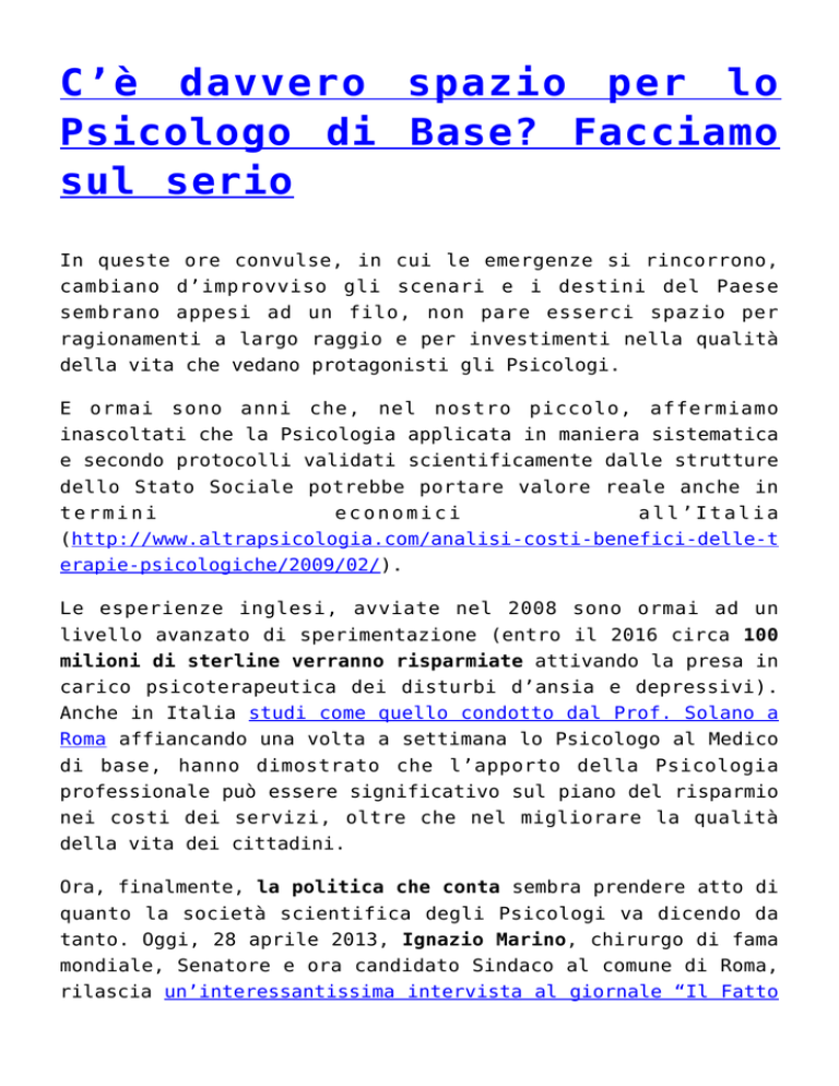 C’è davvero spazio per lo Psicologo di Base? Facciamo sul serio In queste ore convulse, in cui le emergenze si rincorrono, cambiano d’improvviso gli scenari e i destini del Paese sembrano appesi ad un filo, non pare esserci spazio per ragionamenti a largo raggio e per investimenti nella qualità della vita che vedano protagonisti gli Psicologi. E ormai sono anni che, nel nostro piccolo, affermiamo inascoltati che la Psicologia applicata in maniera sistematica e secondo protocolli validati scientificamente dalle strutture dello Stato Sociale potrebbe portare valore reale anche in termini economici all’Italia (http://www.altrapsicologia.com/analisi-costi-benefici-delle-t erapie-psicologiche/2009/02/). Le esperienze inglesi, avviate nel 2008 sono ormai ad un livello avanzato di sperimentazione (entro il 2016 circa 100 milioni di sterline verranno risparmiate attivando la presa in carico psicoterapeutica dei disturbi d’ansia e depressivi). Anche in Italia studi come quello condotto dal Prof. Solano a Roma affiancando una volta a settimana lo Psicologo al Medico di base, hanno dimostrato che l’apporto della Psicologia professionale può essere significativo sul piano del risparmio nei costi dei servizi, oltre che nel migliorare la qualità della vita dei cittadini. Ora, finalmente, la politica che conta sembra prendere atto di quanto la società scientifica degli Psicologi va dicendo da tanto. Oggi, 28 aprile 2013, Ignazio Marino, chirurgo di fama mondiale, Senatore e ora candidato Sindaco al comune di Roma, rilascia un’interessantissima intervista al giornale “Il Fatto Quotidiano“ in cui afferma: “L’OMS ha la depressione sarà la seconda causa dopo le cardiopatie. Gli studi del diventare dei veri e propri centri di la presenza dello psicologo almeno una dichiarato che nel 2020 di disabilità al mondo medico di base devono salute territoriale con volta a settimana”. E ancora: ” … credo che debba esserci un’attenzione agli stili di vita che possono danneggiare la nostra salute. Dobbiamo spostare l’attenzione dalla malattia alla persona”. Ma soprattutto Marino afferma: “Voglio anche suggerire alle autorità competenti l’introduzione di nuovi strumenti come lo Psicologo di base. Tanti pazienti si rivolgono al medico di famiglia per disturbi legati alla salute mentale (24% circa, tra depressione e disturbi d’ansia). … dal 2002 al 2010, è raddoppiata la prescrizione di antidepressivi. Per questo ritengo importante un’integrazione tra Medici e Psicologi”. E, riferendosi alle sperimentazioni del prof. Solano: “La sperimentazione ha dimostrato come questa integrazione produca un risparmio fino al 17% della spesa farmaceutica, che si traduce in cifre superiori ai 50mila euro l’anno per studio medico. I medici di base non hanno una preparazione specialistica per riconoscere e trattare adeguatamente un paziente colpito da depressione o da altre forme di disagio psichico e sociale. Ecco perché diventa importante la figura della presenza dello psicologo nello studio del medico di base almeno una volta alla settimana. Questa ricerca ha dimostrato non solo l’efficacia ma anche il gradimento della maggior parte dei pazienti. Un dato interessante è che da una parte si è evitato un incremento di richieste ai servizi specialistici, poiché il disagio viene intercettato e gestito per tempo dallo Psicologo in sinergia con il Medico. Dall’altro canto, laddove è necessario, si facilita invece l’accesso alla Psicoterapia evitando che il disagio venga trattato esclusivamente con farmaci che spesso possono non essere la soluzione al problema e fanno aumentare il costo della spesa sanitaria”. Detto così (e da un medico, poi) sembra che si profili finalmente la rivincita della Psicologia e che lo Psicologo di Base, di cui la nostra comunità professionale dibatte sostanzialmente a vuoto da almeno dieci anni, possa prestissimo diventare realtà. …. Certo, ci sarebbe piaciuto che un’intervista di questo tenore la rilasciasse uno dei Ministri neo insediati. Marino è persona di estrema rettitudine e linearità ma anche da Sindaco di Roma, però, non avrà il potere di attivare (se non in minime declinazioni sperimentali) una funzione innovativa come l’affiancamento degli Psicologi ai Medici di Base, anche se in questa innovazione crede e punta. Non vorremmo che anche gli Psicologi romani si trovassero proiettati all’interno del grande mulinello elettorale che continuamente, in Italia, monta e distrugge illusioni. Al dott. Marino, Senatore della Repubblica (seppur dimissionario in quanto candidato Sindaco di Roma) e dirigente nazionale di uno dei partiti che si accingono a governare la nazione, proponiamo, allora, di sostenere una proposta di legge organica che “conti alla mano” attivi il ricorso ad interventi psicologici professionali ad integrazione e supporto di quelli di medicina di base garantendo un risparmio cospicuo e calcolabile al Servizio Sanitario Nazionale. L’intera comunità degli Psicologi sarebbe pronta a dare il suo contributo scientifico e il necessario supporto all’iniziativa. Di certo AltraPsicologia sarebbe in prima linea. Felice D. Torricelli