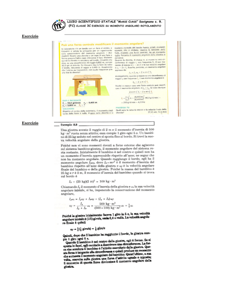 LICEO SCIENTIFICO STATALE “MARIE CURIE” Savignano s. R. (FC) CLASSE 3C ESERCIZI SU MOMENTO ANGOLARE-ROTOLAMENTO Esercizio Esercizio Esercizio Dati esercizio: I1=5,0 Kg·m2 I2=10 Kg·m2 ωi =10giri/sec Esercizio Un tuffatore esegue un triplo salto mortale durante il volo verso la piscina di durata t = 2,00sec. Durante il primo e ultimo quarto di giro il corpo del tuffatore è completamente disteso con momento d'inerzia I1=20,0 Kg·m2 . Nel tratto intermedio è in posizione raccolta con I2 = 5,00 Kg·m2. Determinare ω1 e ω2. [ω1=0,563rad/sec; ω2=2,25rad/sec] Esercizio Uno studente tiene con la mano una ruota di bicicletta che gira intorno a un asse verticale, il momento d’inerzia della ruota è Iruota = 1,5Kg·m2 e la velocità angolare è ωruota = 4,0giri/sec. Lo studente capovolge la ruota provocando una rotazione di se stesso attorno all’asse dello sgabello. Il momento d’inerzia del sistema sgabello+studente+ruota è I0 = 7,0 Kg·m2. Calcolare la velocità angolare del sistema sgabello+studente+ruota. [1,7giri/sec] Esercizio Un cilindro di massa pari a 2,4Kg e raggio 0,45m ruota attorno al proprio asse con velocità angolare pari a 3,2 rad/sec. Determina il momento angolare del cilindro. [0,78Kg·m2/sec] Esercizio Jacopo è seduto su uno sgabello e può ruotare tenendo in mano due pesetti. Inizialmente il sistema ha velocità angolare ωi = 1,0giri/sec e momento d’inerzia Ii = 10Kg·m2. Successivamente Jacopo avvicina le braccia al corpo e il suo momento d’inerzia diventa Ii/2. Quale sarà la sua velocità angolare ωf ? Esercizio Una sfera omogenea di raggio R e massa m, un disco omogeneo e un cilindro cavo (assimilabile ad un anello) aventi la stessa massa m e lo stesso raggio R rotolano su un piano inclinato di 12° rispetto al piano orizzontale per un tratto di 2,5m. Determinare le velocità dei centri di massa dei tre corpi quando giungono alla base del piano inclinato. Qual è la percentuale di energia cinetica rotazionale e traslazionale dei tre oggetti in fondo al piano? [2,7m/sec; 2,6m/sec; 2,3m/sec] Problema Un disco di massa M=0,5Kg, raggio R=20 cm, rotola su un pavimento orizzontale ed il suo centro ha velocità v=2m/s. Determinare l’energia cinetica del disco e la velocità angolare intorno all’asse baricentrale perpendicolare al piano del disco. Discussione del problema Indicata con VCM la velocità del centro del disco (centro di massa) ed il modulo della velocità angolare con cui il disco ruota intorno al suo centro, l’energia cinetica è espressa Poiché per le espressioni del momento d’inerzia I rispetto all'asse baricentrale perpendicolare al piano del disco e della velocità angolare sono rispettivamente: , si ha: Sostituendo i valori delle grandezze note troviamo l’energia del disco. Il valore richiesto per la velocità angolare è Osservazione Vogliamo cogliere l’opportunità per far notare che quando un corpo è in moto rototraslatorio l’energia cinetica immagazzinata sotto forma rotazionale può rappresentare una parte considerevole dell’energia meccanica complessiva. Nel caso in esame l’energia rotazionale rappresenta il 50% dell’energia cinetica di traslazione ed un terzo dell’energia meccanica complessiva: il risultato si deduce considerando il rapporto Osserviamo ancora che se la massa del disco non è distribuita omogeneamente, ma si trova per la gran parte localizzata nella zona periferica(1), allora il momento d’inerzia, rispetto ad un disco omogeneo avente lo stesso raggio e la stessa massa, è maggiore e l’energia meccanica rotazionale rappresenterà una percentuale ancora maggiore. Questa osservazione dovrebbe suggerire di non trascurare nella risoluzione dei problemi coinvolgenti corpi in moto rototraslatorio la parte di energia meccanica disponibile in forma rotazionale. (11) Si pensi ad una ruota dotata di raggi robusti ma la cui massa rappresenti solo una piccola frazione della massa totale, distribuita per la gran parte nella zona periferica (anello) Un uomo si muove su una piattaforma rotante (Conservazione del momento angolare) Problema Un uomo di massa 70Kg si trova sul bordo di una piattaforma circolare di raggio R=2m e di massa M=180Kg. Il sistema ruota con velocità di 20 giri/min. Ad un certo punto l’uomo decide di avvicinarsi di 50cm al centro della piattaforma. Determinare la nuova velocità angolare del sistema rotante e la variazione di energia cinetica. Soluzione Durante il moto dell’uomo sulla piattaforma il sistema uomo+piattaforma è isolato e quindi si conserva il momento angolare(1[1]). Infatti, ricordiamo che indicando con all’asse di rotazione sussiste la relazione M est L t e non essendoci forze esterne agenti sul sistema risulta M est 0 il momento angolare del sistema rispetto per cui si ha anche L 0 cioè L costante Ricordiamo inoltre che in un sistema isolato le forze si presentano a coppie, cioè possono essere presenti a due a due ed hanno moduli uguali, sono parallele e versi opposti. Per questo motivo il momento risultante delle forze interne al sistema, calcolato rispetto ad un punto qualsiasi O, nonché rispetto ad un asse qualsiasi, è sempre nullo. Ciò premesso, ai fini della risoluzione del problema in esame, ricordiamo la relazione esistente tra momento d’inerzia I del corpo, velocità angolare all’asse di rotazione: di rotazione e momento angolare rispetto Indichiamo con I1 e I2 rispettivamente i valori del momento d’inerzia e della velocità angolare nelle due posizioni: 1 posizione iniziale, l’uomo è sul bordo della piattaforma; 2 posizione finale, l’uomo si è avvicinato di 50 cm al centro della piattaforma. Dal principio di conservazione del momento angolare si deduce l’uguaglianza: I11 = I22 da cui Calcolo dei momenti d’inerzia Il momento d’inerzia del sistema meccanico nei due casi è dato dalla somma del momento d’inerzia del disco con il momento d’inerzia dell’uomo rispetto all’asse. Ora, non avendo informazioni diverse sulla piat