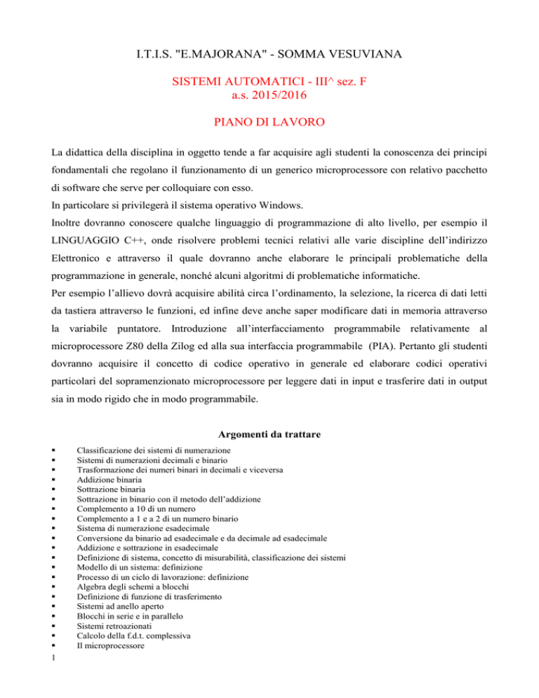 I.T.I.S. "E.MAJORANA" - SOMMA VESUVIANA SISTEMI AUTOMATICI - III^ sez. F a.s. 2015/2016 PIANO DI LAVORO La didattica della disciplina in oggetto tende a far acquisire agli studenti la conoscenza dei principi fondamentali che regolano il funzionamento di un generico microprocessore con relativo pacchetto di software che serve per colloquiare con esso. In particolare si privilegerà il sistema operativo Windows. Inoltre dovranno conoscere qualche linguaggio di programmazione di alto livello, per esempio il LINGUAGGIO C++, onde risolvere problemi tecnici relativi alle varie discipline dell’indirizzo Elettronico e attraverso il quale dovranno anche elaborare le principali problematiche della programmazione in generale, nonché alcuni algoritmi di problematiche informatiche. Per esempio l’allievo dovrà acquisire abilità circa l’ordinamento, la selezione, la ricerca di dati letti da tastiera attraverso le funzioni, ed infine deve anche saper modificare dati in memoria attraverso la variabile puntatore. Introduzione all’interfacciamento programmabile relativamente al microprocessore Z80 della Zilog ed alla sua interfaccia programmabile (PIA). Pertanto gli studenti dovranno acquisire il concetto di codice operativo in generale ed elaborare codici operativi particolari del sopramenzionato microprocessore per leggere dati in input e trasferire dati in output sia in modo rigido che in modo programmabile. Argomenti da trattare 1 Classificazione dei sistemi di numerazione Sistemi di numerazioni decimali e binario Trasformazione dei numeri binari in decimali e viceversa Addizione binaria Sottrazione binaria Sottrazione in binario con il metodo dell’addizione Complemento a 10 di un numero Complemento a 1 e a 2 di un numero binario Sistema di numerazione esadecimale Conversione da binario ad esadecimale e da decimale ad esadecimale Addizione e sottrazione in esadecimale Definizione di sistema, concetto di misurabilità, classificazione dei sistemi Modello di un sistema: definizione Processo di un ciclo di lavorazione: definizione Algebra degli schemi a blocchi Definizione di funzione di trasferimento Sistemi ad anello aperto Blocchi in serie e in parallelo Sistemi retroazionati Calcolo della f.d.t. complessiva Il microprocessore Sistemi in logica cablata e in logica programmata Struttura a bus di un sistema programmabile Architettura del microprocessore Bus dati, bus indirizzi, bus controllo Memorie a semiconduttore Capacità, tempo di mantenimento, organizzazione ed indirizzamento di una memoria Schema di principio di un chip di memoria a solo lettura (Rom) ed lettura e scrittura (Ram) Il diodo: reale ed ideale Caratteristica del diodo, polarizzazione diretta ed inversa del diodo Struttura interna a diodi di una memoria ROM Definizione di algoritmo Rappresentazione degli algoritmi: diagrammi di flusso, struttura fondamentale LABORATORIO Introduzione ai linguaggi di programmazione Struttura di un primo programma di linguaggio C e C++ Scrittura e d esecuzione di un programma di benvenuto in C e C++ Dichiarazione delle variabile e assegnamento delle stesse Calcolare l’Area ed il perimetro di un quadrato e di u triangolo Dichiarazione del tipo: short, long e double Le costanti nel linguaggio C e C++ Linguaggio C, immissione ed emissione dati Definizione di Algoritmo Diagrammi di flusso: struttura sequenziale, di selezione ed iterativa Struttura di selezione if, ed if…else Calcolo delle radici di un equazione di 2° grado utilizzando il linguaggio C++ Ciclo While: diagramma di flusso e programma TABELLINA Ciclo Do …While Differenza tra i diagrammi di flusso del ciclo While e Do While Tutti gli argomenti trattati saranno sperimentati con la strumentazione esistente in laboratorio e saranno documentati, dal punto di vista pratico, con l'ausilio della consultazione di manuali specifici. I Docenti Prof. Barone Bruno, Sorrentino Salvatore _____________________________ 2