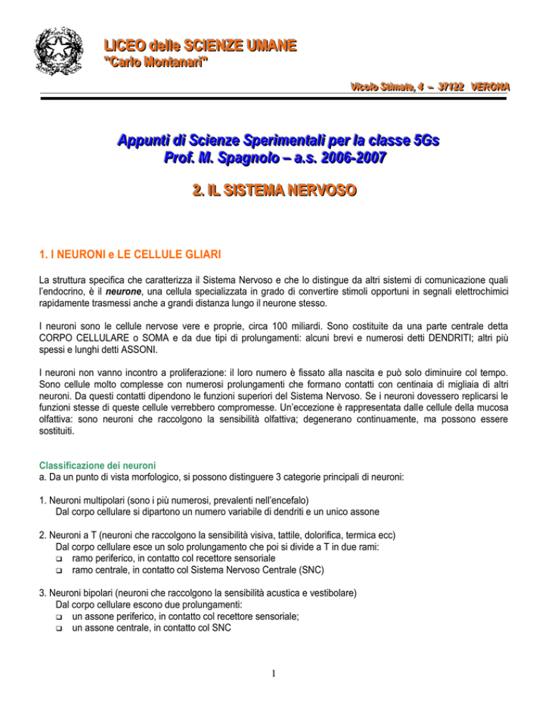 LLIICCEEO O ddeellllee SSCCIIEENNZZEE UUM MAANNEE ""CCaarrlloo M Moonnttaannaarrii"" VViiccoolloo SSttiim maattee,, 44 –– 3377112222 VVEERROONNAA AAppppuunnttii ddii SScciieennzzee SSppeerriim meennttaallii ppeerr llaa ccllaassssee 55G Gss PPrrooff.. M M.. SSppaaggnnoolloo –– aa..ss.. 22000066--22000077 22.. IILL SSIISSTTEEM MAA NNEERRVVO OSSO O 1. I NEURONI e LE CELLULE GLIARI La struttura specifica che caratterizza il Sistema Nervoso e che lo distingue da altri sistemi di comunicazione quali l’endocrino, è il neurone, una cellula specializzata in grado di convertire stimoli opportuni in segnali elettrochimici rapidamente trasmessi anche a grandi distanza lungo il neurone stesso. I neuroni sono le cellule nervose vere e proprie, circa 100 miliardi. Sono costituite da una parte centrale detta CORPO CELLULARE o SOMA e da due tipi di prolungamenti: alcuni brevi e numerosi detti DENDRITI; altri più spessi e lunghi detti ASSONI. I neuroni non vanno incontro a proliferazione: il loro numero è fissato alla nascita e può solo diminuire col tempo. Sono cellule molto complesse con numerosi prolungamenti che formano contatti con centinaia di migliaia di altri neuroni. Da questi contatti dipendono le funzioni superiori del Sistema Nervoso. Se i neuroni dovessero replicarsi le funzioni stesse di queste cellule verrebbero compromesse. Un’eccezione è rappresentata dalle cellule della mucosa olfattiva: sono neuroni che raccolgono la sensibilità olfattiva; degenerano continuamente, ma possono essere sostituiti. Classificazione dei neuroni a. Da un punto di vista morfologico, si possono distinguere 3 categorie principali di neuroni: 1. Neuroni multipolari (sono i più numerosi, prevalenti nell’encefalo) Dal corpo cellulare si dipartono un numero variabile di dendriti e un unico assone 2. Neuroni a T (neuroni che raccolgono la sensibilità visiva, tattile, dolorifica, termica ecc) Dal corpo cellulare esce un solo prolungamento che poi si divide a T in due rami: ramo periferico, in contatto col recettore sensoriale ramo centrale, in contatto col Sistema Nervoso Centrale (SNC) 3. Neuroni bipolari (neuroni che raccolgono la sensibilità acustica e vestibolare) Dal corpo cellulare escono due prolungamenti: un assone periferico, in contatto col recettore sensoriale; un assone centrale, in contatto col SNC 1 b. Da un punto di vista funzionale, si possono distinguere 4 tipi di neuroni: 1. Neuroni sensoriali: ricevono le informazioni sensoriali e le trasmettono al SNC (conduzione afferente, centripeta) 2. Interneuroni: trasmettono segnali all’interno di regioni localizzate nel SNC 3. Neuroni di associazione: trasmettono segnali da una regione a un’altra del SNC 4. Neuroni motori: mandano impulsi dal SNC agli organi effettori come i muscoli o le ghiandole (conduzione efferente, centrifuga). Funzioni dei neuroni I neuroni ricevono, generano e trasmettono impulsi nervosi. Gli impulsi nervosi possono essere trasmessi da un neurone: ad altri NEURONI a cellule non nervose dette EFFETTORI - cellule muscolari: rispondono contraendosi o rilassandosi - cellule ghiandolari endocrine/esocrine: rispondono con la secrezione I contatti fra neuroni o fra neuroni ed effettori si chiamano SINAPSI: (neurone-neurone; neurone-fibra muscolare; neurone-cellula secernente). Ogni neurone può stabilire sinapsi con centinaia di migliaia di altri cellule. Caratteristiche citologiche del neurone Corpo cellulare Ricco di Reticolo Endoplasmatico Ruvido, indice di un’elevata attività di sintesi proteica (nei neuroni vengono prodotti i neurotrasmettitori) Assone Ricco di MITOCONDRI, soprattutto a livello terminale, ad indicare un’intensa respirazione cellulare. Nel terminale assonico sono presenti numerosissime VESCICOLE SINAPTICHE che contengono i neurotrasmettitori. Può essere rivestito dalle CELLULE GLIARI, le altre cellule del Sistema Nervoso. Il rivestimento dell’assone prende il nome di GUAINA MIELINICA e forma attorno ad esso dei manicotti ricchi di lipidi. La guaina mielinica di ciascun assone non è continua ma presenta delle interruzioni fra un manicotto e quello successivo dette NODI DI RANVIER. Il rivestimento mielinico può estendersi fino al BOTTONE SINAPTICO. Come vedremo, il rivestimento mielinico accelera la conduzione dell’impulso nervoso lungo gli assoni. Poiché il rivestimento mielinico svolge un ruolo essenziale nel sistema nervoso, il suo deterioramento, che si osserva per esempio nella sclerosi multipla, può dare origine a gravi difetti di conduzione degli impulsi nervosi diretti o provenienti dal cervello. Le cellule gliari Sono le altre cellule del Sistema Nervoso dieci volte più numerose dei neuroni. Non sono in grado di generare impulsi elettrici ma svolgono comunque diverse mansioni per il corretto funzionamento del sistema nervoso. I neuroni non entrano mai in contatto diretto con i vasi sanguigni: le cellule gliari pertanto servono a ISOLARE, SOSTENERE e a FORNIRE NUTRIMENTO ai neuroni stessi. Ogni cellula gliare è in contatto da un lato con i capillari sanguigni e dall’altro con i neuroni. Le cellule gliari pertanto formano una specie di barriera fra sistema nervoso e sangue detta BARRIERA EMATOENCEFALICA. 2. IL POTENZIALE DI RIPOSO Per comprendere come si generi l’impulso nervoso, è necessario fare riferimento alla struttura della membrana cellulare e alla differente composizione chimica dell’ambiente intra- ed extracellulare delle cellule nervose. 2 E’ stato dimostrato che in una cellula nervosa a riposo esiste una differenza di potenziale elettrico fra la parte interna delle membrana plasmatica, carica negativamente, e quella esterna, carica positivamente. Tale differenza è dovuta ad una diversa distribuzione degli ioni ai due lati della membrana. Le molecole proteiche cariche negativamente (anioni, indicati con A ) e gli ioni K+ si trovano maggiormente concentrati all’interno della cellula, mentre gli ioni Na+ e Cl sono più abbondanti nel liquido extracellular