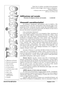 Ebraismo La religione del popolo ebraico si differenzia da quella delle altre civiltà dell’area della «mezzaluna fertile» per il suo forte monoteismo. Capostipite è Abramo (1800 a.C. ca.), invitato da Dio ad andare verso la terra di Canaan (in parte l’attuale Stato di Israele). L’ebraismo si fonda sulla fede di un unico Dio che ha liberato il popolo di Israele (in origine il nome dato da Dio a Giacobbe e alla sua discendenza) dalla servitù in terra d’Egitto. Sotto la guida di Mosè, Dio porta in salvo il suo popolo e sul monte Sinai stipula con lui un’alleanza speciale, basata sui Comandamenti o Legge (Torah). Il libro sacro di riferimento è la Bibbia ebraica, le cui parti più antiche risalgono al X sec. a.C., chiamata anche TaNaKh, dalle tre lettere iniziali delle sue tre parti principali (Torah = insegnamento, legge; Nebiim = profeti; Ketubim = scritti). I cristiani la chiamano Antico Testamento per distinguerla dal Nuovo Testamento. Gli ebrei sparsi per il mondo sono circa 15 milioni, divisi principalmente in ebrei ortodossi, conservatori e liberali. La maggior parte vive in Israele e nel Nord America. ■ DATI ESSENZIALI: NOME: l’etimologia di ebreo è incerta, forse da «Eber», discendente di Sem (Genesi 10,21-25). FONDATORE: più che di un fondatore vero e proprio si può parlare di un «capostipite»: Abramo, verso il 1800 a.C., su comando di Dio, lascia la propria terra per andare verso la terra promessa da Dio (Canaan). In lui, nei patriarchi e nei profeti che seguiranno si riconoscerà Israele, ma soprattutto in Dio, l’unico vero «fondatore» del popolo ebraico. Nel suo nome, Mosè guiderà il popolo dalla servitù dell’Egitto verso la libertà (esodo, 1250 circa a.C.), affidandogli la Torah o Legge. LIBRI SACRI: la Bibbia («i libri»), suddivisa in tre parti: Torah (i primi 5 libri), i Profeti e gli Scritti. Vi è poi la Mishnah (interpretazione orale della Torah), scritta dal 100 a.C. al 70 d.C. e il Talmud, una grande raccolta scritta, che si basa sulla Mishnah e la Ghemarah (registrazione delle discussioni dei rabbini). Del Talmud esistono due versioni: palestinese (400 d.C.) e babilonese (500 d.C.). CREDO: alla base di tutto c’è la fede in Dio creatore, unico ed eterno; l’obbligo di servire e rispettare la sua Legge, rivelata al profeta Mosè e codificata nella Torah. PRINCIPI MORALI: sono sintetizzati nelle dieci Parole (Decalogo o dieci Comandamenti) e nelle 613 regole (mizwot) che l’ebreo praticante deve osservare. Molte di queste regole riguardano l’alimentazione: il cibo dev’essere puro (kasher). CITTÀ SANTA: Gerusalemme (Sion), dove c’era il Tempio di Salomone che custodiva l’Arca dell’Alleanza. Il Tempio fu distrutto da Nabucodonosor nel 586 a.C. Erode il grande ricostruì il Secondo Tempio, nel I sec. a.C., ma fu raso al suolo dai romani nel 70 d.C. Di questo tempio rimangono le grandi pietre del Muro del pianto. RITI E FESTIVITÀ: il giorno sacro settimanale è lo Shabbàt (il sabato); le feste principali: Chanukkah (festa delle luci); Pèsach (pasqua ebraica) in memoria della liberazione dall’Egitto; Rosh Hashanah (capodanno); Yom Kippùr (il giorno del perdono); Sukkòth (festa delle capanne) in ricordo della traversata del deserto. RAMI O SUDDIVISIONI: sefarditi, gli ebrei provenienti dalla Spagna (in ebraico Sefard) e sparsi sulle coste del Mediterraneo; aschenaziti, gli ebrei provenienti dalla Germania (in ebraico Ashkenaz) e spintisi nel Medioevo verso l’Europa orientale (Polonia, Russia); parlano lo jiddish.