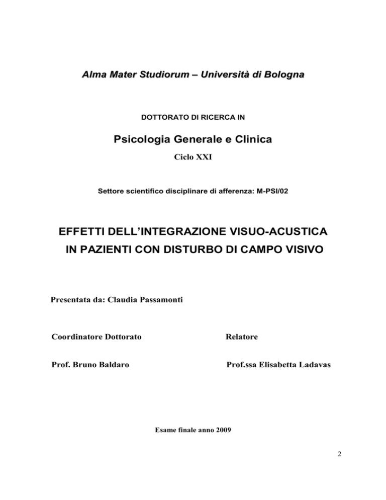 Alma Mater Studiorum – Università di Bologna DOTTORATO DI RICERCA IN Psicologia Generale e Clinica Ciclo XXI Settore scientifico disciplinare di afferenza: M-PSI/02 EFFETTI DELL’INTEGRAZIONE VISUO-ACUSTICA IN PAZIENTI CON DISTURBO DI CAMPO VISIVO Presentata da: Claudia Passamonti Coordinatore Dottorato Relatore Prof. Bruno Baldaro Prof.ssa Elisabetta Ladavas Esame finale anno 2009 2 INDICE INTRODUZIONE………………………………………………………………………………….. 5 PARTE I Un approccio multisensoriale allo studio dei Disturbi di Campo Visivo: basi neurali, teorie e metodi Capitolo I- Un sistema visuo-acustico integrato per l’orientamento spaziale………………….. 11 1.1- Convergenza multisensoriale: basi neurali e meccanismi funzionali………………………. 12 1.2- Effetti dell’integrazione multisensoriale sull’orientamento spaziale………………………. 23 1.3- Integrazione multisensoriale e unisensoriale……………………………………………….. 31 1.4- Un modello probabilistico per lo studio dei processi integrativi………………………….... 38 Capitolo II- I Disturbi di Campo Visivo: un approccio multisensoriale ………………………. 43 2.1- I Disturbi di Campo Visivo (DCV): aspetti anatomo-lesionali e comportamentali……….. 43 2.2- DCV e blindsight: ipotesi eziologiche e paradigmi di studio……………………………… 46 2.3- Integrazione visuo-acustica in pazienti con DCV: il ruolo della via collicolo-extrastriata.. 51 Capitolo III- La riabilitazione dei Disturbi di Campo Visivo: report dei trials clinici………… 55 3.1- Introduzione………………………………………………………………………………..... 55 3.1- Metodo………………………………………………………………………………………. 57 3.1- Risultati……………………………………………………………………………………… 57 3.1- Discussione………………………………………………………………………………….. 62 Considerazioni riassuntive………………………………………………………………………….. 65 3 PARTE II Effetti dell’integrazione visuo-acustica in pazienti con Disturbo di Campo Visivo: studi sperimentali Capitolo IV- Esperimento 1. Integrazione Multisensoriale ed Unisensoriale nell’ Emianopsia: effetti immediati sull’orientamento spaziale 4.1- Introduzione……………………………………………………………………………….. 69 4.2- Metodo…………………………………………………………………………………….. 72 4.3- Risultati……………………………………………………………………………………. 77 4.4- Discussione………………………………………………………………………………… 83 Capitolo V- Esperimento 2. Apprendimento percettivo cross-modale in pazienti con emianopsia e neglect: effetti a breve termine sull’orientamento spaziale 5.1- Introduzione……………………………………………………………………………….. 87 5.2- Metodo…………………………………………………………………………………….. 89 5.3- Risultati Esperimento 2a…………………………………………………………………... 96 Risultati Esperimento 2b…………………………………………………………………... 99 5.4- Discussione………………………………………………………………………………… 102 Capitolo VI- Esperimento 3. Effetti a lungo termine di un training Visuo-Acustico sul pattern oculomotorio di pazienti con emianopsia 6.1- Introduzione………………………………………………………………………………. 107 6.2- Metodo……………………………………………………………………………………. 110 6.3- Risultati…………………………………………………………………………………… 116 6.4- Discussione……………………………………………………………………………….. 125 CONCLUSIONI……...………………………………………………………………………….. 131 Considerazioni finali…………………………………………………………………………….. 139 BIBLIOGRAFIA………………………………………………………………………………… 141 4 INTRODUZIONE La percezione unitaria della realtà è il risultato di un complesso processo di integrazione delle informazioni provenienti da differenti canali sensoriali. La capacità del sistema nervoso centrale di utilizzare sinergisticamente queste multiple sorgenti sensoriali è definita Integrazione Multisensoriale (Stein & Meredith, 1993). Negli ultimi anni, lo studio dei processi d’integrazione multisensoriale è stato uno degli argomenti più proficuamente investigati nell’ambito delle Neuroscienze. Numerose evidenze sperimentali provenienti da studi comportamentali (Bertelson & De Gelder, 2004; Spence & Driver, 2004), neurofisiologici (Stein et al., 2004), elettrofisiologici (Eimer, 2004), e di neuroimmagine funzionale (Macaluso & Driver, 2005; Calvert et al., 2004a) hanno contribuito ad individuare i processi cognitivi e le aree cerebrali responsabili dei fenomeni integrativi. Tuttavia, l’estensione di queste conoscenze in ambito clinico sono divenute solo recentemente oggetto di interesse (Làdavas, 2008). Un danno alla via retino-genicolo-striata determina un deficit nella capacità di elaborare consapevolmente stimoli visivi in una metà, o quadrante, del campo visivo, e concomitanti difficoltà di esplorazione spaziale e lettura (Zihl, 1995). Nonostante l’assenza di esperienza visiva consapevole, i pazienti con Disturbo di Campo Visivo (DCV) possono esibire un complesso di