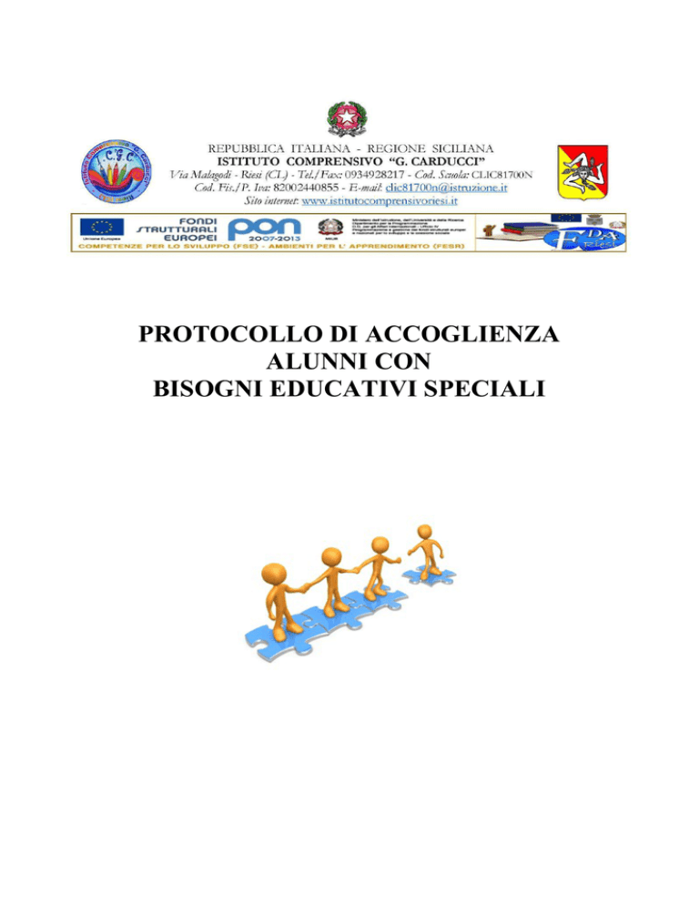 PROTOCOLLO DI ACCOGLIENZA ALUNNI CON BISOGNI EDUCATIVI SPECIALI PROTOCOLLO DI ACCOGLIENZA ALUNNI CON BISOGNI EDUCATIVI SPECIALI 1. PREMESSA Accogliere gli alunni con Bisogni Educativi Speciali (alunni con disabilità, alunni con Disturbi Specifici di Apprendimento, alunni con problematiche e disagio scolastico determinato da fattori ambientali), significa fare in modo che essi siano parte integrante del contesto scolastico, assieme agli altri alunni, alla pari degli altri alunni, senza discriminazione alcuna; significa assicurare a tutti il diritto allo studio e al successo scolastico. In tale prospettiva, è necessario da parte della scuola non solo un impegno forte di conoscenza e di valorizzazione della realtà personale, umana, sociale e familiare degli alunni con Bisogni Educativi Speciali ma anche e soprattutto un impegno di promozione della loro formazione attraverso la realizzazione di un’organizzazione educativa e didattica personalizzata, sia negli obiettivi sia nei percorsi formativi che nelle strategie didattiche. Il Protocollo di accoglienza è uno strumento di inclusione all’interno di ogni istituzione scolastica: permette di definire in modo chiaro e sistematico tutte le azioni intraprese dalla scuola nonché le funzioni e i ruoli di ogni agente, dal Dirigente Scolastico alla famiglia, dagli uffici di segreteria ad ogni singolo docente, al Referente BES/DSA di Istituto Esso va inteso come un’azione di rafforzamento delle competenze gestionali ed organizzative dell’ istituto mediante la formalizzazione di alcune azioni a partire dalla consegna della diagnosi presso gli uffici di segreteria fino alla redazione, al monitoraggio e alla valutazione finale del PDP/PEI. La produzione e la condivisione del protocollo di accoglienza, insieme ad altri documenti della scuola, quali il piano triennale dell’offerta formativa, il piano annuale per l’inclusione e i diversi protocolli d’intesa con le agenzie del territorio, permette di incrementare e valorizzare la competenza gestionale e organizzativa della stessa Istituzione Scolastica. Il Protocollo di Accoglienza si prefigge di delineare prassi condivise di carattere: •amministrativo - burocratiche (acquisizione della documentazione necessaria e verifica della completezza del fascicolo personale degli alunni); •comunicativo - relazionali (prima conoscenza dell’alunno e accoglienza all’interno della nuova scuola); •educativo – didattiche (assegnazione alla classe, accoglienza, coinvolgimento dell’equipe pedagogica e didattica); •sociali (rapporti e collaborazione della scuola con la famiglia e il territorio). 1.1 DESTINATARI L’idea principale di questo documento operativo, funzionale all’accoglienza ed inclusione degli alunni con BES e con DSA, nasce dalla volontà di rendere concrete nella consuetudine didattica di ogni giorno queste indicazioni e di essere pertanto una guida di informazione ed azione per docenti e genitori, in merito all’inclusione ed integrazione di alunni e studenti in situazione di difficoltà, al fine di realizzare pienamente il diritto all’apprendimento. Destinatari, dunque, del protocollo di accoglienza sono tutti gli agenti dell’Istituzione scolastica, nello specifico: la famiglia, il personale di segreteria, i docenti, il Dirigente. Sono altresì destinatari tutti i soggetti che operano nel percorso formativo dell’alunno anche all’esterno dell’Istituzione Scolastica: rappresentanti dell’Asp, educatori, rappresentanti dei Servizi Sociali, insegnanti di supporto nel doposcuola, terapisti ecc. 1.2 FINALITA’ Al fine di un’integrazione scolastica e sociale ottimale degli alunni con Bisogni Educativi Speciali, il nostro Istituto attraverso il Protocollo di Accoglienza intende raggiungere le seguenti finalità: definire pratiche condivise tra tutto il personale del nostro Istituto; favorire l’accoglienza e l’integrazione degli alunni con Bisogni Educativi Speciali attraverso percorsi comuni, individualizzati o personalizzati che fanno coesistere socializzazione ed apprendimento; elaborare tre aspetti determinanti del processo di formazione: accoglienza, integrazione, orientamento; informare adeguatamente il personale coinvolto; condividere e dunque rendere accessibile la modulistica essenziale di riferimento; favorire la diagnosi precoce e i percorsi didattici riabilitativi; incrementare la comunicazione e la collaborazione tra famiglia, scuola e servizi sanitari, durante il percorso di istruzione e di formazione; adottare forme di verifica e valutazione adeguate alle necessita formative degli studenti; accompagnare adeguatamente gli studenti con Bisogni Educativi Speciali nel percorso scolastico. 1.3 DEFINIZIONI ESSENZIALI COSA SONO I BES e i DSA ? L’espressione “Bisogni Educativi Speciali” (BES) è entrata in uso dopo l’emanazione della Direttiva ministeriale del 27 dicembre 2012 “Strumenti di intervento per alunni con Bisogni Educativi Speciali e organizzazione territoriale per l’inclusione scolastica”. I BES, Bisogni Educativi Speciali, riguardano tutti i discenti in situazione di “svantaggio sociale e culturale, disturbi specifici di apprendimento e/o disturbi evolutivi specifici, difficoltà derivanti dalla non conoscenza della cultura e della lingua italiana perché appartenenti a culture diverse”. (Direttiva M. 27/12/2012 e C.M n. 8/2013) I DSA , disturbi specifici di Apprendimento , riguardano tutti i discenti con difficoltà specifiche dell’apprendimento, in particolar modo letto-scrittura, calcolo, e difficoltà di memorizzazione /astrazione. Dunque nell’acronimo Bes sono comprese tre grandi sotto-categorie: disabilità, ai sensi della L.104/’92 comma 1 e comma 3; disturbi specifici dell’apprendimento (dislessia, disgrafia, disortografia, discalculia) e disturbi evolutivi specifici (deficit del linguaggio, delle abilità non verbali, della coordinazione motoria, dell’attenzione e iperattività), ai sensi della L.170/2010 s