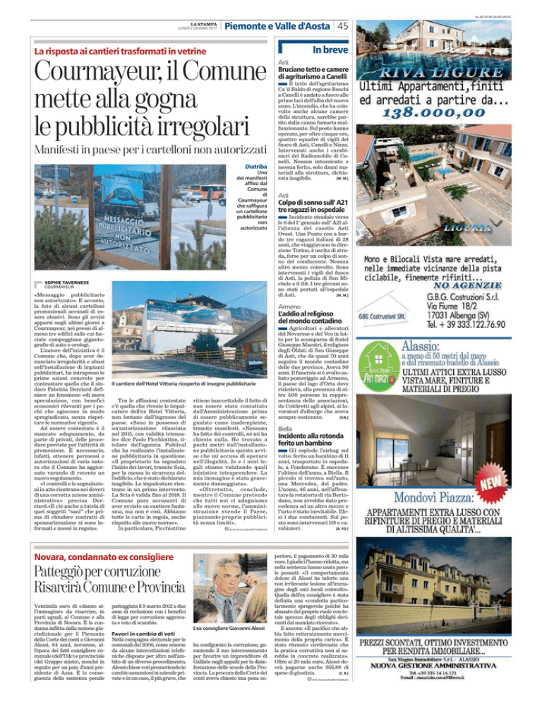 AL AO AT BI CN NO VB VC LA STAMPA LUNEDÌ 2 GENNAIO 2017 . Piemonte e Valle d'Aosta .45 In breve La risposta ai cantieri trasformati in vetrine Courmayeur, il Comune mette alla gogna le pubblicità irregolari Manifesti in paese per i cartelloni non autorizzati Diatriba Uno dei manifesti affissi dal Comune di Courmayeur che raffigura un cartellone pubblicitario non autorizzato SOPHIE TAVERNESE COURMAYEUR «Messaggio pubblicitario non autorizzato». E accanto, la foto di alcuni cartelloni promozionali accusati di essere abusivi. Sono gli avvisi apparsi negli ultimi giorni a Courmayeur, nei pressi di almeno tre edifici sulle cui facciate campeggiano gigantografie di auto e orologi. L’autore dell’iniziativa è il Comune che, dopo aver denunciato irregolarità e abusi nell’installazione di impianti pubblicitari, ha intrapreso le prime azioni concrete per contrastare quello che il sindaco Fabrizia Derriard definisce un fenomeno «di mera speculazione, con benefici economici rilevanti per i pochi che agiscono in modo spregiudicato, senza rispettare le normative vigenti». Ad essere contestato è il mancato adeguamento, da parte di privati, delle procedure previste per l’attività di promozione. È necessario, infatti, ottenere permessi e autorizzazioni di varia natura che il Comune ha aggiornato varando di recente un nuovo regolamento. «I controlli e le segnalazioni in atto rientrano nei doveri di una corretta azione amministrativa» precisa Derriard.«E ciò anche a tutela di quei soggetti “sani” che prima di chiudere contratti di sponsorizzazione si sono informati e messi in regola». Bruciano tetto e camere di agriturismo a Canelli n Il tetto dell’agriturismo Ca ’d Baldo di regione Boschi a Canelli è andato a fuoco alle prime luci dell’alba del nuovo anno. L’incendio, che ha coinvolto anche alcune camere della struttura, sarebbe partito dalla canna fumaria malfunzionante. Sul posto hanno operato, per oltre cinque ore, quattro squadre di vigili del fuoco di Asti, Canelli e Nizza. Intervenuti anche i carabinieri del Radiomobile di Canelli. Nessun intossicato e nessun ferito, solo danni materiali alla struttura, dichiarata inagibile. [M. M.] Asti Colpo di sonno sull’ A21 tre ragazzi in ospedale n Incidente stradale verso le 6 del 1° gennaio sull’ A21 all’altezza del casello Asti Ovest. Una Punto con a bordo tre ragazzi italiani di 28 anni, che viaggiavano in direzione Torino, è uscita di strada, forse per un colpo di sonno del conducente. Nessun altro mezzo coinvolto. Sono intervenuti i vigili del fuoco di Asti, la polizia di San Michele e il 118. I tre giovani sono stati portati all’ospedale di Asti. [M. M.] Armeno L’addio al religioso del mondo contadino n Agricoltori Il cantiere dell’Hotel Vittoria ricoperto di insegne pubblicitarie Tra le affissioni contestate c’è quella che riveste le impalcature dell’ex Hotel Vittoria, non lontano dall’ingresso del paese. «Sono in possesso di un’autorizzazione rilasciata nel 2015, con validità triennale» dice Paolo Picchiottino, titolare dell’agenzia Publival che ha realizzato l’installazione pubblicitaria in questione. «Il proprietario ha segnalato l’inizio dei lavori, tramite Scia, per la messa in sicurezza dell’edificio, che è stato dichiarato inagibile. Le impalcature rientrano in un primo intervento. La Scia è valida fino al 2018. Il Comune pare accusarci di aver avviato un cantiere fantasma, ma non è così. Abbiamo tutte le carte in regola, anche rispetto alle nuove norme». In particolare, Picchiottino ritiene inaccettabile il fatto di non essere stato contattato dall’Amministrazione prima di essere pubblicamente segnalato come inadempiente, tramite manifesti. «Nessuno ha fatto dei controlli, né mi ha chiesto nulla. Ho trovato a pochi metri dall’installazione pubblicitaria questo avviso che mi accusa di operare nell’illegalità. Io e i miei legali stiamo valutando quali iniziative intraprendere. La mia immagine è stata gravemente danneggiata». «Oltretutto, conclude, mentre il Comune pretende che tutti noi ci adeguiamo alle nuove norme, l’amministrazione svende il Paese, piazzando proprie pubblicità senza limiti». c BY NC ND ALCUNI DIRITTI RISERVATI Novara, condannato ex consigliere Patteggiò per corruzione Risarcirà Comune e Provincia Ventimila euro di «danno all’immagine» da risarcire, in parti uguali, al Comune e alla Provincia di Novara. È la condanna inflitta dalla sezione giurisdizionale per il Piemonte della Corte dei conti a Giovanni Alessi, 64 anni, novarese, all’epoca dei fatti consigliere comunale (dell’Udc) e provinciale (del Gruppo misto), nonché in seguito per un paio d’anni presidente di Assa. È la conseguenza della sentenza penale Asti patteggiata il 9 marzo 2012 a due anni di reclusione con i benefici di legge per corruzione aggravata e voto di scambio. L’ex consigliere Giovanni Alessi Favori in cambio di voti Nella campagna elettorale per le comunali del 2006, come emerse da alcune intercettazioni telefoniche disposte per altro nell’ambito di un diverso procedimento, Alessi chiese voti promettendo in cambio assunzioni in aziende private e in un caso, il più grave, che ha configurato la corruzione, garantendo il suo interessamento per favorire un imprenditore di Galliate negli appalti per la disinfestazione delle scuole della Provincia. La procura della Corte dei conti aveva chiesto una pena su- e allevatori del Novarese e del Vco in lutto per la scomparsa di fratel Giuseppe Maestri, il religioso degli Oblati di San Giuseppe di Asti, che da quasi 70 anni seguiva il mondo contadino delle due province. Aveva 90 anni. Il funerale si è svolto sabato pomeriggio ad Armeno, il paese del lago d’Orta dove risiedeva, alla presenza di oltre 500 persone in rappresentanza delle associazioni, da Coldiretti agli alpini, ai lavoratori d’albergo che aveva sempre sostenuto. [V.A.] Biella Incidente alla rotonda ferito un bambino n Gli esplode l’airbag