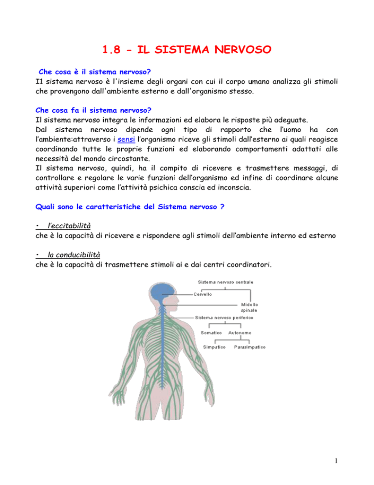1.8 - IL SISTEMA NERVOSO Che cosa è il sistema nervoso? I1 sistema nervoso è l'insieme degli organi con cui il corpo umano analizza gli stimoli che provengono dall'ambiente esterno e dall'organismo stesso. Che cosa fa il sistema nervoso? Il sistema nervoso integra le informazioni ed elabora le risposte più adeguate. Dal sistema nervoso dipende ogni tipo di rapporto che l’uomo ha con l’ambiente:attraverso i sensi l’organismo riceve gli stimoli dall’esterno ai quali reagisce coordinando tutte le proprie funzioni ed elaborando comportamenti adattati alle necessità del mondo circostante. Il sistema nervoso, quindi, ha il compito di ricevere e trasmettere messaggi, di controllare e regolare le varie funzioni dell’organismo ed infine di coordinare alcune attività superiori come l’attività psichica conscia ed inconscia. Quali sono le caratteristiche del Sistema nervoso ? • l’eccitabilità che è la capacità di ricevere e rispondere agli stimoli dell’ambiente interno ed esterno • la conducibilità che è la capacità di trasmettere stimoli ai e dai centri coordinatori. 1 la cellula nervosa - Il neuroneL'unità funzionale di base del sistema nervoso è la cellula nervosa, il neurone. Questa cellula nervosa, o neurone, componente principale di cui sono costituiti gli organi del sistema nervoso, ha il compito di registrare informazioni e trasmetterle attraverso l'organismo ad altissima velocità. Per poter svolgere questa funzione il neurone ha una struttura particolare che lo differenzia in parte dalle altre cellule del corpo umano: si dice pertanto che è una cellula specializzata. Come tutte le cellule, il neurone è formato da un corpo cellulare, che contiene il nucleo e la maggior parte del citoplasma; nel corpo cellulare, le cui dimensioni possono essere molto diverse (dai 4 ai 100 micron), si compiono tutte le funzioni che servono a mantenere in vita la cellula. 2 I dendriti e l’assone A differenza delle altre cellule, il corpo cellulare del neurone presenta due tipi di prolungamenti, i dendriti e l’ assone, che hanno lo scopo di collegare il neurone con altre cellule, in genere nervose, in modo da permettere il trasferimento delle informazioni. Di solito una cellula nervosa ha tanti dendriti e un solo assone. . I dendriti sono i prolungamenti più corti che escono dal corpo cellulare e si suddividono a loro volta in tanti piccoli rametti. Collegano ogni neurone con i neuroni vicini. L'assone, o neurite, o cilindrasse è il più lungo dei prolungamenti: ha forma cilindrica e spessore e dimensioni varie e può estendersi fino a notevole di stanza dal corpo cellulare. Gli assoni hanno diverse guaine protettive; alcuni assoni (non tutti) sono rivestiti di mielina (guaina mielinica), una sostanza grassa particolare che funziona da isolante nel senso che «isola» gli assoni uno dall'altro in modo che non ci siano interferenze tra i vari segnali che possono viaggiare con il loro linguaggio “elettrico”, fatto di variazioni di potenziale elettrico, al fine di non far perdere al messaggio la sua caratteristica e la sua specificità a causa della lontana dalla centrale (Il cervello). I nervi o fibre nervose Una fibra nervosa è formata da una catena di neuroni collegati gli uni agli altri dai neuriti. Nella trasmissione delle informazioni, dendriti e assone hanno ruoli differenti. I dendriti raccolgono le informazioni da altre cellule nervose e le trasmettono al corpo cellulare: l'informazione nervosa procede dunque nei dendriti in direzione centripeta, dalla periferia al centro. L'assone trasporta invece informazioni da una cellula ad altre cellule nervose alle quali è collegato: l'informazione viaggia dunque in direzione centrifuga, dal corpo cellulare alla periferia. A seconda della funzione che svolgono i neuroni si dividono in sensori, motori e di associazione:• i neuroni sensori trasmettono le diverse sensazioni che provengono dagli organi di senso: caldo, freddo, dolore, luce ecc.; i neuroni motori trasmettono ai vari organi periferici del corpo umano, per esempio a un muscolo, le risposte elaborate dal sistema nervoso centrale; i neuroni di associazione sono quelli che fungono da collegamento fra i neuroni sensori e quelli motori, e hanno lo scopo di intensificare o indebolire le risposte. 3 Come si trasmettono le informazioni? In realtà i neuroni non trasmettono suoni, odori, colori, parole bensì trasmettono informazioni sotto forma di impulsi nervosi che sono deboli impulsi elettrici. Questi impulsi elettrici corrono lungo l’assone della cellula nervosa che termina con delle ramificazioni sulle cui estremità vi sono dei rigonfiamenti chiamati bottoni presinaptici. Il bottone presinaptico non è attaccato al neurone successivo (al quale deve trasmettere l'informazione) ma è separato da questo da uno spazio vuoto piccolissimo (visibile solo al microscopio elettronico) chiamato sinapsi. Quando l'impulso arriva all'assone e raggiunge il suo bottone presinaptico si ha il rilascio di particolari sostanze chimiche (neurotrasmettitori) che formano un «ponte» grazie al quale lo stimolo nervoso attraversa la sinapsi e raggiunge la membrana postsinaptica del neurone successivo e cosi via. Le sinapsi servono dunque a collegare i neuroni fra loro (gli assoni di uno con i dendriti di un altro oppure assoni fra loro oppure assoni e cellule nervose), i neuroni con i recettori degli stimoli, i neuroni con particolari organi, in particolare i muscoli. Gli impulsi possono andare solo in una direzione: solo l’assone del neurone presinaptico libera il neurotrasmettitore e solo i dendriti o il corpo cellulare del neurone postsinaptico possono captare. La sinapsi dipende quindi, da fenomeni chimico-fisici ed è capace di propagare molto rapidamente gli impulsi in tutto il sistema nervoso come se questo fosse percorso da una corrente elettrica. Come si divide il sistema nervoso? Il sistema nervoso comprende due parti: • 1 - Sistema Nervoso Centrale (SNC) • 2 - Si