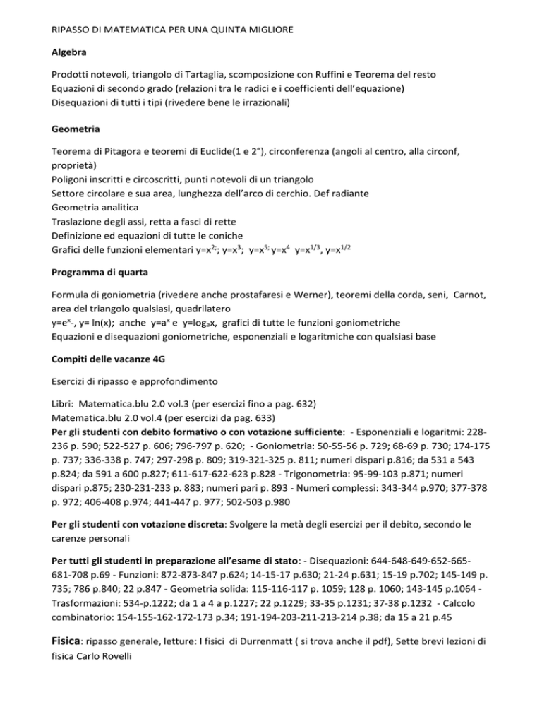 RIPASSO DI MATEMATICA PER UNA QUINTA MIGLIORE Algebra Prodotti notevoli, triangolo di Tartaglia, scomposizione con Ruffini e Teorema del resto Equazioni di secondo grado (relazioni tra le radici e i coefficienti dell’equazione) Disequazioni di tutti i tipi (rivedere bene le irrazionali) Geometria Teorema di Pitagora e teoremi di Euclide(1 e 2°), circonferenza (angoli al centro, alla circonf, proprietà) Poligoni inscritti e circoscritti, punti notevoli di un triangolo Settore circolare e sua area, lunghezza dell’arco di cerchio. Def radiante Geometria analitica Traslazione degli assi, retta a fasci di rette Definizione ed equazioni di tutte le coniche Grafici delle funzioni elementari y=x2;; y=x3; y=x5; y=x4 y=x1/3, y=x1/2 Programma di quarta Formula di goniometria (rivedere anche prostafaresi e Werner), teoremi della corda, seni, Carnot, area del triangolo qualsiasi, quadrilatero y=ex-, y= ln(x); anche y=ax e y=logax, grafici di tutte le funzioni goniometriche Equazioni e disequazioni goniometriche, esponenziali e logaritmiche con qualsiasi base Compiti delle vacanze 4G Esercizi di ripasso e approfondimento Libri: Matematica.blu 2.0 vol.3 (per esercizi fino a pag. 632) Matematica.blu 2.0 vol.4 (per esercizi da pag. 633) Per gli studenti con debito formativo o con votazione sufficiente: - Esponenziali e logaritmi: 228236 p. 590; 522-527 p. 606; 796-797 p. 620; - Goniometria: 50-55-56 p. 729; 68-69 p. 730; 174-175 p. 737; 336-338 p. 747; 297-298 p. 809; 319-321-325 p. 811; numeri dispari p.816; da 531 a 543 p.824; da 591 a 600 p.827; 611-617-622-623 p.828 - Trigonometria: 95-99-103 p.871; numeri dispari p.875; 230-231-233 p. 883; numeri pari p. 893 - Numeri complessi: 343-344 p.970; 377-378 p. 972; 406-408 p.974; 441-447 p. 977; 502-503 p.980 Per gli studenti con votazione discreta: Svolgere la metà degli esercizi per il debito, secondo le carenze personali Per tutti gli studenti in preparazione all’esame di stato: - Disequazioni: 644-648-649-652-665681-708 p.69 - Funzioni: 872-873-847 p.624; 14-15-17 p.630; 21-24 p.631; 15-19 p.702; 145-149 p. 735; 786 p.840; 22 p.847 - Geometria solida: 115-116-117 p. 1059; 128 p. 1060; 143-145 p.1064 Trasformazioni: 534-p.1222; da 1 a 4 a p.1227; 22 p.1229; 33-35 p.1231; 37-38 p.1232 - Calcolo combinatorio: 154-155-162-172-173 p.34; 191-194-203-211-213-214 p.38; da 15 a 21 p.45 Fisica: ripasso generale, letture: I fisici di Durrenmatt ( si trova anche il pdf), Sette brevi lezioni di fisica Carlo Rovelli