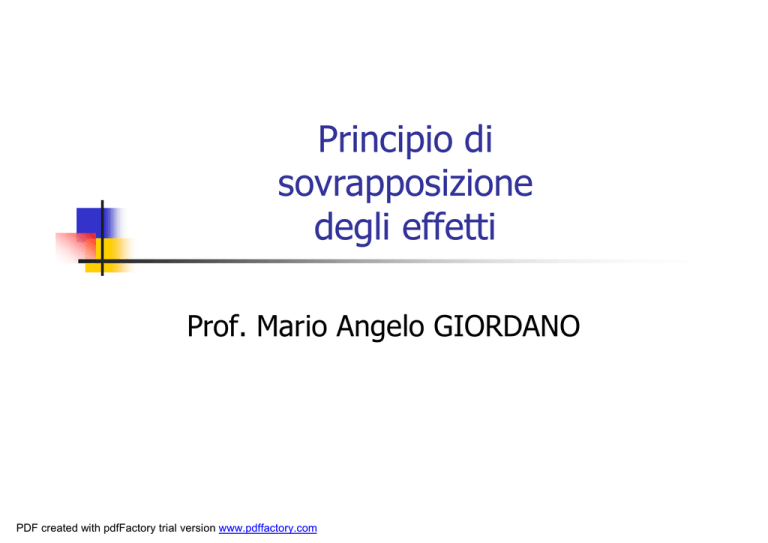 Principio di sovrapposizione degli effetti Prof. Mario Angelo GIORDANO PDF created with pdfFactory trial version www.pdffactory.com regola Data una rete lineare contenete n bipoli attivi ( di corrente o di tensione) di cui si vuole calcolare una grandezza elettrica ( tensione o corrente) in un generico punto della rete, si scompone il circuito in n circuiti parziali, in ognuno dei quali agirà un solo bipolo attivo, avente funzione di generatore in quanto rimane l’unico componente in grado di fornire energia elettrica al resto della rete PDF created with pdfFactory trial version www.pdffactory.com Punto due Ogni circuito parziale si ricava dalla rete iniziale disattivando tutti i bipoli attivi meno 1, dove per “disattivazione” si intende la sostituzione dei bipoli attivi di corrente con circuiti aperti ideali (corrente impressa I0=0) e la sostituzione dei bipoli attivi di tensione con corto circuiti ideali (tensione interna E=0) PDF created with pdfFactory trial version www.pdffactory.com Punto tre Si calcola la grandezza elettrica incognita in ognuno dei circuiti parziali; i vari risultati ottenuti sono da intendere come i contributi dei vari generatori alla grandezza incognita effettiva; PDF created with pdfFactory trial version www.pdffactory.com Punto quattro Si sommano algebricamente gli n risultati ottenuti, tenendo conto dei segni dei risultati parziali; più specificamente, occorre tener conto dei versi delle correnti parziali e delle polarità delle tensioni parziali, a seconda dei casi. La sovrapposizione degli effetti non è applicabile a reti non lineari, ossia aventi anche un solo bipolo elettrico con parametri non costanti al variare delle grandezze elettriche PDF created with pdfFactory trial version www.pdffactory.com esempio R4 E1=12V, R1=120Ω, I02=0,25A, E3= A + + E1 I02 R1 E3 R3 B PDF created with pdfFactory trial version www.pdffactory.com