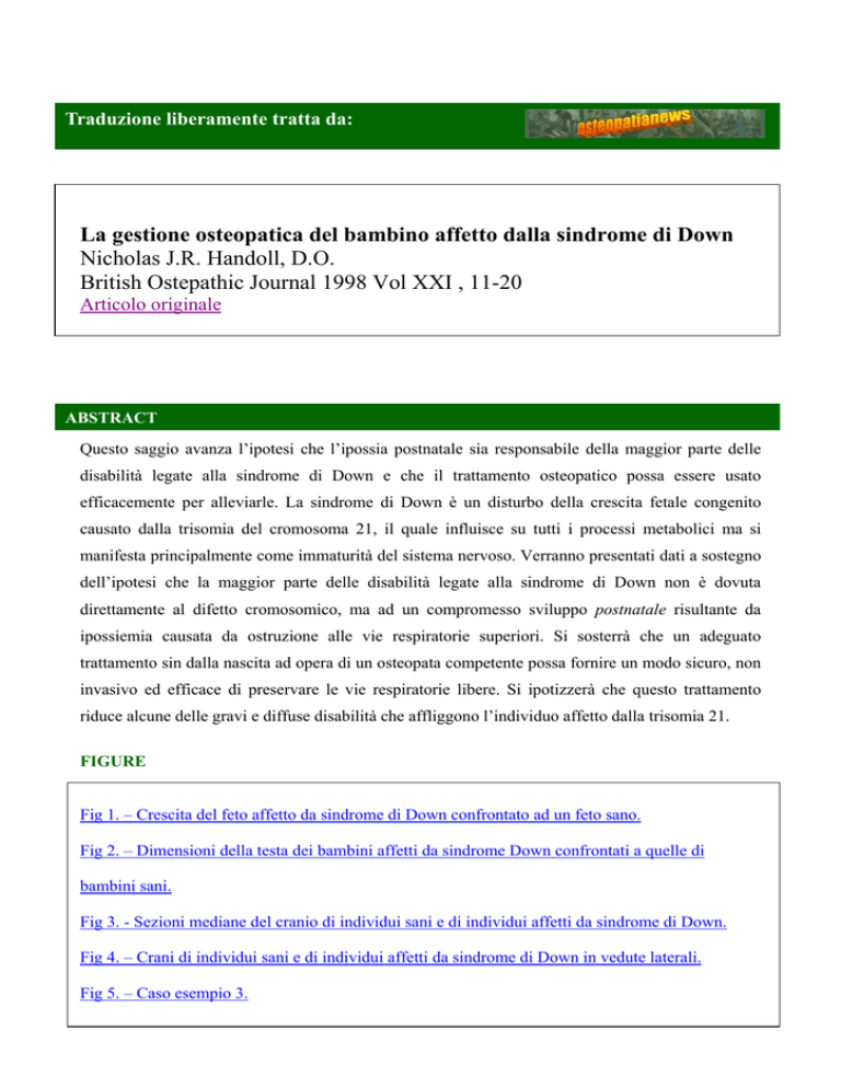 Traduzione liberamente tratta da: La gestione osteopatica del bambino affetto dalla sindrome di Down Nicholas J.R. Handoll, D.O. British Ostepathic Journal 1998 Vol XXI , 11-20 Articolo originale ABSTRACT Questo saggio avanza l’ipotesi che l’ipossia postnatale sia responsabile della maggior parte delle disabilità legate alla sindrome di Down e che il trattamento osteopatico possa essere usato efficacemente per alleviarle. La sindrome di Down è un disturbo della crescita fetale congenito causato dalla trisomia del cromosoma 21, il quale influisce su tutti i processi metabolici ma si manifesta principalmente come immaturità del sistema nervoso. Verranno presentati dati a sostegno dell’ipotesi che la maggior parte delle disabilità legate alla sindrome di Down non è dovuta direttamente al difetto cromosomico, ma ad un compromesso sviluppo postnatale risultante da ipossiemia causata da ostruzione alle vie respiratorie superiori. Si sosterrà che un adeguato trattamento sin dalla nascita ad opera di un osteopata competente possa fornire un modo sicuro, non invasivo ed efficace di preservare le vie respiratorie libere. Si ipotizzerà che questo trattamento riduce alcune delle gravi e diffuse disabilità che affliggono l’individuo affetto dalla trisomia 21. FIGURE Fig 1. – Crescita del feto affetto da sindrome di Down confrontato ad un feto sano. Fig 2. – Dimensioni della testa dei bambini affetti da sindrome Down confrontati a quelle di bambini sani. Fig 3. - Sezioni mediane del cranio di individui sani e di individui affetti da sindrome di Down. Fig 4. – Crani di individui sani e di individui affetti da sindrome di Down in vedute laterali. Fig 5. – Caso esempio 3. INTRODUZIONE Nel 1959, novantatré anni dopo che Landon Down nel 1866 descrisse per la prima volta la sindrome che ora porta il suo nome, Lejune ha dimostrato che questa forma di disabilità mentale, che è fra le più comuni, colpisce dagli 800 ai 1000 bambini nati vivi all’anno nel Regno Unito ed è dovuta a materiale genetico extra presente sul lungo braccio del cromosoma 21. La sindrome di Down è un disturbo della crescita fetale congenito causato dalla trisomia del cromosoma 21, il quale influisce su tutti i processi metabolici ma si manifesta principalmente come immaturità del sistema nervoso. La sindrome presenta una vasta gamma di caratteristiche; un numero esiguo di individui le manifesta tutte, altri invece solo alcune. L’effetto del materiale genetico extra presente sul cromosoma 21 sembra quello di indebolire le capacità di contrastare uno sviluppo alterato durante la crescita del feto, il che comporta un’incidenza maggiore di anomalie minori. CARATTERISTICHE GENERALI Il deficit principale della sindrome di Down si riscontra nel sistema nervoso, ma le caratteristiche generali comprendono l’aspetto fisico e il comportamento così come le funzioni intellettive. Per quanto concerne l’aspetto fisico, le caratteristiche più evidenti sono ben note. L’ipotonia, o mollezza negli arti nel neonato è la caratteristica più frequente. Il fenotipo fisico di un soggetto affetto da sindrome di Down presenta una muscolatura ipotonica con articolazioni flessibili e bassa statura. Il cranio è diminuito nel suo diametro antero-posteriore, sono presenti pliche epicantiche con il caratteristico taglio a mandorla degli occhi ed una depressione del ponte nasale. I cristallini possono essere aplastici con la possibilità di sviluppare difetti refrattivi. Le orecchie sono piccole e la dentizione è ipoplastica e immatura. Il collo è corto. Le mani hanno le caratteristiche dita corte con la possibile presenza di clinodattilia, un unico solco palmare e segni dermatoglifici nei palmi. I piedi presentano uno spazio fra il primo e il secondo dito. Il bacino è ipoplasico e ha la caratteristica forma ad “orecchio d’elefante”. Si rilevano anomalie cardiache nel 40% dei casi. La pelle è secca e i capelli sono radi. Generalmente i genitali sono immaturi. Il sistema nervoso è iposviluppato. La commessura anteriore è piccola e immatura ed i dendriti dei neuroni corticali sono anormali. Il bambino presenta difficoltà di apprendimento che possono variare da una disabilità grave ad un range intellettivo nella norma a seconda dell’individuo. Pueschel ha raggruppato le condizioni cliniche comunemente osservabili nella popolazione affetta da sindrome di Down dall’età neonatale a quella adulta. Nel bambino molto piccolo queste comprendono anomalie congenite quali le cataratte, anomalie gastro-intestinali e cardiopatie. Fra i problemi comuni della prima infanzia vi sono le malattie infettive, periodontite, disturbi epilettici, apnea nel sonno, compromissione delle facoltà visive, deficit uditivi, disfunzioni della tiroide e problemi scheletrici. Durante l’adolescenza, sono notevoli i problemi di accrescimento e di salute come infezioni cutanee, disturbi alla tiroide e aumento di peso e problemi legati alla salute mentale. Disturbi analoghi possono essere osservati anche in età adulta, la quale è spesso caratterizzata da un invecchiamento precoce e dal pericolo di sviluppare il morbo di Alzheimer. [1] MUTAZIONI GENETICHE Circa il 90% - 95% dei casi di sindrome di Down sono imputabili alla trisomia del cromosoma 21. Ciò significa che l’individuo è portatore di un terzo cromosoma 21 invece dei normali due. Solo un piccolo segmento del cromosoma 21 è responsabile delle caratteristiche della sindrome di Down... Questa esigua parte del genoma umano che, se presente come segmento extra è responsabile delle caratteristiche della sindrome di Down, corrisponde forse a solo a 50 - 100 geni. Ci sono tre modalità principali secondo cui può avvenire questa divisione alterata. Non disgiunzione Durante la meiosi, quando le cellule si dividono per produrre cellule gameti, se i cromatidi non si separano equamente verso i due poli della cellula prima che questa si divida, la cellula figlia avrà un numero anomalo di