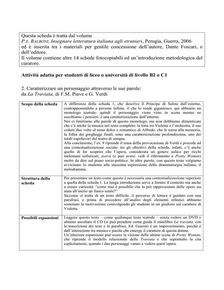 Questa scheda è tratta dal volume P.E. BALBONI, Insegnare letteratura italiana agli stranieri, Perugia, Guerra, 2006 ed è inserita tra i materiali per gentile concessione dell’autore, Dante Foscari, e dell’editore. Il volume contiene altre 14 schede fotocopiabili ed un’introduzione metodologica del curatore. Attività adatta per studenti di liceo o università di livello B2 o C1 2. Caratterizzare un personaggio attraverso le sue parole: da La Traviata, di F.M. Piave e G. Verdi Scopo della scheda A differenza della scheda 1, che descrive il Principe di Salina dall’esterno, contrapponendolo a persone infime, il che lo rende gigantesco, qui abbiamo un monologo teatrale: quindi il personaggio viene visto in scena mentre ne ascoltiamo i pensieri: è una caratterizzazione dall’interno. Noi ci limitiamo alle parole di questo monologo, ma non dobbiamo dimenticare che c’è anche la musica nel testo completo: la lotta tra Violetta e l’orchestra, il suo cedere due volte al tema dolce e romantico di Alfredo, che le torna alla memoria, la follia dei gorgheggi finali, sono una caratterizzazione profondissima, uno dei totali capolavori del teatro di sempre. Alla conclusione, l’es. 9 riprende il tema della provocazione di Verdi e procede ad una contestualizzazione sociale: tra gli obiettivi della scheda, infatti, c’è anche quello di far scoprire che l’opera, considerata un genere aulico per ricchi melomani sofisticati, aveva (e può avere: vedi il riferimento a Pretty Woman) molto da dire sul piano socio-politico. In altre parole, con questo testo volgiamo avvicinare lo studente alla massima espressione della drammaturgia italiana, il melodramma. - Struttura della scheda Per presentare un testo come questo è necessaria una contestualizzazione superiore a quella della scheda 1. La lunga introduzione serve a fornire il contesto ma anche a creare curiosità: “come mai è possibile che la più rappresentata delle opere sia stata all’inizio un fiasco totale?” Siccome si tratta di un testo difficile, il percorso di lettura è guidato con una parafrasi, e prima di procedere all’analisi degli elementi stilistici abbiamo sostenuto la motivazione coinvolgendo gli studenti in un giudizio sul carattere di Violetta. Possibili espansioni Leggere questo testo – come qualunque testo teatrale – senza vedere un DVD o almeno ascoltare il CD (si può prendere come guida il minilibro La traviata, con le trascrizioni dei testi e le parafrasi, Ed. Guerra) è un impoverimento, perché è dall’interazione tra musica e parole che emerge il carattere di questa donna. Un’ulteriore espansione può essere la visione delle ultime scene di Pretty Woman, che riprende il modello relazionale della Traviata e che soprattutto la cita esplicitamene, quando i due personaggi vanno a vedere quest’opera. Caratterizzare un personaggio attraverso le sue parole Conoscerai adesso uno dei personaggi più famosi della letteratura operistica mondiale, Violetta, l’eroina di La Traviata, scritta da Giuseppe Verdi su un libretto di Francesco Maria Piave, basato a sua volta su un romanzo di Alexandre Dumas figlio. Le date sono importanti – e forse ti faranno cambiare idea sulla possibilità dell’opera lirica di essere “moderna”: - 1847: a 23 anni muore Alphonsine Plessis, una “cortigiana” (cioè una donna mantenuta dai suoi amanti), molto inserita nell’alta società parigina, ammirata da intellettuali ed artisti, tra cui lo scrittore Alexandre Dumas figlio; - 1848: prima edizione a stampa del romanzo La dame aux camélias, la biografia che Alexandre Dumas dedica ad Alphonsine, chiamandola Violetta; - 1852: prima versione teatrale, in cinque atti con intermezzi cantati, di La dame aux camélias al teatro del vaudeville a Parigi; - 1853: prima esecuzione assoluta della Traviata alla Fenice di Venezia. Osserviamo bene le date: tra la storia vera e la sua realizzazione alla Fenice come opera lirica passano sei anni appena. Il che significa che è una storia di piena attualità quella che Francesco Maria Piave e Giuseppe Verdi presentano a Venezia. Ma la prima rappresentazione della Traviata fu un fiasco – anche se sembra impossibile, visto che oggi è l’opera più rappresentata nel mondo ed ha perfino ispirato un film hollywoodiano, Pretty Woman… Cerchiamo di capire perché questa donna creò tanto scandalo. 1. Prima di leggere Nel primo atto, c’è una grande festa a casa di Violetta, con un brindisi famosissimo (Libiamo nei lieti calici). Finito il brindisi, tutti vanno al salone del pranzo, e rimangono in scena Violetta e Alfredo, un giovane ricco. Lui le confessa che da un anno è innamorato di lei, e anche questa è un’aria che forse conosci (Di quell’amor). Lei gli dice che non si faccia illusioni, lei non può essere che amica, non può innamorarsi; lo manda al salone del pranzo dove ci sono gli altri, dicendo che lo raggiungerà. Resta sola: - a che cosa pensa, secondo te, una donna che ha ricevuto una dichiarazione d’amore e sa che il suo “mestiere” le impedisce di amare? - Violetta è una prostituta, per quanto di alto livello: accetterà la corte di Alfredo, quanto meno per interesse? - E se anche lei fosse innamorata i Alfredo? Cosa penserebbe, nel momento in cui scopre che anche lui la ama? Confronta le tue ipotesi con i compagni. 2. Adesso leggi Leggi il testo rapidamente, aiutandoti con la parafrasi perché l’originale è in italiano ottocentesco. Dividi il testo nelle due parti in cui è composto e dài loro un titolo 1. Dal verso 1 a_______: ________________________________________________________ 2. Dal verso ______ al 50: ________________________________________________________ C’è anche una parte che torna due volte dalle scene precedenti: quali versi sono? _________________ e _______________ 1 2 3 4 5 6 7 È strano! è strano! in core Scolpiti ho quegli accenti! Sarìa per me sventura un serio amore? Che risolvi, o turbata anima mia? Null'uomo ancora t'accende