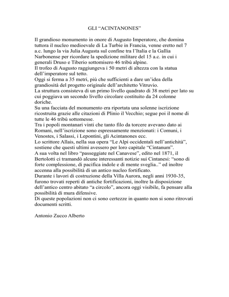 GLI “ACINTANONES” Il grandioso monumento in onore di Augusto Imperatore, che domina tuttora il nucleo medioevale di La Turbie in Francia, venne eretto nel 7 a.c. lungo la via Julia Augusta sul confine tra l’Italia e la Gallia Narbonense per ricordare la spedizione militare del 15 a.c. in cui i generali Druso e Tiberio sottomisero 46 tribù alpine. Il trofeo di Augusto raggiungeva i 50 metri di altezza con la statua dell’imperatore sul tetto. Oggi si ferma a 35 metri, più che sufficienti a dare un’idea della grandiosità del progetto originale dell’architetto Vitruvio. La struttura consisteva di un primo livello quadrato di 38 metri per lato su cui poggiava un secondo livello circolare costituito da 24 colonne doriche. Su una facciata del monumento era riportata una solenne iscrizione ricostruita grazie alle citazioni di Plinio il Vecchio; segue poi il nome di tutte le 46 tribù sottomesse. Tra i popoli montanari vinti che tanto filo da torcere avevano dato ai Romani, nell’iscrizione sono espressamente menzionati: i Comuni, i Venostes, i Salassi, i Lepontini, gli Acintanones ecc. Lo scrittore Allais, nella sua opera “Le Alpi occidentali nell’antichità”, sostiene che questi ultimi avessero per loro capitale “Cintanum”. A sua volta nel libro “passeggiate nel Canavese”, edito nel 1871, il Bertolotti ci tramandò alcune interessanti notizie sui Cintanesi: “sono di forte complessione, di pacifica indole e di mente sveglia..” ed inoltre accenna alla possibilità di un antico nucleo fortificato. Durante i lavori di costruzione della Villa Aurora, negli anni 1930-35, furono trovati reperti di antiche fortificazioni, inoltre la disposizione dell’antico centro abitato “a circolo”, ancora oggi visibile, fa pensare alla possibilità di mura difensive. Di queste popolazioni non ci sono certezze in quanto non si sono ritrovati documenti scritti. Antonio Zucco Alberto