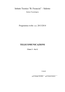 ISTITUTO D’ISTRUZIONE SUPERIORE VEN. IGNAZIO CAPIZZI BRONTE Programma svolto di Tecnologie elettriche elettroniche e applicazioni Classe 3C Docenti : Sturniolo Giuseppe Nicotra Carmelo A.A. 2012-13 MODULO 1 – FONDAMENTI DI ELETTRONICA ANALOGICA Recupero prerequisiti Leggi e principi base dell’elettrotecnica Circuiti resistivi a singolo generatore in continua Teoremi e regole di semplificazione per circuiti resistivi Verifiche ed esercitazioni MODULO 2 – FONDAMENTI DI ELETTRONICA DIGITALE Segnali digitali Porte logiche Studio delle porte logiche mediante tabelle di verità Funzioni logiche Algebra di Boole e regole fondamentali per la semplificazione Implementazione e montaggio di funzioni logiche a porte base Forme canoniche Realizzazioni equivalenti a sole porte Nand Breve descrizione integrati digitali Mappe di Karnaugh Implementazione e semplificazione di funzioni logiche mediante Mappe di Karnaugh Collegamento funzioni logiche tabelle di verità mappe Sistema di numerazione binario-Operazioni aritmetiche Verifiche ed esercitazioni MODULO 3 – DISPOSITIVI DIGITALI Circuiti Combinatori Encoder e Decoder Multiplexer e Demultiplexer Cenni sui temporizzatori NE555 Verifiche ed esercitazioni MODULO 4 – SEGNALI ELETTRICI E RETI IN REGIME SINUSOIDALE Segnali periodici, alternati e sinusoidali Periodo e frequenza, banda di un segnale Grafici e cenni di trigonometria Numeri complessi esercizi e operazioni fondamentali Espressione sinusoidale del segnale e vettoriale Espressione complessa-Modulo e fase Concetto di Impedenza Reattanza capacitiva e induttiva esercizi Analisi di circuiti in alternata Frequenza di risonanza e grafici, circuiti RLC Verifiche ed esercitazioni ESERCITAZIONE DI TECN. ELETTR. MODULO 1 – FONDAMENTI DI ELETTRONICA ANALOGICA Recupero prerequisiti Misure di corrente e tensione Implementazione di circuiti con componenti resistivi, misure e verifiche Simulazione con EWB di circuiti vari con interruttori Verifiche ed esercitazioni MODULO 2 - SEGNALI ELETTRICI E RETI IN REGIME SINUSOIDALE Misura dei parametri caratteristici dei segnali sinusoidali Misure di valore efficace e frequenza Analisi e studio di diversi segnali variabili MODULO 3 - FONDAMENTI DI ELETTRONICA DIGITALE Analisi sperimentale del comportamento di alcune porte logiche Verifica sperimentale del funzionamento di funzioni logiche mediante tabella di verità Realizzazione equivalente a porte Nand Simulazione e realizzazione di sistema di allarme a porte logiche Implementazione su bredboard di vari circuiti a porte logiche Simulazione con EWB di circuiti vari. Bronte 01-06-2013 Alunni Docenti Prof. Sturniolo Giuseppe Prof. Nicotra Carmelo