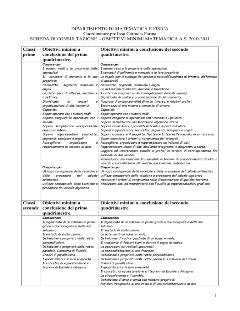 DIPARTIMENTO DI MATEMATICA E FISICA Coordinatore prof.ssa Carmela Farina SCHEDA DI CONSULTAZIONE – OBIETTIVI MINIMI MATEMATICA A.S. 2010-2011 Classi prime Obiettivi minimi a conclusione del primo quadrimestre. Obiettivi minimi a conclusione del secondo quadrimestre. Conoscenze: I numeri reali e le proprietà delle operazioni Il concetto di monomio e le sue proprietà Semirette, segmenti, semipiani e angoli Le definizioni di altezza, mediana e bisettrice Significato di analisi e organizzazione di dati numerici. Capacità: Saper operare con i numeri reali. Sapere eseguire le operazioni con i monomi Sapere semplificare un’espressione algebrica intera Sapere rappresentare semirette, segmenti, semipiani e angoli Raccogliere, organizzare e rappresentare un insieme di dati. Conoscenze: I numeri reali e le proprietà delle operazioni I concetti di polinomio e monomio e le loro proprietà Le regole per lo sviluppo dei prodotti notevoli(quadrato di binomio, differenza di quadrati) Semirette, segmenti, semipiani e angoli Le definizioni di altezza, mediana e bisettrice I criteri di congruenza dei triangoli(senza dimostrazione) Significato di analisi e organizzazione di dati numerici. Funzione di proporzionalità diretta, inversa, e relativi grafici. Incertezza di una misura e concetto di errore. Capacità: Saper operare con i numeri reali. Sapere eseguire le operazioni con i monomi e i polinomi Sapere semplificare un’espressione algebrica intera Sapere riconoscere i prodotti notevoli e saperli calcolare Sapere rappresentare semirette, segmenti, semipiani e angoli Saper riconoscere il soggetto, l’ipotesi e la tesi nell’enunciato di un teorema Saper enunciare i criteri di congruenza dei triangoli Raccogliere, organizzare e rappresentare un insieme di dati. Rappresentare classi di dati mediante istogrammi e diagrammi a torta. Leggere ed interpretare tabelle e grafici in termini di corrispondenza fra elementi di due insiemi. Riconoscere una relazione tra variabili in termini di proporzionalità diretta o inversa e formalizzarla attraverso una funzione matematica Competenze: Competenze: Utilizzo consapevole delle tecniche e Utilizzo consapevole delle tecniche e delle procedure del calcolo aritmetico delle procedure del calcolo utilizzo consapevole delle tecniche e procedure del calcolo algebrico aritmetico Applicare i criteri di congruenza nella dimostrazione di qualche teorema utilizzo consapevole delle tecniche e Analizzare dati ed interpretarli con l'ausilio di rappresentazioni grafiche procedure del calcolo algebrico Classi Obiettivi minimi a seconde conclusione del primo quadrimestre. Conoscenze: Il significato di un sistema di primo grado a due incognite e delle sue soluzioni. Il metodo di sostituzione. Definizioni e proprietà delle rette perpendicolari. Definizioni e proprietà delle rette parallele. L’assioma di Euclide. Criteri di parallelismo. I quadrilateri e le loro proprietà. Il concetto di equiestensione e i teoremi di Euclide e Pitagora. Obiettivi minimi a conclusione del secondo quadrimestre. Conoscenze: Il significato di un sistema di primo grado a due incognite e delle sue soluzioni. Il metodo di sostituzione. La potenza di un numero reale. Definizione di radice quadrata di un numero reale. Il trasporto di fattori fuori o dentro il segno di radice. Le operazioni sui radicali quadratici. La razionalizzazione di una frazione. Definizioni e proprietà delle rette perpendicolari. Definizioni e proprietà delle rette parallele. L’assioma di Euclide. Criteri di parallelismo. I quadrilateri e le loro proprietà. Il concetto di equiestensione e i teoremi di Euclide e Pitagora. La circonferenza e il cerchio. Definizione di arco e corda con relative proprietà. Posizioni reciproche di una retta e di una circonferenza e di due 1 circonferenze complanari. Angoli al centro ed alla circonferenza corrispondenti Angoli al centro ed alla circonferenza corrispondenti con relativo teorema e corollari. Capacità: Saper ridurre un sistema lineare in forma normale. Saper utilizzare il metodo di sostituzione Saper enunciare i criteri per stabilire quando un quadrilatero è un parallelogramma. Saper enunciare i teoremi relativi ai quadrilateri. Saper enunciare i criteri per stabilire quando un parallelogramma è un rombo, un rettangolo o un quadrato. Competenze: Utilizzare in modo autonomo e consapevole le tecniche e le procedure di calcolo per risolvere un sistema lineare Individuare e utilizzare le strategie appropriate per la dimostrazione di semplici enunciati. Classi terze Obiettivi minimi a conclusione del primo quadrimestre le equazioni Competenze: Utilizzare in modo autonomo e consapevole le tecniche e le procedure di calcolo per risolvere un sistema lineare Utilizzare in modo autonomo e consapevole le tecniche e le procedure di calcolo per risolvere un’espressione contenente radicali aritmetici e algebrici. Utilizzare in modo autonomo e consapevole le tecniche e le procedure di calcolo per risolvere un’equazione di I grado a coefficienti irrazionali. Individuare e utilizzare le strategie appropriate per la dimostrazione di semplici enunciati. Individuare e utilizzare le strategie appropriate per la risoluzione di semplici esercizi di geometria euclidea. Obiettivi minimi a conclusione del secondo quadrimestre Conoscenze: Equazioni di secondo grado. Decomposizione di un trinomio di secondo grado. Segno di un trinomio di secondo grado. Disequazioni di secondo grado. Equazioni di grado superiore al secondo riconducibili ad equazioni di grado inferiore. Equazioni biquadratiche. Disequazioni di grado superiore al secondo. Disequazioni frazionarie Capacità: Saper risolvere secondo grado. Capacità: Saper ridurre un sistema lineare in forma normale. Saper utilizzare il metodo di sostituzione Saper definire la radice quadrata di un numero reale, Saper applicare le cinque operazioni ai radicali quadratici. Saper razionalizzare frazioni con denominatore irrazionale. Semplificare espressioni 