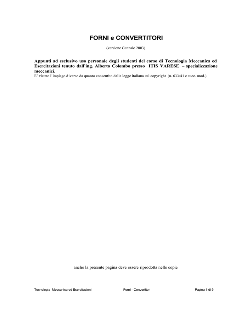 FORNI e CONVERTITORI (versione Gennaio 2003) Appunti ad esclusivo uso personale degli studenti del corso di Tecnologia Meccanica ed Esercitazioni tenuto dall’ing. Alberto Colombo presso ITIS VARESE – specializzazione meccanici. E’ vietato l’impiego diverso da quanto consentito dalla legge italiana sul copyright (n. 633/41 e succ. mod.) anche la presente pagina deve essere riprodotta nelle copie Tecnologia Meccanica ed Esercitazioni Forni - Convertitori Pagina 1 di 9 FORNI Forni elettrici ad arco Nei forni elettrici il riscaldamento avviene per mezzo dell'arco voltaico che scocca fra elettrodi di grafite, o fra elettrodi e bagno metallico. L'arco elettrico permette il raggiungimento di temperature assai elevate, fino a circa 2800°C. In alcuni forni (ad esempio il tipo Héroult) la suola non è conduttrice e la corrente elettrica passa da un elettrodo al bagno, lo attraversa e ritorna ad un altro elettrodo. In questi tipi di forno a riscaldamento diretto, gli elettrodi sono disposti verticalmente al disopra del bagno e passano attraverso la volta del forno; essi possono essere in numero diverso a seconda del tipo di corrente (monofase, trifase). Per forni di notevole grandezza ogni fase può essere collegata a più elettrodi connessi in parallelo. II forno è costituito da una parte cilindrica (laboratorio), che sì raccorda ad un fondo bombato, il tutto realizzato in muratura refrattaria e rivestito da una corazza d’acciaio che ha funzione portante. La volta del forno in materiali refrattari è mobile per consentire l'Introduzione della carica dall'alto. La suola del laboratorio è rivestita di dolomite in polvere pressata. II forno poggia su culle o cilindri di basculamento che ne consentono l'inclinazione in avanti e indietro per mezzo di un pistone idraulico (per eliminare la scoria e per effettuare la colata). II foro di colata si prolunga all'esterno con un becco che permette di colare l'acciaio nella siviera. Lateralmente vi sono una o due aperture per il controllo della colata e per le eventuali aggiunte e correzioni del bagno di metallo. Gli elettrodi di grafite, sorretti da bracci collegati ad una struttura indipendente dal forno, penetrano nel laboratorio attraverso le aperture praticate nella volta. La distanza degli elettrodi dal bagno è regolabile in altezza, al fine di poter variare l'ampiezza dell'arco e di compensare il consumo degli elettrodi. In altri forni (ad esempio il tipo Girod) la suola è conduttrice: l'arco scocca dall'elettrodo o dagli elettrodi soprastanti, passa attraverso il bagno e poi attraverso la suola collegata al polo negativo. Questo tipo di forno è meno usato, per gli elevati costi di manutenzione: il calore rilevante che si trasmette alla suola provoca un notevole deterioramento e richiede un raffreddamento energico. Tecnologia Meccanica ed Esercitazioni Forni - Convertitori Pagina 2 di 9 I forni elettrici sono impiegati per la produzione di ghisa madre, per la fusione e l’affinazione delle leghe metalliche, per la produzione di ferroleghe. Ovviamente le dimensioni saranno proporzionate al tipo d’impiego ed alle relative potenzialità. Permettono di produrre ghise e acciai di diverse qualità. Possono essere utilizzati anche con funzione di mescolatori e polmoni per le leghe fuse prodotte. Le cariche vengono generalmente introdotte allo stato solido. Nel caso della produzione di ghisa madre le reazioni coinvolte sono prevalentemente di riduzione diretta. Il calore viene fornito dall’energia elettrica. L’agente riducente è il carbonio fornito da relativamente piccole quantità di carbone coke (per ottenere ghisa esente da zolfo si può ricorrere a carbone di legna). Il consumo di carbone è in ogni caso ridotto. La carica può essere costituita da quantità molto variabili di minerale o di rottame industriale (di composizione nota). Un forno elettrico per la produzione di ghisa madre risulta una conveniente alternativa per il consumo di rottami. La ghisa madre prodotta, indicativamente, può andare dalle 70 alle 100 tonnellate/giorno (altoforno: 2000 – 4500 tonnellate/giorno). Per il calcolo dei costi di gestione, si tenga presente la seguente equazione empirica: 1 kg coke = 8 kWh. [quando il costo del kWh scende sotto 1/8 del costo del coke risulta conveniente il forno elettrico] II riscaldamento elettrico comporta i seguenti vantaggi: - possibilità di raggiungere temperature molto elevate, possibilità di regolare la tempe ratura, processo generalmente pulito (i gas prodotti richiedono comunque un trattamento ed hanno un elevato potere calorifico), assenza di azione chimica da parte dell'agente riscaldante, possibilità lavorare al di fuori del contatto dell'aria anche in atmosfere artificiali, o nel vuoto. Tecnologia Meccanica ed Esercitazioni Forni - Convertitori Pagina 3 di 9 Forni ad induzione I forni elettrici ad induzione funzionano secondo il seguente principio generale: il calore viene fornito per effetto Joule da un conduttore percorso da corrente elettrica (l’energia elettrica fornita si trasforma in calore) Q = RI2 = V2/R [J/s] Sono prevalentemente utilizzati come forni fusori e per la produzione di acciaio. Si possono avere forni elettrici ad induzione a bassa e ad alta frequenza. Questi forni (alimentati alla frequenza di rete) sono chiamati anche forni ad anello o a canale (per la forma caratteristica "a canale" in cui è contenuta la carica metallica). Essi funzionano secondo il principio del trasformatore industriale a corrente alternata il cui circuito secondario è costituito dalla carica da fondere. • l'avvolgimento primario è costituito da molte spire percorse da corrente a una tensione di 3 = 5 kV e frequenza di linea (50 Hz) avvolte su di un nucleo di ferro; • il secondario è costituito dalla carica metallica da fondere e trattare disposto ad anello. Questo secondario è equipaggiato con una sola spira in corto circuito percorsa da corrente indotta a elevatissima intensità e bassa tensione in g