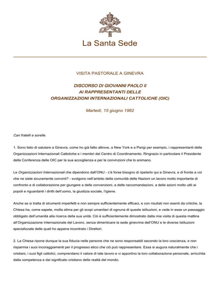 La Santa Sede VISITA PASTORALE A GINEVRA DISCORSO DI GIOVANNI PAOLO II AI RAPPRESENTANTI DELLE ORGANIZZAZIONI INTERNAZIONALI CATTOLICHE (OIC) Martedì, 15 giugno 1982 Cari fratelli e sorelle. 1. Sono lieto di salutare a Ginevra, come ho già fatto altrove, a New York e a Parigi per esempio, i rappresentanti delle Organizzazioni Internazionali Cattoliche e i membri del Centro di Coordinamento. Ringrazio in particolare il Presidente della Conferenza delle OIC per la sua accoglienza e per le convinzioni che lo animano. Le Organizzazioni Internazionali che dipendono dall’ONU - c’è forse bisogno di ripeterlo qui a Ginevra, e di fronte a voi che ne siete sicuramente convinti? - svolgono nell’ambito della comunità delle Nazioni un lavoro molto importante di confronto e di collaborazione per giungere a delle convenzioni, a delle raccomandazioni, a delle azioni molto utili ai popoli e riguardanti i diritti dell’uomo, la giustizia sociale, l’igiene. Anche se si tratta di strumenti imperfetti e non sempre sufficientemente efficaci, e con risultati non esenti da critiche, la Chiesa ha, come sapete, molta stima per gli scopi umanitari di ognuna di queste istituzioni, e vede in esse un passaggio obbligato dell’umanità alla ricerca della sua unità. Ciò è sufficientemente dimostrato dalla mia visita di questa mattina all’Organizzazione Internazionale del Lavoro, senza dimenticare la sede ginevrina dell’ONU e le diverse Istituzioni specializzate delle quali ho appena incontrato i Direttori. 2. La Chiesa ripone dunque la sua fiducia nelle persone che ne sono responsabili secondo la loro coscienza, e non risparmia i suoi incoraggiamenti per il progresso etico che ciò può rappresentare. Essa si augura naturalmente che i cristiani, i suoi figli cattolici, comprendano il valore di tale lavoro e vi apportino la loro collaborazione personale, arricchita dalla competenza e dal significato cristiano delle realtà del mondo. 2 Per questo motivo ho salutato con piacere i membri del Centro d’Informazione delle Organizzazioni Internazionali Cattoliche, in quanto credo che esso le sostenga nella fede e nell’amicizia, aiutandole tra l’altro ad assumere meglio a titolo personale, in quanto laici cristiani, le loro responsabilità nel loro servizio internazionale. Ma è ovvio che la presenza organica della Chiesa ha qui un’importanza primordiale. Ufficialmente la Santa Sede è rappresentata dal suo Osservatore permanente, che ho ringraziato insieme ai collaboratori di questa Missione permanente, i quali nonostante il loro numero esiguo svolgono un lavoro prezioso. Ma a un altro livello la Chiesa è presente mediante voi, rappresentanti delle OIC, la cui testimonianza ed azione a carattere associativo sono particolarmente importanti presso le Organizzazioni Internazionali, che tra l’altro vi riconoscono lo Statuto di organizzazioni non governative. Molte di queste OIC hanno qui il loro Segretariato Generale, altre hanno almeno un rappresentante qualificato a Ginevra o nei dintorni, incaricato di seguire a nome dell’Organizzazione a cui appartiene, le attività delle Nazioni Unite, e anche di prendere la parola. 3. Non posso certo elencare tutte queste OIC e neppure definire la linea d’azione di ciascuna di esse, poiché si tratta di elementi molto vari e complementari. Vorrei comunque esprimervi il mio incoraggiamento ed augurio, assicurandovi che senza le OIC mancherebbe qualcosa alla feconda vitalità della Chiesa e alla sua missione apostolica e profetica nella società internazionale contemporanea. In una parola vorrei definire il vostro carattere originale. Che cosa significa la cattolicità delle OIC? Significa prima di tutto che esse traggono il loro dinamismo vitale nelle fonti del Vangelo vissuto nella comunità della Chiesa. Nello stesso tempo l’aggettivo “cattolico” mette le vostre organizzazioni in relazione organica con la Chiesa e con il suo magistero. In questo senso voi siete legati da un vincolo particolare con la Santa Sede in quanto strumento della missione del Vescovo di Roma nei confronti della Chiesa universale. Ma voi avete un ruolo specifico che richiede un impegno originale. Potrei definirlo come la fase di mediazione tra il Vangelo e la società contemporanea, tra la Chiesa universale e la comunità delle Nazioni. Le OIC, in ragione della loro stessa esistenza e della loro presenza, costituiscono un elemento di questa mediazione, una cerniera per così dire tra la Chiesa cattolica e la società internazionale; e laddove la Chiesa in quanto tale non potrebbe intervenire perché si tratta di problemi tecnici, è qui che voi dovete intervenire. 4. Ciò può essere realizzato da voi, perché le vostre associazioni internazionali di laici cristiani vi permettono di raggruppare nel vostro campo di competenza una somma ragguardevole di riflessioni cristiane, di esperienza e di forza, provenienti dall’apporto di tutte le comunità ecclesiali, e di farne un uso responsabile e libero di fronte agli organismi intergovernativi. Non mi dilungherò sulle molteplici iniziative e interventi periodici che potrete intraprendere in caso di progetti precisi. Ma mi permetto di aggiungere che oltre a questo impegno cristiano concreto, o piuttosto al fine di permetterlo, le vostre OIC potranno costituire il luogo per una riflessione approfondita, indispensabile per un’azione a carattere internazionale, riguardante per esempio un concetto filosofico e giuridico della società internazionale, una teoria e un movimento 3 educativo al servizio della pace, un’etica applicata al nuovo ordine economico internazionale e al dialogo tra Nord e Sud, un’antropologia cristiana in favore dei diritti dell’uomo, la salvaguardia ed il funzionamento della famiglia e dei corpi intermedi, l’integrazione della legge di carità nella sfera delle relazioni internazionali, l’educazione delle coscienze e dell’opinione internazionale su diversi argomenti cruciali, tutto ciò richiede a