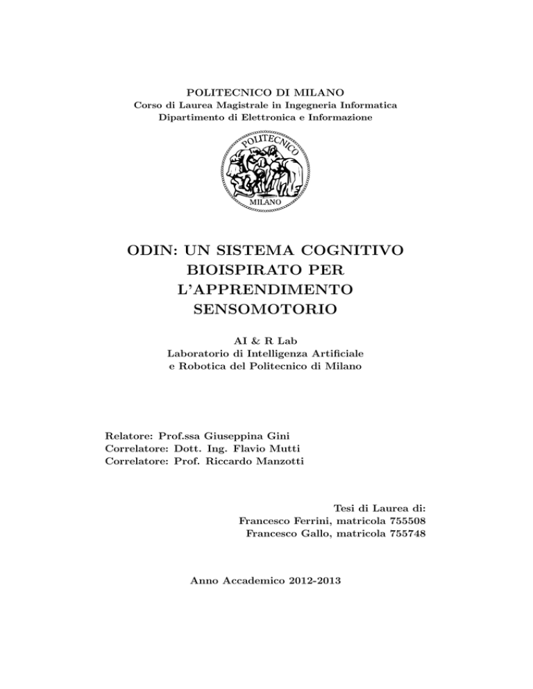 POLITECNICO DI MILANO Corso di Laurea Magistrale in Ingegneria Informatica Dipartimento di Elettronica e Informazione ODIN: UN SISTEMA COGNITIVO BIOISPIRATO PER L’APPRENDIMENTO SENSOMOTORIO AI & R Lab Laboratorio di Intelligenza Artificiale e Robotica del Politecnico di Milano Relatore: Prof.ssa Giuseppina Gini Correlatore: Dott. Ing. Flavio Mutti Correlatore: Prof. Riccardo Manzotti Tesi di Laurea di: Francesco Ferrini, matricola 755508 Francesco Gallo, matricola 755748 Anno Accademico 2012-2013 A chi c’è stato, sempre Sommario Nell’ambito della robotica si è sempre cercato di costruire degli agenti autonomi capaci di imitare le caratteristiche dell’essere umano. Partendo da architetture nelle quali il robot era costretto a comportarsi secondo regole rigide preimpostate al suo interno, si sono sviluppate nuove aree di ricerca basate sullo sviluppo cognitivo: la robotica bioispirata. Questa ha portato alla creazione di sistemi cognitivi capaci di evolversi ma ancora troppo semplici per poter collaborare con un sistema motorio bioispirato. Lo scopo della nostra tesi è di presentare una architettura bioispirata capace di imparare e gestire le informazioni sensoriali in modo da poter cooperare con un modello motorio bioispirato basato sul sistema composto da cervelletto, gangli della base e corteccia motoria. Abbiamo quindi costruito un modello motorio complesso dal quale abbiamo estrapolato le informazioni necessarie per lo sviluppo di una architettura cognitiva che abbiamo chiamato ODIN. I risultati ottenuti con gli esperimenti riguardanti i test di riconoscimento visivo e uditivo per il sistema proposto, hanno prodotto risultati molto incoraggianti per future sperimentazioni e integrazioni. I Ringraziamenti Francesco Il primo ringraziamento va a me stesso, per essere riuscito in qualcosa che a un certo punto non credevo più possibile. Ringrazio Valeria, la mia sorellina, con la quale ho instaurato un rapporto veramente bello, ora forza Vale, la prossima dottoressa sarai te! Grazie sister! Ringrazio la Marta, anche detta Mé, per tutto il sostegno ricevuto, la pazienza, la perseveranza, e il coraggio avuti nel sopportarmi in questi 6 anni e passa. Sei fantastica e unica! Ringrazio i miei genitori, Etta e Luciano, per la loro pazienza e per il loro appoggio incondizionato. Siete veramente delle rocce! Ringrazio Matteo perchè rende felice una delle tre donne più importanti della mia vita. Continua cosı̀ e migliorati sempre! Ringrazio in generale tutta la mia famiglia che mi è sempre stata vicino nei momenti più difficili della mia vita. Senza di voi non sarei assolutamente mai arrivato fin qui! Ringrazio Francesco perché questa tesi è di tutti e due e ce la meritiamo tantissimo entrambi. Allons-y Gillo! *pugnetto* Ringrazio Vittorio&Romana, grazie per avermi accolto in famiglia e avermi fatto sfuggire ogni tanto al grigiore milanese! Ringrazio la Professoressa Gini per avermi permesso di intraprendere il lavoro di tesi con Lei e per il supporto dato durante la stesura dell’elaborato. Grazie veramente! Ringrazio Flavio per tutto l’aiuto ricevuto e l’entusiasmo mostrato durante il lavoro svolto. Sei un grande, ma mi devi ancora insegnare a schiacciare! Ringrazio Riccardo per essere sempre stato entusiasta del lavoro che stavamo svolgendo. In bocca al lupo per l’esperinza all’MIT! Ringrazio Antonella, grazie a lei ogni mattinata partiva sempre con il sorriso sulla bocca. Grazie mille Anto! Ringrazio tutti gli amici milanesi, Simo per il suo essere troppo figo, Emil III perchè non sa guardare con gli occhi del serpente, Daniele perchè sta passando tanti esami e quindi farà una festa a casa sua, l’Ilaria perchè sopporta Daniele e non mi ha ancora insultato per la molestia dimostrata al suo matrimonio, Claudio perchè essere un Valderman con poteri illimitati non ha prezzo, Cesco perchè è sempre stato puntuale, Valentina per le avvincenti sfide tennistiche. Grazie veramente tanto anche a tutti voi! Ringrazio tutta la Solese, a partire dal presidente Carlo fino al magazziniere Lino, passando per tutti i compagni di squadra che ci sono e che sono passati, Tommy, Tia Carminiello, Ivan, Cagno, Riky, Cecco il tronista, Flavio il bello, Davidone&Ale (la coppia di fatto!), Mirko, Pietro, Kharja (anche detto Hamza), il grandissimo capitano Palu, Perro, Faso, Paolone, Luca, il bell’addormentato Furlo, il mister Uccelli e mister Pava, il DS Pino, il fisioterapista Ciccio che mi ha rimesso in sensto più di una volta, il guardialinee Vito e Pini, per l’avventura passata nella stagione 2011/2012, me la ricorderò a vita ne sono certo! Ringrazio Tommy & Tia anche per tutti i viaggi fatti insieme: Heads Will Roll! Ringrazio anche tutta l’Algo, il Polimi Calcio, Fiz, Sganz & Marco, Biase, Lore, Prema, Cesco, Luzzi, Lollo, e tutti gli altri, e l’Atletico PerNulla con il suo direttor. lup. mann. figl. di putt. Ing. Marco, perchè mi hanno fatto crescere come persona e come sportivo. Ringrazio enormemente tutti gli amici delle Marche, Tony&Elisa (tanto vi sposerete prima di me), Daniele&Valentina (tanto vi sposerete prima di me), Adriano&Chica (tanto vi sposerete prima di me), Pax&Vale (vi siete già sposati :) ), Malato&MalatinaFromHell (purtroppo so che non vi sposerete prima di me), Rezzolo, Manuel, Paolò & il suo peproncino, Ebola, Federico & La Locanda Del Riccio, Eros, Carlo, Peppe&Elena, Cif e le sue figure da cioccolataio, il Capo per tutte le volte che viene a fare il pollo alle partite di poker e tutti quelli che in qualche modo mi sono stati vicini tra Spiaggetta e scopa ladra che purtroppo mi sono certamente dimenticato, perchè ogni volta che sono tornato nelle mie amate Marche l’affetto è rimasto sempre immutato. Siete dei veri amici! Ringrazio Seby per tutti i suoi utilissimi consigli e soprattutto per tutte le volte che mi ha rimesso in sesto fisicamente. Grande accappatoio!!! Ringrazio tutti i professori che mi hanno concesso l’onore di avere qua