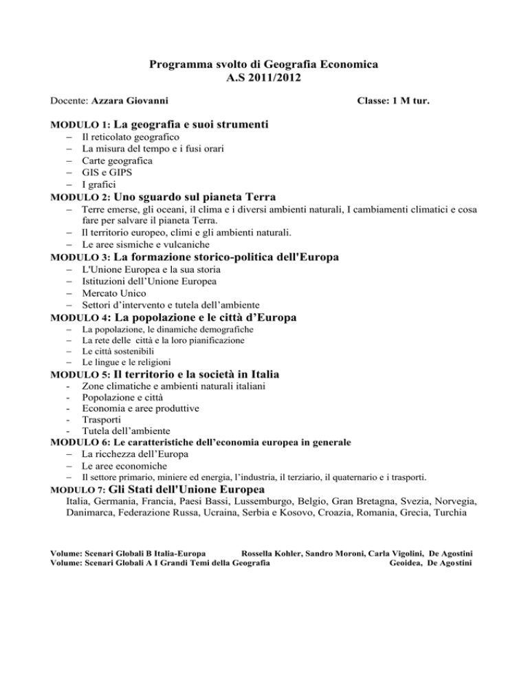 Programma svolto di Geografia Economica A.S 2011/2012 Docente: Azzara Giovanni Classe: 1 M tur. MODULO 1: La geografia e suoi strumenti Il reticolato geografico La misura del tempo e i fusi orari Carte geografica GIS e GIPS I grafici MODULO 2: Uno sguardo sul pianeta Terra Terre emerse, gli oceani, il clima e i diversi ambienti naturali, I cambiamenti climatici e cosa fare per salvare il pianeta Terra. Il territorio europeo, climi e gli ambienti naturali. Le aree sismiche e vulcaniche MODULO 3: La formazione storico-politica dell'Europa L'Unione Europea e la sua storia Istituzioni dell’Unione Europea Mercato Unico Settori d’intervento e tutela dell’ambiente MODULO 4: La popolazione e le città d’Europa La popolazione, le dinamiche demografiche La rete delle città e la loro pianificazione Le città sostenibili Le lingue e le religioni MODULO 5: Il territorio e la società in Italia - Zone climatiche e ambienti naturali italiani - Popolazione e città - Economia e aree produttive - Trasporti - Tutela dell’ambiente MODULO 6: Le caratteristiche dell’economia europea in generale La ricchezza dell’Europa Le aree economiche Il settore primario, miniere ed energia, l’industria, il terziario, il quaternario e i trasporti. MODULO 7: Gli Stati dell'Unione Europea Italia, Germania, Francia, Paesi Bassi, Lussemburgo, Belgio, Gran Bretagna, Svezia, Norvegia, Danimarca, Federazione Russa, Ucraina, Serbia e Kosovo, Croazia, Romania, Grecia, Turchia Volume: Scenari Globali B Italia-Europa Rossella Kohler, Sandro Moroni, Carla Vigolini, De Agostini Volume: Scenari Globali A I Grandi Temi della Geografia Geoidea, De Agostini