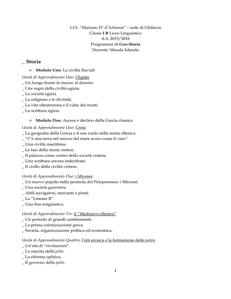 I.I.S. “Mariano IV d’Arborea” – sede di Ghilarza Classe I B Liceo Linguistico A.S. 2015/2016 Programma di Geo-Storia Docente: Masala Iolanda _ Storia • Modulo Uno: Le civiltà fluviali Unità di Apprendimento Uno: l’Egitto _ Un lungo fiume in mezzo al deserto. _ I tre regni della civiltà egizia. _ La società egizia. _ La religione e le divinità. _ La vita ultraterrena e il culto dei morti. _ La scrittura egizia. • Modulo Due: Ascesa e declino della Grecia classica Unità di Apprendimento Uno: Creta _ La geografia della Grecia e il suo ruolo nella storia ellenica. _ “C’è una terra nel mezzo del mare scuro come il vino”. _ Una civiltà marittima. _ Le fasi della storia cretese. _ Il palazzo come centro della società cretese. _ Una scrittura ancora indecifrata. _ Il crollo della civiltà cretese. Unità di Apprendimento Due: i Micenei _ Un nuovo popolo nella penisola del Peloponneso: i Micenei. _ Una società guerriera. _ Abili navigatori, mercanti e pirati. _ La “Lineare B”. _ Una fine enigmatica. Unità di Apprendimento Tre: il “Medioevo ellenico” _ Un periodo di grandi cambiamenti. _ La prima colonizzazione greca. _ Società, organizzazione politica ed economica. Unità di Apprendimento Quattro: l’età arcaica e la formazione delle poleis _ Un’età di “rivoluzioni”. _ La nascita della polis. _ La riforma oplitica. _ Il governo della polis. 1 _ Il diritto alla cittadinanza. _ La struttura urbana della polis. Unità di Apprendimento Cinque: la seconda colonizzazione _ I motivi e i luoghi dell’espansione. Unità di Apprendimento Sei: l’identità comune del mondo ellenico _ Una comune identità culturale. _ La concezione religiosa greca. _ Riti e santuari. _ Le Olimpiadi. _ Il patrimonio culturale. Unità di Apprendimento Sette: Sparta _ Le caratteristiche del territorio. _ La fondazione di Sparta e la conquista della Messenia. _ La costituzione spartana: gli spartiati; i perieci; gli iloti; l’ordinamento politico spartano; monarchia, democrazia o oligarchia? _ Il sistema educativo a Sparta: gli spartani proprietà dello Stato; le donne a Sparta. Unità di Apprendimento Otto: Atene _ L’Attica e la fondazione di Atene. _ Le prime organizzazioni sociali e politiche. _ I conflitti tra aristocrazia e demos. _ La democrazia ateniese: la riduzione dell’arbitrio aristocratico e le prime leggi scritte; Solone; la tirannide; la fine della tirannide; Clistene. Unità di Apprendimento Nove: i Persiani _ I Persiani. _ Il difficile rapporto tra i Persiani e le poleis greche: le colonie greche sotto il dominio persiano; la rivolta di Mileto. _ La Prima guerra persiana. _ La Seconda guerra persiana. 2 Unità di Apprendimento Dieci: l’ “età di Pericle” _ L’Atene democratica di Pericle. _ Le riforme nell’ottica della democrazia. _ Il “grande costruttore”. _ Lo scontro con i Persiani e con Sparta. _ Atene e l’ “Età classica” della Grecia. _ La funzione etica e civile del teatro. Unità di Apprendimento Undici: la Guerra del Peloponneso _ Il conflitto e le sue cause. _ La guerra archidamica. _ La “fase intermedia”. _ Il fallimento della spedizione in Sicilia. _ La guerra deceleica. _ La sconfitta di Atene e le dure condizioni di pace. Unità di Apprendimento Dodici: i Macedoni _ Dai Margini al centro della grecità. Unità di Apprendimento Tredici: l’ “Età di Alessandro” _ Alessandro prosegue il progetto paterno. _ Le vittorie di Alessandro contro i Persiani. _ La sconfitta di Dario e l’organizzazione dell’Impero. _ Verso i confini del mondo conosciuto. _ Il faticoso ritorno e la morte improvvisa di Alessandro. Unità di Apprendimento Quattordici: l’Ellenismo _ I Regni ellenistici. _ L’ellenismo. • Modulo Tre: Roma Unità di Apprendimento Uno: la nascita di Roma e della sua potenza _ Le origini di Roma. _ La monarchia. _ Le istituzioni monarchiche. _ Società e religione: la famiglia; gentes, patrizi e plebei; la religione. _ Le istituzioni repubblicane: il consolato; il Senato; le altre magistrature; le assemblee dei cittadini. 3 _ Le lotte tra i patrizi e i plebei. _ I plebei ottengono dei diritti. _ La conquista della penisola italica: l’espansione nel Lazio e la guerra contro i Sanniti; la guerra contro Taranto e Pirro. Unità di Apprendimento Due: le guerre puniche _ Le ragioni dello scontro tra Roma e Cartagine. _ La Prima guerra punica. _ La Seconda guerra punica. _ La Terza guerra punica. Unità di Apprendimento Tre: la conquista della Grecia _ Gli scontri con la Macedonia. _ La conquista della Grecia. Unità di Apprendimento Quattro: l’economia schiavista _ La condizione degli schiavi. _ Le rivolte degli schiavi. _ L’incontro con l’ellenismo. Unità di Apprendimento Cinque: la crisi della repubblica _ La crisi economica e sociale del II (secondo) secolo a.C. _ Tiberio Gracco. _ Gaio Gracco. _ La crisi militare del II (secondo) secolo a.C. _ Mario, un homo novus. _ La riforma dell’esercito. _ Geografia • Modulo Uno: Conoscere il nostro pianeta per rispettarlo Unità di Apprendimento Uno: i climi e gli ambienti della terra _ “Tempo meteorologico” e “clima” non sono sinonimi. _ I fattori che determinano il clima. _ Le cause dei cambiamenti climatici. _ Le conseguenze dell’effetto serra. _ Gli scenari futuri. Unità di Apprendimento Due: risorse energetiche _ Le risorse naturali del nostro pianeta. _ Le risorse energetiche non rinnovabili. _ Le risorse energetiche rinnovabili e potenzialmente rinnovabili. Unità di Apprendimento Tre: l’acqua: una risorsa che si riduce 4 _ Il “Pianeta blu”. _ Perché l’acqua è considerata “oro blu”. _ “Water wars”: le guerre dell’acqua. • Modulo Due: L’organizzazione della vita umana sulla Terra Unità di Apprendimento Uno: popolazione e questione demografica _ Il pianeta va verso un’esplosione demografica? _ La distribuzione della popolazione sulla Terra. _ I flussi migratori. Unità di Apprendimento Due: alimentazione e salute _ Mal