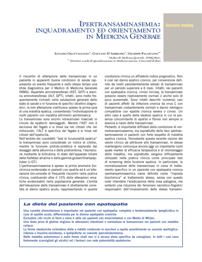 IPERTRANSAMINASEMIA: INQUADRAMENTO ED ORIENTAMENTO IN MEDICINA GENERALE Decision making IGNAZIO GRATTAGLIANO*, GAETANO D’AMBROSIO*, GIUSEPPE PALASCIANO** ** * Medico di Medicina Generale, SIMG Bari; Direttore scuola di specializzazione in Medicina interna, Università di Bari Il riscontro di alterazione delle transaminasi in un paziente in apparenti buone condizioni di salute rappresenta un evento frequente e nello stesso tempo una sfida diagnostica per il Medico di Medicina Generale (MMG). Aspartato aminotransferasi (AST, GOT) e alanina aminotransferasi (ALT, GPT), infatti, sono molto frequentemente richiesti nella valutazione generale dello stato di salute o in funzione di specifici obiettivi diagnostici; la loro alterazione costituisce spesso la prima spia di una malattia epatica, consentendo l’individuazione di molti pazienti con malattia altrimenti asintomatica. Le transaminasi sono enzimi intracellulari rilasciati in circolo da epatociti danneggiati. Mentre l’AST non è esclusiva del fegato e si trova sia nel citosol che nei mitocondri, l’ALT è specifica del fegato e si trova nel citosol dell’epatocita. Nell’ambito dei cosiddetti “test di funzionalità epatica” le transaminasi sono considerate un indice di citolisi, mentre la funzione protido-sintetica è esplorata dal dosaggio della albumina e della protrombina; l’escrezione mediante la bilirubina; lo stato dell’apparato biliare dalla fosfatasi alcalina e dalla gamma-glutamiltranspeptidasi (γ-GT). L’ipertransaminasemia è spesso la prima anomalia biochimica evidenziata in pazienti con epatite ed è un’alterazione bio-umorale di frequente riscontro nella pratica clinica, costituendo oltre il 15% delle alterazioni ematiche evidenziabili nella popolazione generale. L’entità dell’elevazione delle transaminasi è strettamente correlata al danno epatico acuto, rappresentando in questa condizione clinica un affidabile indice prognostico. Non è così nel danno epatico cronico, per convenzione definito da livelli persistentemente elevati di transaminasi per un periodo superiore a 6 mesi. Infatti, nei pazienti con epatopatia cronica, cirrosi inclusa, le transaminasi possono essere ripetutamente normali o anche solo di poco aumentate. Sono infatti descritti numerosi casi di pazienti affetti da infezione cronica da virus C con transaminasi costantemente normali e danno istologico compatibile con epatite cronica severa o cirrosi. Un altro caso è quello della steatosi epatica in cui la presenza concomitante di epatite e fibrosi non sempre si associa a rialzo delle transaminasi. Pertanto, è importante diffidare della condizione di normotransaminasemia, ma soprattutto delle lievi ipertransaminasemie in pazienti con forte sospetto di malattia epatica cronica. Nonostante questa recente visione del valore clinico da attribuire alle transaminasi, le stesse mantengono comunque ancora oggi un importante ruolo quale marker di efficacia terapeutica e di monitoraggio della malattia, ma soprattutto vengono diffusamente utilizzate nella pratica clinica come principale test di screening della funzione epatica. In particolare, la normalizzazione delle transaminasi in corso di trattamento specifico in un paziente con epatopatia cronica ipertransaminasemica viene definita come “risposta biochimica” al trattamento stesso, senza con questo voler intendere l’eradicazione della noxa patogena, ma soltanto una riduzione dei fenomeni necrotico-flogistici responsabili dell’innalzamento delle stesse transami- La dieta del paziente con epatopatia Una corretta alimentazione è importante nel paziente con epatopatia: completa e tendenzialmente iperglicidica in caso di epatite acuta, differenziata per le diverse epatopatie croniche. Escludere cibi ricchi in ferro o rame è utile nei pazienti con emocromatosi o con Morbo di Wilson. Una dieta priva di glutine migliora le alterazioni intestinali e normalizza le transaminasi nei pazienti con malattia celiaca. Le forme steatosiche richiedono diete a ridotto contenuto in zuccheri a rapido assorbimento se sussiste ipertrigliceridemia o insulino-resistenza, o ipolipidiche se coesiste ipercolesterolemia. Nelle malattie autoimmuni e nelle forme virali non vi è alcuna dieta specifica da consigliare. In tutti i casi sono fortemente sconsigliati gli alcolici ed i farmaci con note potenzialità epatolesive. 28 nasi. Nella epatiti virali croniche, la normalizzazione delle transaminasi ha un significato prognostico favorevole in merito alla terapia utilizzata. Assolutamente inaffidabile è invece il comportamento delle transaminasi se le si volesse utilizzare quale marcatore di monitoraggio della epatopatia cronica. Infatti, come dimostrato, pazienti con normali livelli di transaminasi possono avere anche una cirrosi. Ciò nonostante un importante rialzo delle transaminasi (oltre 4-5 volte il valore medio presentato di frequente dal paziente) in un soggetto affetto da epatopatia cronica evoluta deve far temere una riacutizzazione della infezione virale o la comparsa di complicanze (epatocarcinoma, colestasi). Infine, il valore attribuibile alle transaminasi quale test di screening resta inalterato nel caso si voglia indagare la presenza/assenza aspecifica di epatopatia; tuttavia, la ricerca diretta del virus o di anticorpi anti-virus rappresenta invece un marcatore molto più sensibile nel caso si voglia ricercare una infezione specifica in una determinata popolazione di soggetti. Diversi studi clinico-istologici hanno provato a valutare l’entità dell’alterazione istologica epatica in presenza di elevazione cronica delle transaminasi sieriche. In un studio di Daniel et al. del 1999, condotto raccogliendo dati su 1.124 pazienti con ipertransaminasemia cronica e sottoposti a biopsia epatica, veniva evidenziato come il 50% dei soggetti presentasse steatosi semplice, il 20% steatoepatite, il 5% fibrosi, il 2,5% cirrosi ed il 10% un’istologia quasi normale. Le cause per cui i pazienti con ipertr