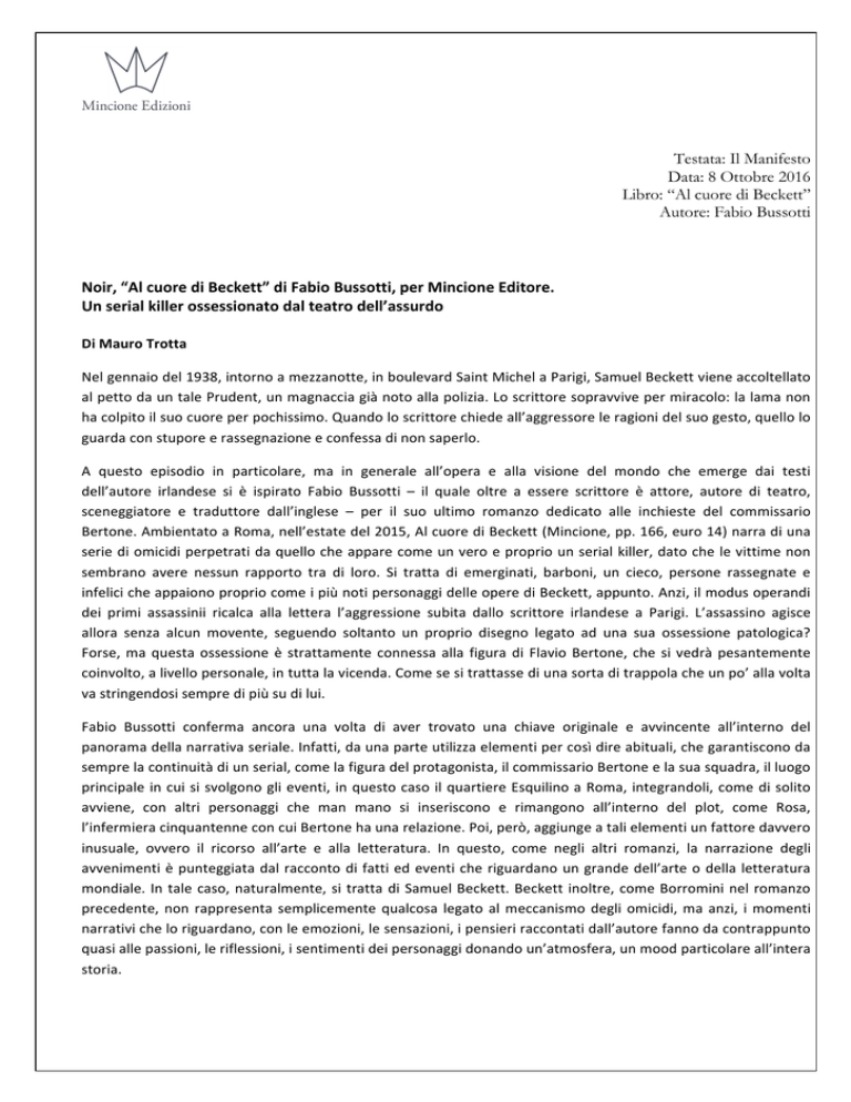 Testata: Il Manifesto Data: 8 Ottobre 2016 Libro: “Al cuore di Beckett” Autore: Fabio Bussotti Noir,“AlcuorediBeckett”diFabioBussotti,perMincioneEditore. Unserialkillerossessionatodalteatrodell’assurdo DiMauroTrotta Nelgennaiodel1938,intornoamezzanotte,inboulevardSaintMichelaParigi,SamuelBeckettvieneaccoltellato alpettodauntalePrudent,unmagnacciagiànotoallapolizia.Loscrittoresopravvivepermiracolo:lalamanon hacolpitoilsuocuoreperpochissimo.Quandoloscrittorechiedeall’aggressoreleragionidelsuogesto,quellolo guardaconstuporeerassegnazioneeconfessadinonsaperlo. A questo episodio in particolare, ma in generale all’opera e alla visione del mondo che emerge dai testi dell’autore irlandese si è ispirato Fabio Bussotti – il quale oltre a essere scrittore è attore, autore di teatro, sceneggiatore e traduttore dall’inglese – per il suo ultimo romanzo dedicato alle inchieste del commissario Bertone.AmbientatoaRoma,nell’estatedel2015,AlcuorediBeckett(Mincione,pp.166,euro14)narradiuna seriediomicidiperpetratidaquellocheapparecomeunveroepropriounserialkiller,datochelevittimenon sembrano avere nessun rapporto tra di loro. Si tratta di emerginati, barboni, un cieco, persone rassegnate e infelicicheappaionopropriocomeipiùnotipersonaggidelleoperediBeckett,appunto.Anzi,ilmodusoperandi dei primi assassinii ricalca alla lettera l’aggressione subita dallo scrittore irlandese a Parigi. L’assassino agisce allora senza alcun movente, seguendo soltanto un proprio disegno legato ad una sua ossessione patologica? Forse, ma questa ossessione è strattamente connessa alla figura di Flavio Bertone, che si vedrà pesantemente coinvolto,alivellopersonale,intuttalavicenda.Comesesitrattassediunasortaditrappolacheunpo’allavolta vastringendosisempredipiùsudilui. Fabio Bussotti conferma ancora una volta di aver trovato una chiave originale e avvincente all’interno del panoramadellanarrativaseriale.Infatti,daunaparteutilizzaelementipercosìdireabituali,chegarantisconoda semprelacontinuitàdiunserial,comelafiguradelprotagonista,ilcommissarioBertoneelasuasquadra,illuogo principaleincuisisvolgonoglieventi,inquestocasoilquartiereEsquilinoaRoma,integrandoli,comedisolito avviene, con altri personaggi che man mano si inseriscono e rimangono all’interno del plot, come Rosa, l’infermieracinquantenneconcuiBertonehaunarelazione.Poi,però,aggiungeatalielementiunfattoredavvero inusuale, ovvero il ricorso all’arte e alla letteratura. In questo, come negli altri romanzi, la narrazione degli avvenimentièpunteggiatadalraccontodifattiedeventicheriguardanoungrandedell’arteodellaletteratura mondiale. In tale caso, naturalmente, si tratta di Samuel Beckett. Beckett inoltre, come Borromini nel romanzo precedente, non rappresenta semplicemente qualcosa legato al meccanismo degli omicidi, ma anzi, i momenti narrativicheloriguardano,conleemozioni,lesensazioni,ipensieriraccontatidall’autorefannodacontrappunto quasiallepassioni,leriflessioni,isentimentideipersonaggidonandoun’atmosfera,unmoodparticolareall’intera storia. Non solo, è come se la visione dell’artista – naturalmente secondo l’interpretazione offerta da Bussotti – avvolgesse e penetrasse il racconto, contribuendo ad offrire un’interpretazione della realtà insolita e originale. Senelromanzoprecedentemoltieranoirimandiadaltreopered’ingegnoeadaltriautori,inquestocasoècome setuttosiconcentrassequasiesclusivamentesull’universobeckettiano. L’autorearrivaariportarequalchebranotrattodaAspettandoGodot,uno,inparticolarepresentandolocomeun dialogotralostessoBeckettelasuacompagna,SuzanneDechevaux-Dumesnil.Naturalmente,comeinogniopera seriale che si rispetti, oltre alla storia principale, quella degli omicidi, si sviluppano prendendo nuove direzioni anche le sottotrame, in particolare quella, estremamente realistica e delicata, legata alla storia d’amore tra il commissario e Rosa, l’infermiera cinquantenne. Il tutto narrato con la solita maestria dimostrata già nei precedentiromanzidall’autore,graziesoprattuttoaunascritturasemplice,tesaeavvincentemaassolutamente ingradodimisurarsinonsoloconlasuspencetipicadelnoir,maancheconquestionimoltopiùcomplessecome quellelegateallaweltanschauungeallapoeticadiunoscrittorecomeSamuelBeckett.