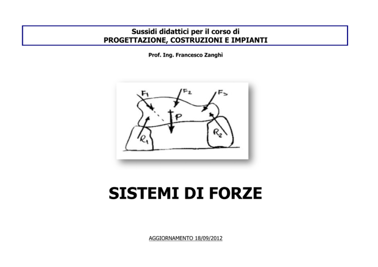 Sussidi didattici per il corso di PROGETTAZIONE, COSTRUZIONI E IMPIANTI Prof. Ing. Francesco Zanghì SISTEMI DI FORZE AGGIORNAMENTO 18/09/2012 Corso di PROGETTAZIONE, COSTRUZIONI E IMPIANTI Prof. Ing. Francesco Zanghì SISTEMA INTERNAZIONALE DI UNITA’ E’ stato adottato anche in Italia con il DPR 12/08/1982 n° 802. Le grandezze che utilizzeremo sono le seguenti: PRINCIPALI UNITÀ DI MISURA DERIVATE Quando l’uso delle unità del Sistema Internazionale non risulta pratico, si introducono multipli e sottomultipli: Le leggi fisiche fondamentali che correlano tra loro le grandezze suddette sono: forza = massa x accelerazione (Forza Peso = massa x accelerazione di gravità): f = m x a = Kg m/s2 ( N ) pressione = forza / superficie da cui 1 Pa = 1 N/m² 1 MPa = 1000 KPa = 1 N/mm² 2 Corso di PROGETTAZIONE, COSTRUZIONI E IMPIANTI Prof. Ing. Francesco Zanghì GRANDEZZE SCALARI E VETTORIALI Le grandezze scalari sono quelle grandezze che sono completamente caratterizzate, definite, da un solo numero rispetto ad una unità di misura prescelta. Temperatura Pressione Volume Le grandezze vettoriali sono ono definite da una direzione, un verso, un’ intensità (o modulo) ed un eventuale punto di applicazione. Spostamento 3 Forza Corso di PROGETTAZIONE, COSTRUZIONI E IMPIANTI Prof. Ing. Francesco Zanghì CARICO CONCENTRATO 4 Corso di PROGETTAZIONE, COSTRUZIONI E IMPIANTI Prof. Ing. Francesco Zanghì CARICO RIPARTITO 5 Corso di PROGETTAZIONE, COSTRUZIONI E IMPIANTI Prof. Ing. Francesco Zanghì CARICO VARIABILE O ACCIDENTALE VENTO TRAFFICO NEVE FOLLA COMPATTA 6 SISMA CARICHI TERMICI Corso di PROGETTAZIONE, COSTRUZIONI E IMPIANTI Prof. Ing. Francesco Zanghì OPERAZIONI SULLE FORZE COMPOSIZIONE DI FORZE AVENTI LA STESSA DIREZIONE F1=2000 N; F2=3000 N COMPOSIZIONE DI DUE FORZE CONCORRENTI IN UN PUNTO (Teorema di Carnot) COMPOSIZIONE DI PIU’ FORZE CONCORRENTI IN UN PUNTO (Poligono delle forze) 7 Corso di PROGETTAZIONE, COSTRUZIONI E IMPIANTI Prof. Ing. Francesco Zanghì COMPOSIZIONE DI FORZE COMPLANARI COMUNQUE DISPOSTE (Poligono funicolare e poligono delle forze) La FUNICOLARE è la curva secondo la quale si dispone una fune fissata alle estremità, quando sia soggetta a forze complanari distribuite con continuità. La sua forma varia con la distribuzione dei carichi, rappresentandone sempre la configurazione di equilibrio. La curva funicolare è in pratica un poligono funicolare con un numero infinito di lati. 8 Corso di PROGETTAZIONE, COSTRUZIONI E IMPIANTI Prof. Ing. Francesco Zanghì COMPOSIZIONE DI FORZE COMPLANARI PARALLELE 9 Corso di PROGETTAZIONE, COSTRUZIONI E IMPIANTI Prof. Ing. Francesco Zanghì MOMENTO DI UNA FORZA Il momento M di una forza F rispetto a un punto P complanare con la forza stessa è dato dal prodotto del modulo della forza per la distanza d del punto P dalla retta d’azione della forza. M=F b = F r Sin α MOMENTO DI UNA COPPIA: M = F d 10 Corso di PROGETTAZIONE, COSTRUZIONI E IMPIANTI Prof. Ing. Francesco Zanghì MOMENTO DI UN SISTEMA DI FORZE Teorema di Varignon "Il momento di un sistema di vettori rispetto ad un punto, è uguale al momento del vettore risultante rispetto allo stesso punto." 11 Corso di PROGETTAZIONE, COSTRUZIONI E IMPIANTI Prof. Ing. Francesco Zanghì TRASPORTO DI UNA FORZA Se si trasporta una Forza f dalla propria retta d’azione ad un’altra retta d’azione parallela alla precedente ad alla distanza “d” da questa, si ottiene una nuova Forza: F’ = F ed una “COPPIA DI TRASPORTO”: M = F× d. ESEMPIO: 12 Corso di PROGETTAZIONE, COSTRUZIONI E IMPIANTI Prof. Ing. Francesco Zanghì Fonti • • • Sergio Curioni - Richiami di statica grafica – Università di Bologna Leonardo Rinaudo – Appunti di Statica grafica Pietro La Porta - Composizione e scomposizione di forze complanari, Appunti di Statica 13