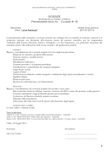 Universita’ DEGLI STUDI DELLA Tuscia Facoltà di Scienze M.M.F.F.N.N. Corso di Laurea in EDUCAZIONE E DIVULGAZIONE AMBIENTALE ------------------------------------------- BIOLOGIA GENERALE (C.F.U. 5) A) TITOLARE: Dott. ssa Simona PICCHIETTI B) PROGRAMMA La chimica della vita Acqua e vita. Molecole organiche: struttura e funzioni biologiche di carboidrati, lipidi, proteine e acidi nucleici. La cellula La cellula eucariota e procariota. La membrana cellulare: struttura e funzioni. La parete cellulare. I ribosomi, i mitocondri e i cloroplasti. Il sistema delle membrane interne e il citoscheletro. Il nucleo e i suoi componenti molecolari. La riproduzione cellulare. L’ereditarietà e l’informazione Replicazione e riparazione del DNA. Meiosi e ricombinazione genetica. Trasferimento di informazione genetica dal DNA alle proteine: sintesi proteica. Codice genetico. Le mutazioni. Espressione genica e proprietà cellulari. Il flusso energetico e il metabolismo Ruolo dell’ATP nel flusso energetico. Autotrofia ed eterotrofia. Respirazione cellulare aerobia ed anaerobia. Fotosintesi clorofilliana (cenni). L’Evoluzione Le diverse fasi dell’origine della vita. Evoluzione abiologica. Generazione spontanea. Evoluzione biologica: creazionismo ed evoluzionismo. Storia delle teorie evolutive. La teoria della selezione naturale. La nuova sintesi ed attuali teorie evolutive. Adattamenti. Micro e macroevoluzione. Cenni di genetica di popolazione e fattori di microevoluzione. Variazione ereditaria: genotipo e fenotipo. La selezione: selezione divergente, stabilizzante, direzionale. La selezione sessuale. La specie Specie tipologica e specie biologica. L’origine delle specie. Meccanismi di isolamento riproduttivo. Speciazione allopatica, simpatica e parapatrica. Origine dei taxa superiori (gradualismo filetico). Teoria degli equilibri intermittenti. Rapporti intra e interspecifici: predazione, parassitismo, competizione, simbiosi, coevoluzione, adattamenti, radiazione adattativa, mimetismo e criptismo. L’organismo Riproduzione asessuata e sessuata. Gametogenesi. Fecondazione e attivazione dell’uovo. Sviluppo embrionale: segmentazione, gastrulazione e formazione dei foglietti embrionali. Organogenesi (cenni). Superficie del corpo e sistemi di sostegno. Apparato respiratorio e circolatorio. Escrezione e regolazione osmotica. Nutrizione. Sistema nervoso e organi di senso. La filogenesi e la sistematica dei viventi Cenni di nomenclatura e tassonomia. Classificazione biologica degli organismi e processi evolutivi. Rapporti filogenetici. La diversità della vita Batteri e virus (cenni). L’origine degli eucarioti. I protisti. Piante superiori e colonizzazione dell’ambiente terrestre. I funghi: organismi specializzati nel riciclaggio. Protostomi e deuterostomi. TESTI CONSIGLIATI All’inizio del Corso la docente presenterà e discuterà con gli studenti i testi attinenti al corso stesso. COLLOQUIO DI INFORMATICA (C.F.U. 4) A) TITOLARE: Dott. Paolo SENSINI B) PROGRAMMA: Scopo del corso Permettere un utilizzo del computer che sia cosciente della struttura della macchina, senza doverne peraltro conoscere i dettagli tecnologici. Lintroduzione analizza il quadro che storicamente porta alla realizzazione degli attuali computer, in modo da chiarire i concetti alla base del calcolo automatico e rendere maggiormente comprensibili gli attuali orientamenti dell’informatica. Successivamente si introducano i concetti di modello e algoritmo. Si inizia quindi ad individuare tutte le componenti logiche di un computer, le loro funzioni e le loro interazioni, anche in relazione ai sistemi operativi. Un breve cenno ai linguaggi di programmazione e alle basi dati precede la trattazione delle interfacce uomo macchina, per giungere all’utilizzo pratico di alcuni pacchetti software standard. Il corso termina formando le nozioni di base relative ad Internet ed alla sua fruizione. 1- Breve storia del computer Pascal Von Neuman Turing Eniac 2 - Algoritmi e modelli Concetto di modello Von Neuman Turing Eniac 3 - Le componenti logiche del computer Unità centrale Memoria Centrale Memorie di massa Periferiche: stampanti, scanner, modem, etc. 4 - Il sistema operativo Funzione dei sistemi operativi Principali sistmi operativi: DOS, Linux, MS Windows, etc. 5 - I linguaggi di programmazione Cosa è un linguaggio di programmazione Codice macchina I principali linguaggi Basic C Fortran Cenni su altre famiglie di linguaggi 6 - Le basi dati Lmemorizzazione dei dati Il file system e la sua organizzazione File sequenziali - Basi di dati gerarchiche e relazionali Ipertesti e ipermedia HTML 7 - Le interfacce utente Le interfacce alfanumeriche: interazione tramite comandi Le interfacce grafiche: interazione tramite mouse 8 - Uso di pacchetti standard Utilizzo di MS-Word Utilizzo di Excel Utilizzo di Powerpoint Utilizzo di Internet Explorer 9 - I computer in rete Cosa è una rete di computer Internet Ftp, E-mail, Siti Esercitazuini ( 1o2 da definire ) Avranno lo scopo di verificare l’effettivo apprendimento delle parti di corso squisitamente più pratiche. Verteranno quindi sull’utilizzo dell’interfaccia e sulla padronanza dei pacchetti standard. Si effettuèrà anche una verifica sulle capacità di navigazione in Internet. Materiale didattico Parte del materiale verrà reso disponibile durante il corso in forma di dispense. Per il resto si utilizzerà il testo: “ Il testo e il Computer” di Giuseppe Gigliozzi, Bruno Mondadori, Milano 1997. COMPLEMENTI DI FISICA (C.F.U. 6) A) TITOLARE: Dott. Daniele MAROCCO B) PROGRAMMA: MECCANICA DEL PUNTO MATERIALE LE MISURE Misura delle grandezze fisiche. Il sistema internazionale delle unità di misura ed i campioni di tempo lunghezza e massa. Dimensioni delle grandezze fisiche. CINEMATICA DEL PUNTO MATERIALE Elementi di Calcolo vettoriale: definizione di vettore, somma e prodotto di vettori. Spostamento, velocità ed accelerazione. Moto rettilineo uniforme, uniformemente accelerato e circol