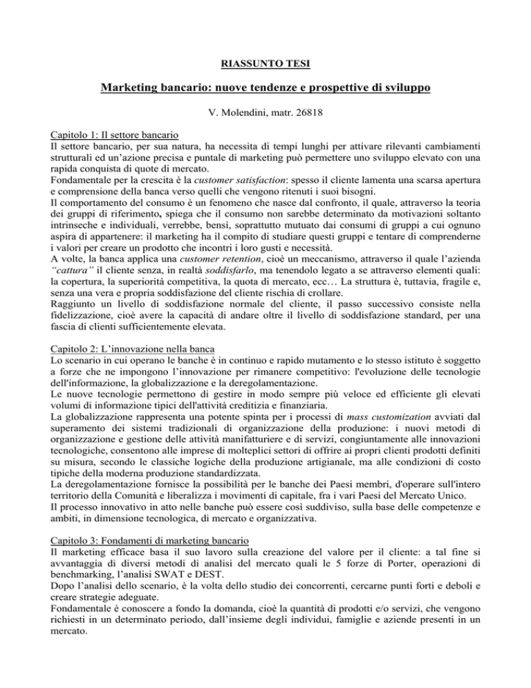 RIASSUNTO TESI Marketing bancario: nuove tendenze e prospettive di sviluppo V. Molendini, matr. 26818 Capitolo 1: Il settore bancario Il settore bancario, per sua natura, ha necessita di tempi lunghi per attivare rilevanti cambiamenti strutturali ed un’azione precisa e puntale di marketing può permettere uno sviluppo elevato con una rapida conquista di quote di mercato. Fondamentale per la crescita è la customer satisfaction: spesso il cliente lamenta una scarsa apertura e comprensione della banca verso quelli che vengono ritenuti i suoi bisogni. Il comportamento del consumo è un fenomeno che nasce dal confronto, il quale, attraverso la teoria dei gruppi di riferimento, spiega che il consumo non sarebbe determinato da motivazioni soltanto intrinseche e individuali, verrebbe, bensì, soprattutto mutuato dai consumi di gruppi a cui ognuno aspira di appartenere: il marketing ha il compito di studiare questi gruppi e tentare di comprenderne i valori per creare un prodotto che incontri i loro gusti e necessità. A volte, la banca applica una customer retention, cioè un meccanismo, attraverso il quale l’azienda “cattura” il cliente senza, in realtà soddisfarlo, ma tenendolo legato a se attraverso elementi quali: la copertura, la superiorità competitiva, la quota di mercato, ecc… La struttura è, tuttavia, fragile e, senza una vera e propria soddisfazione del cliente rischia di crollare. Raggiunto un livello di soddisfazione normale del cliente, il passo successivo consiste nella fidelizzazione, cioè avere la capacità di andare oltre il livello di soddisfazione standard, per una fascia di clienti sufficientemente elevata. Capitolo 2: L’innovazione nella banca Lo scenario in cui operano le banche è in continuo e rapido mutamento e lo stesso istituto è soggetto a forze che ne impongono l’innovazione per rimanere competitivo: l'evoluzione delle tecnologie dell'informazione, la globalizzazione e la deregolamentazione. Le nuove tecnologie permettono di gestire in modo sempre più veloce ed efficiente gli elevati volumi di informazione tipici dell'attività creditizia e finanziaria. La globalizzazione rappresenta una potente spinta per i processi di mass customization avviati dal superamento dei sistemi tradizionali di organizzazione della produzione: i nuovi metodi di organizzazione e gestione delle attività manifatturiere e di servizi, congiuntamente alle innovazioni tecnologiche, consentono alle imprese di molteplici settori di offrire ai propri clienti prodotti definiti su misura, secondo le classiche logiche della produzione artigianale, ma alle condizioni di costo tipiche della moderna produzione standardizzata. La deregolamentazione fornisce la possibilità per le banche dei Paesi membri, d'operare sull'intero territorio della Comunità e liberalizza i movimenti di capitale, fra i vari Paesi del Mercato Unico. Il processo innovativo in atto nelle banche può essere così suddiviso, sulla base delle competenze e ambiti, in dimensione tecnologica, di mercato e organizzativa. Capitolo 3: Fondamenti di marketing bancario Il marketing efficace basa il suo lavoro sulla creazione del valore per il cliente: a tal fine si avvantaggia di diversi metodi di analisi del mercato quali le 5 forze di Porter, operazioni di benchmarking, l’analisi SWAT e DEST. Dopo l’analisi dello scenario, è la volta dello studio dei concorrenti, cercarne punti forti e deboli e creare strategie adeguate. Fondamentale è conoscere a fondo la domanda, cioè la quantità di prodotti e/o servizi, che vengono richiesti in un determinato periodo, dall’insieme degli individui, famiglie e aziende presenti in un mercato. Attraverso l’applicazione dei principi di marketing strategico, operativo e comunicazione, la banca tenta l’espansione sul mercato, rispondendo ai bisogni della clientela man mano che tali bisogni si manifestano. Applicando nel tempo politiche di distribuzione, prezzo e prodotto, l’istituto cercherà di guadagnare quote di mercato a discapito dei competitors meno attenti alla situazione attuale. Capitolo 4: Marketing sistemico e customer value Lo “shareholders value”, il principale target del nuovo sistema manageriale, dovrebbe spingere l’impresa ad orientare tutte le scelte strategiche alla massimizzazione del valore, divenendo riferimento obbligato della gestione. Le variabili fondamentali di tale presidio sono identificabili nei flussi di cassa e connesso tasso di crescita e nel contenimento del costo del capitale. Per creare valore è necessario ricercare e analizzare i value drivers dell’azienda bancaria nei suoi business tipici, individuando le variabili economico-finanziarie e i processi gestionali, da cui tracciare la mappa delle relazioni che legano le variabili alle scelte. Il compito del marketing bancario consiste nello scoprire quali sono i bisogni ricercati dal cliente, trasformarli in prodotti/servizi e procedere tramite la struttura organizzativa dell’azienda di credito alla riconversione del prodotto/servizio in termini di benefici appetibili per il cliente. Le aspettative del cliente, quindi, condizionano la customer satisfaction e la qualità del servizio. Un obiettivo primario della banca è quello di incrementare la loyalty (valore), da conseguire principalmente per mezzo d’offerte e servizi che incrementano il livello medio della soddisfazione percepita dal cliente attraverso la creazione di adeguati prodotti. Il prodotto è il collegamento più diretto che il consumatore ha con l’organizzazione ed è alla base della competizione e delle entrate economiche dell’azienda Capitolo 5: Marketing sistemico e le “super P” Il “marketing sistemico” deve mobilitare l’intera banca che deve essere proiettata verso il binomio clientela –domanda: non si parla più solo di Clienti ma si abbina la clientela alle varie tipologie di domanda in gioco. Le “super P”, cioè le nuove leve del marketing da combinare per ottenere i risultati migliori, s