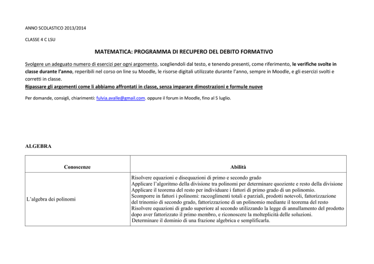 ANNO SCOLASTICO 2013/2014 CLASSE 4 C LSU MATEMATICA: PROGRAMMA DI RECUPERO DEL DEBITO FORMATIVO Svolgere un adeguato numero di esercizi per ogni argomento, scegliendoli dal testo, e tenendo presenti, come riferimento, le verifiche svolte in classe durante l’anno, reperibili nel corso on line su Moodle, le risorse digitali utilizzate durante l’anno, sempre in Moodle, e gli esercizi svolti e corretti in classe. Ripassare gli argomenti come li abbiamo affrontati in classe, senza imparare dimostrazioni e formule nuove Per domande, consigli, chiarimenti: [email protected]. oppure il forum in Moodle, fino al 5 luglio. ALGEBRA Conoscenze L’algebra dei polinomi Abilità Risolvere equazioni e disequazioni di primo e secondo grado Applicare l’algoritmo della divisione tra polinomi per determinare quoziente e resto della divisione Applicare il teorema del resto per individuare i fattori di primo grado di un polinomio. Scomporre in fattori i polinomi: raccoglimenti totali e parziali, prodotti notevoli, fattorizzazione del trinomio di secondo grado, fattorizzazione di un polinomio mediante il teorema del resto Risolvere equazioni di grado superiore al secondo utilizzando la legge di annullamento del prodotto dopo aver fattorizzato il primo membro, e riconoscere la molteplicità delle soluzioni. Determinare il dominio di una frazione algebrica e semplificarla. GEOMETRIA ANALITICA Conoscenze L’ellisse e l’iperbole nel piano cartesiano L’iperbole equilatera riferita agli assi e agli asintoti. La funzione omografica Abilità Determinare le caratteristiche geometriche e tracciare il grafico di una ellisse o di una iperbole di cui è nota l’equazione. Determinare l’equazione di una ellisse o iperbole, note le caratteristiche geometriche. Determinare l’equazione e tracciare il grafico delle iperboli equilatere riferite agli asintoti. Conoscere ed utilizzare le relazioni tra i parametri dell’iperbole equilatera riferita agli assi e agli asintoti. Determinare le coordinate delle intersezioni tra rette e coniche, e tra coniche in casi semplici per il calcolo. Tracciare il grafico di una funzione omografica, riconoscendola come iperbole equilatera, e determinandone dominio, centro, asintoti, vertici, andamento agli estremi del dominio LE FUNZIONI GONIOMETRICHE Conoscenze Lunghezza della circonferenza. Il numero . Angoli e archi orientati. Misura degli angoli in radianti. Le funzioni circolari: y = sin(x); y = cos(x); y = tg(x). Abilità Esprimere la misura degli angoli orientati in gradi e in radianti, e passare da un sistema di misura all’altro. Conoscere i valori delle funzioni circolari relativi agli angoli di 0, /6, /4, /3, /2 e di tutti quelli ad essi riducibili. Utilizzare la calcolatrice per determinare i valori delle funzioni goniometriche di un angolo e la misura di un angolo, noto il valore delle sue funzioni goniometriche Tracciare il grafico e riconoscere le caratteristiche delle funzioni y = sin(x); y = cos(x); y = tg(x) (dominio, codominio, andamento, periodo). Conoscere ed utilizzare le due relazioni fondamentali tra le funzioni goniometriche. LE FUNZIONI ESPONENZIALI E LOGARITMICHE Conoscenze Le funzioni esponenziali e logaritmiche Abilità Conoscere la definizione di potenza, con esponente naturale, intero, razionale, irrazionale Conoscere e saper applicare le proprietà delle potenze Individuare le caratteristiche della funzione esponenziale, con base maggiore o minore di uno: dominio, codominio, segno, andamento, limiti agli estremi del dominio Conoscere la definizione di logaritmo Conoscere e saper applicare le proprietà dei logaritmi e la formula del cambiamento di base Utilizzare la calcolatrice per determinare i valori approssimati di potenze e logaritmi Individuare le caratteristiche della funzione logaritmica, vista come inversa della funzione esponenziale: dominio, codominio, segno, andamento, limiti agli estremi del dominio Determinare il dominio di una funzione logaritmica del tipo , in casi semplici Risolvere semplici equazioni esponenziali e logaritmiche Risolvere problemi di crescita e decrescita esponenziale, anche usando i logaritmi. DATI E PREVISIONI Conoscenze Abilità Statistica bivariata Dipendenza e indipendenza statistica. Indice di correlazione. La retta di regressione Determinare la correlazione di due caratteri quantitativi mediante la covarianza. Misurare la correlazione mediante il coefficiente di correlazione lineare. Determinare l’equazione della retta di regressione e rappresentarla graficamente, mediante l’utilizzo di un foglio di calcolo. Calcolo delle probabilità Elementi di calcolo combinatorio Calcolare permutazioni, disposizioni e combinazioni in problemi semplici. Conoscere le varie definizioni di probabilità Definizione classica di probabilità Il modello insiemistico per il calcolo delle probabilità Probabilità dell’unione e dell’intersezione di eventi Probabilità condizionata Probabilità totale Probabilità delle cause: teorema di Bayes Calcolare la probabilità di un evento come rapporto tra il numero di casi favorevoli e il numero di casi possibili Utilizzare il linguaggio degli insiemi per costruire eventi composti a partire da due o più eventi. Riconoscere eventi incompatibili e compatibili, indipendenti e dipendenti Utilizzare diagrammi ad albero per rappresentare problemi Calcolare la probabilità condizionata. Calcolare la probabilità dell’intersezione di due eventi Calcolare la probabilità totale e la probabilità delle cause di un evento. LIBRI DI TESTO Leonardo Sasso Nuova Matematica a colori, ed. azzurra per la riforma, vol.4. ed. Petrini AA. VV. Matematica controluce, vol. 1 e 2 ed. Etas