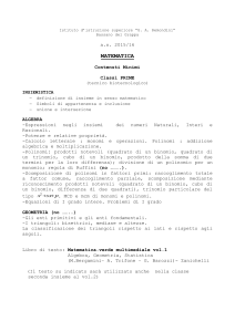 I.S.S MARGHERITA DI SAVOIA Programma di Matematica Classe I Sez. A M - a.s. 2015/2016 Docente: Prof.ssa Botta Concetta U.D.1 Insieme dei numeri naturali Concetto di numero naturale, confronto fra numeri naturali, le quattro operazioni in N, potenza dei numeri naturali, proprietà delle potenze, espressioni aritmetiche, divisibilità e numeri primi, M.C.D. e m.c.m. U.D.2 Insieme dei numeri interi Operazioni e proprietà. Espressioni e risoluzione di problemi mediante l’uso delle quattro operazioni e delle potenze in Z U.D.3 Insieme dei numeri razionali assoluti e relativi Frazioni, frazioni equivalenti, proprietà invariantiva delle frazioni, le operazioni con le frazioni, espressioni aritmetiche contenenti frazioni, numeri razionali assoluti, frazioni decimali e numeri decimali, dalla frazione al numero decimale, frazione generatrice di un numero decimale, espressioni aritmetiche con i numeri decimali, rapporto tra due numeri, proporzioni, proprietà delle proporzioni, problemi sulle proporzioni, percentuali. Numeri razionali relativi. Espressioni mediante l’uso delle quattro operazioni e delle potenze in Q. U.D. 4 Monomi Definizione e forma normale. Grado. Monomi simili. Operazioni con i monomi: addizione e sottrazione, moltiplicazione, potenze, divisione. Massimo comune divisore e minimo comune multiplo. U.D. 5 Polinomi. Definizioni Grado di un polinomio. Addizione, sottrazione. Moltiplicazione monomio per polinomio. Moltiplicazione tra polinomi. Divisione di un polinomio per un monomio. U.D. 6 Prodotti notevoli. Differenza di due quadrati, quadrato di un binomio, quadrato di un trinomio, cubo di un binomio. U.D. 7Scomposizione in fattori dei polinomi Raccoglimento totale a fattore comune. Raccoglimento parziale. Scomposizione di polinomi in fattori mediante le regole sui prodotti notevoli: differenza di due quadrati, quadrato di binomio, quadrato di trinomio, cubo di binomio. U.D 8Equazioni di primo grado intere Identità. Le equazioni. I principi di equivalenza. Le equazioni numeriche intere. U.D 9 Introduzione alla statistica I dati statistici. Frequenza assoluta, relativa e percentuale. La rappresentazione grafica dei dati. Risoluzione di semplici problemi. Gli indici di posizione centrale: media aritmetica, moda, mediana. U.D 10 GEOMETRIA: Introduzione alla geometria. I postulati e i teoremi. Enti geometrici fondamentali: Il piano euclideo, le semirette, segmenti e angoli. Punto medio. Bisettrice di un angolo. Operazioni con i segmenti e gli angoli. Angoli retti, acuti, ottusi. Angoli opposti, complementari, supplementari. I triangoli: definizioni, bisettrici, mediane e altezza. Classificazione rispetto ai lati e agli angoli. Gli alunni Il docente Concetta Botta I.S.S MARGHERITA DI SAVOIA Programma di Matematica Classe II Sez. A M a.s. 2015/2016 Docente: Prof.ssa Botta Concetta U.D. 1RECUPERO Polinomi. Addizione e moltiplicazione di polinomi. Prodotti notevoli. Differenza di due quadrati, quadrato di un binomio, quadrato di un trinomio, cubo di un binomio. U.D. 2Scomposizione in fattori dei polinomi Raccoglimento totale a fat tore comune. Raccoglimento parziale. Scomposizione di polinomi in fattori mediante le regole sui prodotti notevoli: differenza di due quadrati, quadrato di binomio, quadrato di trinomio, cubo di binomio. U.D 3 Equazioni di primo grado intere Identità. Le equazioni. I principi di equivalenza. Le equazioni numeriche intere. Problemi ed equazioni. U.D 4 Disequazioni lineari Disequazioni numeriche intere. Sistemi di disequazioni. Disequazioni fratte. U.D 5 Le funzioni numeriche La funzione proporzionalità diretta, proporzionalità inversa. La funzione lineare: retta passante per l’origine ,rette parallele agli assi, equazione generale della retta , coefficiente angolare .Piano cartesiano e rappresentazione grafica dell’ equazione della retta. U.D 6 Sistemi lineari Sistemi di equazioni di primo grado. Metodo di confronto. Metodo di sostituzione. Metodo grafico dei sistemi. U.D 7 Equazioni di secondo grado Equazioni di secondo grado intere, equazione pura, spuria, monomia, completa. Risoluzione di semplici equazione di secondo grado. U.D 8 Radicali numerici Numeri reali.Radici ennesime.Semplificazione di radicali.Riduzione di radicali allo stesso indice. Moltiplicazione, divisione e potenza di radicali numerici.Trasporto di un fattore fuori dal segno di radice. Somma algebrica di radicali numerici. U.D 9Introduzione alla statistica I dati statistici. Frequenza assoluta, relativa e percentuale. La rappresentazione grafica dei dati. Risoluzione di semplici problemi. Gli indici di posizione centrale: media aritmetica, moda, mediana. U.D.10 La probabilità Eventi aleatori. Definizione classica di probabilità .Calcolo della probabilità di eventi semplici. U.D 11 GEOMETRIA La circonferenza Definizioni. Angoli al centro, angoli alla circonferenza.Cenni sui teoremi della circonferenza. Gli alunni Il docente Concetta Botta Commento [cb1]: I.S.S MARGHERITA DI SAVOIA Programma di Matematica Classe I Sez. BM a.s. 2015/2016 Docente: Prof.ssa Botta Concetta U.D.1Insieme dei numeri naturali Concetto di numero naturale, confronto fra numeri naturali, le quattro operazioni in N, potenza dei numeri naturali, proprietà delle potenze, espressioni aritmetiche, divisibilità e numeri primi, M.C.D. e m.c.m. U.D.2 Insieme dei numeri interi Operazioni e proprietà. Espressioni e risoluzione di problemi mediante l’uso delle quattro operazioni e delle potenze in Z U.D.3 Insieme dei numeri razionali assoluti e relativi Frazioni, frazioni equivalenti, proprietà invariantiva delle frazioni, le operazioni con le frazioni, espressioni aritmetiche contenenti frazioni, numeri razionali assoluti, frazioni decimali e numeri decimali, dalla frazione al numero decimale, frazione generatrice di un numero decimale, espressioni aritmetiche con i numeri decimali, rapporto tra due numeri, proporzioni, proprietà delle proporzioni, problemi sulle proporzioni, percentuali. Numeri razionali rel