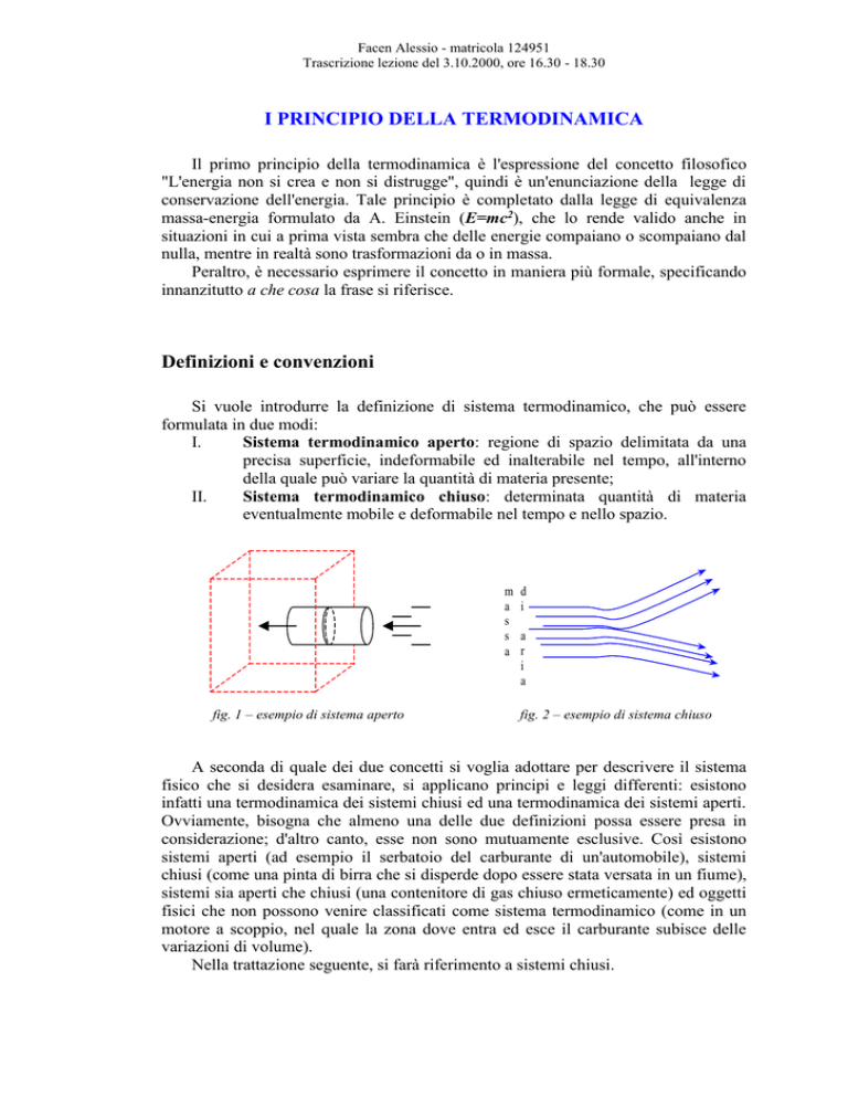 Facen Alessio - matricola 124951 Trascrizione lezione del 3.10.2000, ore 16.30 - 18.30 I PRINCIPIO DELLA TERMODINAMICA Il primo principio della termodinamica è l'espressione del concetto filosofico "L'energia non si crea e non si distrugge", quindi è un'enunciazione della legge di conservazione dell'energia. Tale principio è completato dalla legge di equivalenza massa-energia formulato da A. Einstein (E=mc2), che lo rende valido anche in situazioni in cui a prima vista sembra che delle energie compaiano o scompaiano dal nulla, mentre in realtà sono trasformazioni da o in massa. Peraltro, è necessario esprimere il concetto in maniera più formale, specificando innanzitutto a che cosa la frase si riferisce. Definizioni e convenzioni Si vuole introdurre la definizione di sistema termodinamico, che può essere formulata in due modi: I. Sistema termodinamico aperto: regione di spazio delimitata da una precisa superficie, indeformabile ed inalterabile nel tempo, all'interno della quale può variare la quantità di materia presente; II. Sistema termodinamico chiuso: determinata quantità di materia eventualmente mobile e deformabile nel tempo e nello spazio. m a s s a fig. 1 – esempio di sistema aperto d i a r i a fig. 2 – esempio di sistema chiuso A seconda di quale dei due concetti si voglia adottare per descrivere il sistema fisico che si desidera esaminare, si applicano principi e leggi differenti: esistono infatti una termodinamica dei sistemi chiusi ed una termodinamica dei sistemi aperti. Ovviamente, bisogna che almeno una delle due definizioni possa essere presa in considerazione; d'altro canto, esse non sono mutuamente esclusive. Così esistono sistemi aperti (ad esempio il serbatoio del carburante di un'automobile), sistemi chiusi (come una pinta di birra che si disperde dopo essere stata versata in un fiume), sistemi sia aperti che chiusi (una contenitore di gas chiuso ermeticamente) ed oggetti fisici che non possono venire classificati come sistema termodinamico (come in un motore a scoppio, nel quale la zona dove entra ed esce il carburante subisce delle variazioni di volume). Nella trattazione seguente, si farà riferimento a sistemi chiusi. Lezione del 3.10.2000 - ore 16.30 - 18.30 Una volta definito il concetto di sistema, si può introdurre il suo complementare, ovverosia l'ambiente, semplicemente come insieme di ciò che non appartiene al sistema. L'unione di ambiente e sistema viene chiamato universo, ed è ad esso che fa riferimento l'enunciato del primo principio della termodinamica. Inoltre, le proprietà del sistema vengono esaminate esclusivamente in due istanti separati, il "prima" e il "dopo" del processo, senza curarsi di ciò che avviene tra di essi: l'analisi degli eventi intercorrenti dall'istante iniziale a quello finale dell'eventuale trasformazione non hanno alcuna rilevanza ai fini di questo tipo di studio (infatti, si parla di "termodinamica dei sistemi e degli stati", che è solo una piccola parte della termodinamica intesa in senso generale). Prendendo in considerazione sistemi chiusi, si nota come l'involucro iniziale del sistema sia - oltre che deformabile - impermeabile al passaggio della materia ma non dell'energia, che può fluire o defluire liberamente in o da esso sotto varie forme, quali ad esempio radiazioni elettromagnetiche o vibrazioni meccaniche. Tuttavia, per lo studio dei fenomeni termodinamici, i trasferimenti di energia tra sistema ed ambiente vengono fondamentalmente ricondotti a due categorie: il lavoro (come ad esempio nella deformazione della superficie, o nell'azione di macchine elettriche) ed il calore (come quello fornito dalle onde elettromagnetiche o dalla vibrazione molecolare). Nella trattazione di tali quantità di energia, si adotta la seguente convenzione: - il lavoro L è considerato positivo quando è effettuato dal sistema sull'ambiente; - il calore Q è considerato positivo quando è fornito dall'ambiente al sistema. fig. 3 – convenzioni sui segni di lavoro e calore -2- Lezione del 3.10.2000 - ore 16.30 - 18.30 Primo principio per sistemi chiusi Sia dato un sistema termodinamico chiuso, dotato di una certa energia iniziale E1 (che può essere di tipo chimico, potenziale gravitazionale, potenziale elettrico...); sia inoltre E2 l'energia finale del sistema. Allora si ha che (1) E2 E1 Q L Ovvero, l'eventuale incremento di energia di un sistema termodinamico è dato dalla differenza tra il calore acquisito e il lavoro compiuto dal sistema stesso. Si può notare come dell'energia del sistema E facciano parte due classi: l'energia cinetica Ec, esprimibile come Ec=1/2Mv2, con M=massa e v=velocità del sistema; l'energia potenziale gravitazionale Ep, data dalla formula Ep=Mgz, con g=accelerazione di gravità e z=altezza del sistema sul livello del mare. Si definisce quindi l'energia interna del sistema come energia diversa dalle due forme sopra menzionate: (2) U E E p Ec Rispetto a quella interna, si può considerare trascurabile il contributo dell'energia cinetica e di quella potenziale; inoltre, supponendo che il sistema rimanga fermo, la variazione di queste ultime è nulla. Pertanto dell'energia totale l'unica componente che subisce delle mutazioni durante il processo è quella interna; si arriva quindi a scrivere la forma più utilizzata del primo principio: (3) U 2 U1 Q L Esperienza di Joule J.P. Joule (1818 - 1889) nel 1843 dimostrò sperimentalmente come la variazione di energia interna di un sistema fosse indipendente dal processo seguito. L'esperimento consisteva nel comprimere ed espandere in varie maniere del gas tramite un pistone, portandolo da uno stadio iniziale ad uno finale comune a tutte le trasformazioni, e misurandone i parametri, come la temperatura e la pressione. -3- Lezione del 3.10.2000 - ore 16.30 - 18.30 p B pB pA A vA fig. 4 – dispositivo usato da Joule vB v fig. 5 – esempi di possibili processi esaminati A seguito delle numerose osservazioni compiute, Joule notificò che la differenza tr