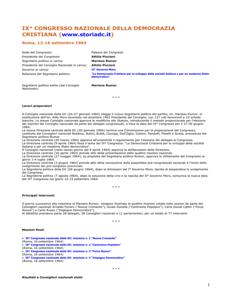 IX° CONGRESSO NAZIONALE DELLA DEMOCRAZIA CRISTIANA (www.storiadc.it) Roma, 12-16 settembre 1964 Sede del Congresso: Palazzo dei Congressi Presidente del Congresso: Attilio Piccioni Segretario politico in carica: Mariano Rumor Presidente del Consiglio Nazionale in carica: Attilio Piccioni Governo in carica: II° Governo Moro Relazione del Segretario politico: "La Democrazia Cristiana per lo sviluppo della società italiana e per un moderno Stato democratico" Segretario politico eletto (dal Consiglio Nazionale): Mariano Rumor *** Lavori preparatori Il Consiglio nazionale della DC (24-27 gennaio 1964) elegge il nuovo Segretario politico del partito, on. Mariano Rumor, in sostituzione dell'on. Aldo Moro diventato nel dicembre 1963 Presidente del Consiglio, con 127 voti favorevoli e 10 schede bianche. Lo stesso Consiglio nazionale approva le modifiche allo Statuto, introducendo il metodo proporzionale per l'elezione dei membri del Consiglio nazionale da parte dei delegati congressuali, e fissa la data del IX° Congresso per il 27-30 giugno 1964. La nuova Direzione centrale della DC (30 gennaio 1964) nomina una Commissione per la preparazione del Congresso, costituita dai Consiglieri nazionali Bubbico, Butini, Buttè, Cossiga, Dall'Oglio, Galloni, Pandolfi, Pistelli e Scalia, presieduta dal Segretario politico Rumor. La Direzione centrale (20 marzo 1964) approva all'unanimità il regolamento per l'elezione dei delegati al Congresso. La Direzione centrale (9 aprile 1964) fissa il tema del IX° Congresso: "La Democrazia Cristiana per lo sviluppo della società italiana e per un moderno Stato democratico". Il Consiglio nazionale (nello stesso giorno del 9 aprile 1964) approva le deliberazioni della Direzione. La Direzione centrale (16 aprile 1964) prende atto della presentazione delle quattro mozioni nazionali. La Direzione centrale (27 maggio 1964), su proposta del Segretario politico Rumor, approva lo slittamento del Congresso ai giorni 1-4 luglio 1964. La Direzione centrale (3 giugno 1964) prende atto della conclusione delle assemblee pre-congressuali sezionali e l'inizio dello svolgimento dei pre-congressi provinciali. La Segreteria politica della DC (26 giugno 1964), dopo le dimissioni del I° Governo Moro, decide di sospendere lo svolgimento del Congresso. La Segreteria politica (7 agosto 1964), dopo la soluzione della crisi e la nascita del II° Governo Moro, comunica la nuova data del IX° Congresso nei giorni 12-15 settembre 1964. *** Principali interventi Il giorno successivo alla relazione di Mariano Rumor, vengono illustrate le quattro mozioni votate nelle sezioni da parte dei Consiglieri nazionali Arnaldo Forlani ("Nuove Cronache"), Guido Gonella ("Centrismo Popolare"), Carlo Donat Cattin ("Forze Nuove") e Carlo Russo ("Impegno Democratico"). Al dibattito prendono parte 28 delegati, 38 Consiglieri nazionali e 11 parlamentari, per un totale di 77 interventi. *** Mozioni finali • IX° Congresso nazionale della DC: mozione n. 1 "Nuove Cronache" (Roma, 16 settembre 1964) • IX° Congresso nazionale della DC: mozione n. 2 "Centrismo Popolare" (Roma, 16 settembre 1964) • IX° Congresso nazionale della DC: mozione n. 3 "Forze Nuove" (Roma, 16 settembre 1964) • IX° Congresso nazionale della DC: mozione n. 4 "Impegno Democratico" (Roma, 16 settembre 1964) *** Risultati e Consiglieri nazionali eletti 1 LISTA 1 "NUOVE CRONACHE" 21,35% LISTA 2 "CENTRISMO POPOLARE" 11,51% LISTA 3 "FORZE NUOVE" 20,65% LISTA 4 "IMPEGNO DEMOCRATICO" 46,49% parlamentari eletti Forlani Arnaldo Bosco Giacinto Barbi Paolo Natali Lorenzo Malfatti Franco Maria Rampa Leandro D'Arezzo Bernardo Salari Giuseppe Gioia Giovanni Darida Clelio La Penna Girolamo Venturi Giovanni Fada Annibale Scalfaro Oscar Luigi Restivo Franco Lucifredi Roberto Elkan Giovanni Martinelli Mario Romanato Giuseppe Vedovato Giuseppe Pastore Giulio Colombo Vittorino Bo Giorgio Armato Baldassarre De Mita Ciriaco Donat Cattin Carlo Gagliardi Vincenzo Mengozzi Dario Negrari Andrea Pistelli Nicola Scalia Vito Marotta Vincenzo Branzi Renato Pinna Giovanni Arnaud Gian Aldo Mazzarolli Antonio La Loggia Giuseppe Del Rio Giovanni Butini Ivo Bubbico Mauro Celi Giuseppe Servidio Alberto Frau Aventino Benucci Francesco Virgilio Francesco Dall'Oglio Cesare Palmitessa Ennio Poletti Laerte Ravaioli Domenico Stagno D'Alcontres Francesco Basso Quintino Concetti Francesco Rumor Mariano Moro Aldo Gava Silvio Zaccagnini Benigno Colombo Emilio Scaglia Giovanni Battista Spataro Giuseppe Andreotti Giulio Delle Fave Umberto Gui Luigi Mattarella Bernardo Russo Carlo Salizzoni Angelo Sullo Fiorentino Antoniozzi Dario Badaloni Maria Caron Giuseppe De' Cocci Danilo Gaspari Remo Magri Domenico Piccoli Flaminio Truzzi Ferdinando Berloffa Alcide Gullotti Antonino Lattanzio Vito Salvi Franco Bisaglia Antonio Sarti Adolfo non parlamentari eletti Galloni Giovanni Granelli Luigi Ardigò Achille Bassetti Piero Benadusi Luciano Borrini Carlo Ciccardini Bartolo De Poli Dino Gargani Giuseppe Guidolin Francesco Tagliarini Franco Carta Gianuario Morlino Tommaso Dal Falco Luciano Freato Sereno D'Angelo Giuseppe Dalvìt Luigi Petrucci Amerigo Clemente Nando Speranza Edoardo Anselmi Tina Orlando Giulio Di Cagno Vitantonio Drago Antonino Giacchetto Giuseppe Carraro Luigi Coniglio Francesco Mazzarino Mario Meucci Enzo Milanesi Bruno Novara Giampaolo Pandolfi Filippo Spitella Giorgio Tiriolo Elio Giuffrida Renato Carenini Egidio Gaibisso Gerardo Mechelli Girolamo Molè Carlo Calleri Edoardo in rappresentanza delle regioni Berthet (Val d'Aosta); Curti (Piemonte); Solari (Liguria); Marcora (Lombardia); Grigolli (Trentino-Alto Adige); Orsini (Veneto); Toros (Friuli); Rinaldi (Trieste e Istria); Corghi (Emilia Romagna); Bardotti (Toscana); Ciaffi (Marche); Carnevali (Umbria); Franco Evangelisti (Lazio); De Dominicis (Abruzzo); Falcone (Molise); Carbone (Campania); Rausa (Puglia); Verrastro (Basilicata); Vincelli (Calabria); Verzotto (Sicilia); Pitzalis (Sardegna); Lomazzi (Europa occidentale) 