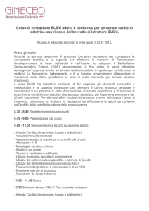 Corso esecutore di BLSD (Basic Life Support early Defibrillation) cat. B per Sanitari: Nuove Linee Guida IRC (Italian Resuscitation Council) 2010. Programma: 8.15 – 9.15 Basic Life Support, early Defibrillation (BLS‐D): Introduzione al Corso esecutore; Fondamenti, O,biettivi del BLS‐D Sequenze e Tecniche. Efficacia e sicurezza delle manovre di BLS 9.15 – 10.15 BLS‐D: Principi di Defibrillazione Precoce (DP); Il Defibrillatore Semi‐ Automatico Esterno (DAE): caratteristiche generali e DAE ad utilizzo locale. Efficacia e Sicurezza della DP; Ostruzione delle vie aeree da corpo estraneo. 10.15 – 10.30 BLS‐D: Sequenza non commentata in seduta plenaria 10.30 – 12.00 Tecniche BLS (addestramento a Gruppi): Riconoscimento e allarme precoce; apertura vie aeree, ventilazione con pallone e maschera, compressioni toraciche esterne. 12.00 – 13.30 Tecniche BLSD (addestramento a Gruppi): Defibrillazione con DAE: procedura e sicurezza; Sequenza completa BLSD; posizione laterale di Sicurezza e Disostruzione delle vie aeree da corpo estraneo 14.00 – 14.15 BLS‐D: Sequenza commentata in seduta plenaria 14.15 – 16.45 Sequenze BLS‐D (addestramento a Gruppi): Sequenza BLS‐D a due soccorritori con DAE subito disponibile (ACR testimoniato e non testimoniato); sequenza con chiamata del DAE da altra sede; sequenza con ritmo iniziale non defibrillabile. 16.45 – 17.00 Verifica finale: quiz a risposta multipla 17.00 – 18.00 Verifica Finale: Skill Test ‐ IRC Descrizione del Corso: L’ approccio ad una situazione critica di arresto cardiaco (AC) nell’adulto rappresenta una condizione non infrequente, che presuppone da parte dell’operatore sanitario (Medici, Infermieri, OSS) una conoscenza ed una formazione adeguate al fine di poter intervenire immediatamente ed in maniera appropriata secondo Linee Guida validate IRC‐ERC (Italian Resuscitation Council ‐ European Resuscitation Council), ottimizzando la risposta organizzativa in ambito ospedaliero e territoriale. Il Corso di BLSD per sanitari ha come obiettivo principale, attraverso la formazione e l’addestramento continuo del personale sanitario, il miglioramento della sopravvivenza dell’adulto vittima di arresto cardiaco, garantendo il consolidamento delle prime fasi della catena della sopravvivenza di: a) riconoscimento e allarme precoce, b) supporto vitale di base e c) defibrillazione precoce.