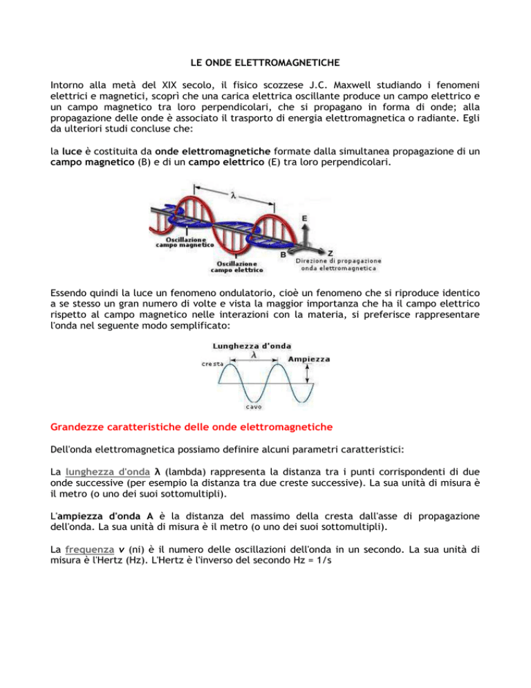 LE ONDE ELETTROMAGNETICHE Intorno alla metà del XIX secolo, il fisico scozzese J.C. Maxwell studiando i fenomeni elettrici e magnetici, scoprì che una carica elettrica oscillante produce un campo elettrico e un campo magnetico tra loro perpendicolari, che si propagano in forma di onde; alla propagazione delle onde è associato il trasporto di energia elettromagnetica o radiante. Egli da ulteriori studi concluse che: la luce è costituita da onde elettromagnetiche formate dalla simultanea propagazione di un campo magnetico (B) e di un campo elettrico (E) tra loro perpendicolari. Essendo quindi la luce un fenomeno ondulatorio, cioè un fenomeno che si riproduce identico a se stesso un gran numero di volte e vista la maggior importanza che ha il campo elettrico rispetto al campo magnetico nelle interazioni con la materia, si preferisce rappresentare l'onda nel seguente modo semplificato: Grandezze caratteristiche delle onde elettromagnetiche Dell'onda elettromagnetica possiamo definire alcuni parametri caratteristici: La lunghezza d'onda λ (lambda) rappresenta la distanza tra i punti corrispondenti di due onde successive (per esempio la distanza tra due creste successive). La sua unità di misura è il metro (o uno dei suoi sottomultipli). L'ampiezza d'onda A è la distanza del massimo della cresta dall'asse di propagazione dell'onda. La sua unità di misura è il metro (o uno dei suoi sottomultipli). La frequenza ν (ni) è il numero delle oscillazioni dell'onda in un secondo. La sua unità di misura è l'Hertz (Hz). L'Hertz è l'inverso del secondo Hz = 1/s La velocità di propagazione c, che assume valori diversi a seconda del mezzo in cui essa si propaga. Nel caso della luce che si propaga nel vuoto, c = 3 ·108 m/s ovvero c = 300000 Km/s. Lunghezza d'onda, frequenza e velocità di propagazione sono legate tra loro dalla seguente relazione matematica: Classificazione delle onde elettromagnetiche Le onde elettromagnetiche sono state classificate in base ai valori di lunghezza d'onda (o, il che è lo stesso, in base ai valori di frequenza). Esse, nel loro complesso costituiscono lo spettro elettromagnetico. Le onde elettromagnetiche che l'occhio umano percepisce sono solo una piccolissima parte dello spettro elettromagnetico: costituiscono lo spettro del visibile. Le onde elettromagnetiche appartenenti a tale spettro hanno valori di lunghezza d'onda compresi tra 390 nm e 760 nm (nm = 10-9 m). Le onde elettromagnetiche aventi lunghezza d'onda maggiore (e quindi frequenza minore) sono quelle catalogate come: infrarossi, microonde e onde radio. Le onde elettromagnetiche aventi lunghezza d'onda minore (e quindi frequenza maggiore) sono quelle catalogate come: ultravioletto (UV), raggi X, raggi gamma.