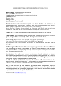 PINO DOMESTICO O PINO DA PINOLI Nome Comune: Pino domestico o Pino da pinoli Nome scientifico: Pinus pinea L. Classificazione: Spermatophyta, Gymnospermae, Coniferae Famiglia: Pinaceae Genere: Pinus Specie: P. pinea Identificazione: Piante forestali Descrizione - E’ un albero alto fino a 30 metri originario delle coste del Mediterraneo e largamente diffuso in Italia dove viene coltivato praticamente ovunque ad eccezione delle zone montuose. Vive nelle zone costiere mediterranee dove forma boschi chiamati pinete, ma è stato anche coltivato a partire da 6000 anni fa, per la produzione dei semi, i pinoli, un tempo considerati una merce prelibata e preziosa. Oggi molti dei boschi presenti in Italia iniziano ad essere molto anziani e ci si sta ponendo il problema di doverli rinnovare piantumando nuove piante. Per l'alto numero di esemplari presenti in Italia, il pino domestico viene da molti considerato l'albero simbolo del Paese, tanto che negli stati anglosassoni il pino domestico viene denominato "Italian stone pine" ed in Francia "Pin d'Italie". Fusto/tronco - La corteccia è spessa, marrone-rossiccia e fessurata in placche1 verticali. 1 Parti di forma larga e piatta La sua chioma ad ombrello è formata da rami che si concentrano nella parte alta del tronco terminando con punte rivolte verso l'alto. Foglie/gemme - Le foglie sono aghi, flessibili e di consistenza coriacea2, raggruppati in coppie. Sono lunghi da 10 a 20 cm (eccezionalmente 30 cm). Fiori e Frutti - I fiori maturano in aprilemaggio. Le infiorescenze maschili hanno un aspetto molto modesto, di colore giallastro e sono formate da squame che producono notevoli quantità di polline. Le infiorescenze femminili, (stròbili) sono falsi frutti simili a pigne di colore verde, che, maturando, diventano legnose. 2 Dura, resistente, che ha la consistenza del cuoio Una volta mature le pigne si aprono liberando i semi, cioè i pinoli. I pinoli di colore marrone chiaro, sono protetti da un guscio legnoso. Per maturare le pigne impiegano 3 anni diventando lunghe 8-15 cm. Usi - L'utilizzo principale del Pino domestico nell'antichità, sin dalla preistoria, era la produzione di pinoli che costituivano una base molto importante dell'alimentazione umana. Per questo è stato piantato anche in zone dove il clima non è quello ottimale per la sua crescita (pinete alto Adriatico). Oggi è anche coltivato come pianta ornamentale. Piccoli esemplari vengono cresciuti in grandi piantagioni e usati anche per i bonsai3. Pianticelle di un anno, alte 20-30 cm, sono anche usate come alberi di Natale da tavolo. Curiosità - Un metodo utile per riconoscere giovani esemplari di Pino domestico da piante di Pino marittimo che appaiono assolutamente uguali, consiste nello "stropicciare" una manciata di foglie aghiformi verdi. Nel caso del pino domestico si otterrà un odore simile a quello dei pinoli, mentre le foglie di pino marittimo sprigioneranno un odore molto più aspro. Le due piante, una volta cresciute, hanno un portamento molto differente i loro rami secondari si biforcano in maniera differente: il pino marittimo ha una ramificazione ad angolo retto mentre il pino domestico ad angolo acuto e tende a crescere di meno in altezza. Un'altra differenza è la forma della pigna: quella del pino domestico ha una forma più arrotondata, mentre quella del pino marittimo è più allungata. Fonti principali e immagini: wikipedia, agraria.org 3 Alberi in miniatura mantenuti nani anche per molti anni mediante continua potatura