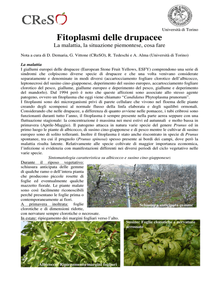 Università di Torino Fitoplasmi delle drupacee La malattia, la situazione piemontese, cosa fare Nota a cura di D. Demaria, G. Vittone (CReSO), R. Tedeschi e A. Alma (Università di Torino) La malattia I giallumi europei delle drupacee (European Stone Fruit Yellows, ESFY) comprendono una serie di sindromi che colpiscono diverse specie di drupacee e che una volta venivano considerate separatamente e denominate in modi diversi (accartocciamento fogliare clorotico dell’albicocco, leptonecrosi del susino cino-giapponese, deperimento del susino europeo, accartocciamento fogliare clorotico del pesco, giallume, giallume europeo e deperimento del pesco, giallume e deperimento del mandorlo). Dal 1994 però è noto che queste affezioni sono associate allo stesso agente patogeno, ovvero un fitoplasma che oggi viene chiamato “Candidatus Phytoplasma prunorum”. I fitoplasmi sono dei microrganismi privi di parete cellulare che vivono nel floema delle piante creando degli scompensi al normale flusso della linfa elaborata e degli squilibri ormonali. Considerando che nelle drupacee, a differenza di quanto avviene nelle pomacee, i tubi cribrosi sono funzionanti duranti tutto l’anno, il fitoplasma è sempre presente nella parte aerea seppure con una fluttuazione stagionale: la concentrazione è massima nei mesi estivi ed autunnali e molto bassa in primavera (Aprile-Maggio). Il patogeno attacca in natura varie specie del genere Prunus ed in primo luogo le piante di albicocco, di susino cino-giapponese e di pesco mentre le cultivar di susino europeo sono di solito tolleranti. Inoltre il fitoplasma è stato anche riscontrato in specie di Prunus spontanee, tra cui il prugnolo (Prunus spinosa) spesso presente ai bordi dei campi, dove però la malattia risulta latente. Relativamente alle specie coltivate di maggior importanza economica, l’infezione si evidenzia con manifestazioni differenti nei diversi periodi del ciclo vegetativo nelle varie specie. Sintomatologia caratteristica su albicocco e susino cino-giapponese: Durante il riposo vegetativo: schiusura anticipata delle gemme di qualche ramo o dell’intera pianta che producono piccole rosette di foglie ed eventualmente qualche mazzetto fiorale. Le piante malate sono così facilmente riconoscibili perché presentano le foglie prima o contemporaneamente ai fiori. A primavera inoltrata: foglie Schiusura anticipata gemme clorotiche e di dimensioni ridotte, con nervature sempre clorotiche o necrosate. In estate: ripiegamento dei margini fogliari verso l’alto. Susino: Foglie clorotiche e nervature arrossate Albicocco: Ripiegamento margini fogliari Sintomatologia caratteristica su pesco, percoche e nettarine: In estate: vegetazione stentata, ispessimento della lamina fogliare e ripiegamento dei margini fogliari verso l’alto. Arrossamento fogliare, accompagnato da torsione all’indietro della foglia, portamento pendulo e forte ingrossamento del rachide e delle nervature principali, le nervature appaiono così in rilievo sulla superficie della lamina. In tarda estate: possibile formazione di scopazzi portanti foglie piccole clorotiche e saltuaria emissione di fiori. In albicocco e susino la malattia può causare la morte della pianta in 2-5 anni. Il decorso della malattia dipende molto dal portinnesto utilizzato: in generale i soggetti più sensibili appartengono alla specie P. persica (Franco, Rubirà, Rutgers, Red Leaf, Montclear), così come anche il franco di albicocco, e gli ibridi G.F. 677, Marianna G.F. 8-1 e il clone Mr.S. 2/5. E’ anche importante considerare che i polloni del mirabolano e del susino europeo sono molto appetiti per l’alimentazione e l’ovideposizione dell’insetto vettore. Sarebbe quindi consigliabile scegliere portinnesti poco polloniferi o praticare un’accurata rimozione dei polloni almeno fino a fine luglio, quando la psilla abbandona le drupacee per recarsi su altri ospiti per l’estivazione e lo svernamento. La trasmissione e l’insetto vettore Il fitoplasma agente causale dei giallumi europei delle drupacee è trasmesso in natura dalla psilla Cacopsylla pruni. Questo insetto compie una generazione all’anno e arriva sulle drupacee, dapprima quelle spontanee, come il prugnolo, tra la metà di febbraio e la metà di marzo, e in aprile-maggio vi depone le uova. All’inizio di luglio le psille abbandonano le drupacee spostandosi su conifere, preferenzialmente abeti e pino d’Aleppo dove estivano e svernano come adulti. La trasmissione è di tipo persistente propagativa, ovvero il fitoplasma si moltiplica all’interno del corpo dell’insetto e la psilla, una volta che ha acquisito il fitoplasma, rimane infettiva per tutta la sua vita. Le popolazioni di C. pruni sono di solito di bassa entità, ma è possibile riscontrare un numero molto elevato di individui infetti, C. pruni fino al 49%. La maggior parte di questi è stata riscontrata su prugnolo, ospite chiave nel ciclo epidemiologico della malattia, in quanto buon ospite del fitoplasma e del suo vettore e in grado di assicurare la sopravvivenza del patogeno anche in assenza di drupacee coltivate. La diffusione dell’infezione in campo sarebbe dovuta in massima parte ai reimmigranti infetti, mentre i reimmigranti sani che si infettano successivamente e gli adulti di nuova generazione non riescono a diffondere localmente l’infezione, probabilmente a causa di una carica di fitoplasmi bassa all’interno del corpo, ma saranno importanti nel propagare l’infezione la stagione successiva. Il fitoplasma dei giallumi europei delle drupacee si trasmette anche mediante materiale di propagazione infetto sia in vegetazione, sia in stato di riposo invernale. Infatti nella parte epigea delle drupacee, a differenza di quello che succede nelle pomacee, si trovano tubi cribrosi funzionali tutto l’anno. Tale fitoplasma non si trasmette per seme, né mediante gli arnesi di potatura. Nella tabella seguente sono riassunte le modalità di trasmissione dell’ESFY e sono messe
