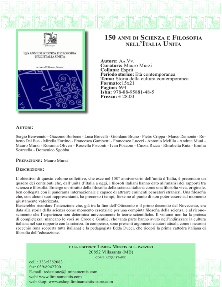 150 anni di Scienza e Filosofia nell’Italia Unita Autore: Aa.Vv. Curatore: Mauro Murzi Collana: Esprit Periodo storico: Età contemporanea Tema: Storia della cultura contemporanea Formato:15x21 Pagine: 694 Isbn: 978-88-95881-48-5 Prezzo: € 28.00 Autori: Sergio Benvenuto - Giacomo Borbone - Luca Brovelli - Giordano Bruno - Pietro Crippa - Marco Damonte - Roberto Del Bua - Mirella Fortino - Francesca Gambetti - Francesco Luceri - Antonio Melillo - Andrea Muni Mauro Murzi - Rosanna Oliveri - Rossella Pisconti - Ivan Pozzoni - Cinzia Rizza - Elisabetta Ruta - Emilia Scarcella - Domenico Sgobba Prefazione: Mauro Murzi Descrizione: L’obiettivo di questo volume collettivo, che esce nel 150° anniversario dell’unità d’Italia, è presentare un quadro dei contributi che, dall’unità d’Italia a oggi, i filosofi italiani hanno dato all’analisi dei rapporti tra scienza e filosofia. Emerge un ritratto della filosofia della scienza italiana come una filosofia viva, originale, ben collegata con il panorama internazionale e capace di attrarre eminenti pensatori stranieri. Una filosofia che, con alcuni suoi rappresentanti, ha precorso i tempi, forse no al punto di non poter essere sul momento giustamente valorizzata. Basterebbe ricordare l’attenzione che, già tra la fine dell’Ottocento e il primo decennio del Novecento, era data alla storia della scienza come momento essenziale per una compiuta filosofia della scienza, e al riconoscimento che l’esperienza non determina univocamente le teorie scientifiche. Il volume non ha la pretesa di completezza: mancano le voci su Croce e Gentile, che tanta parte hanno avuto nell’indirizzare la cultura italiana nel suo rapporto con la scienza. In compenso, sono presenti argomenti e autori attuali, come i neuroni specchio (una scoperta tutta italiana) e la pedagogista Edda Ducci, che ricoprì la prima cattedra italiana di filosofia dell’educazione. Limina Mentis di l. panzeri 20852 Villasanta (MB) casa editrice come acquistare: cell.: 333/5382083 fax: 039/8942700 E-mail: [email protected] web: www.liminamentis.com web shop: www.eshop.liminamentis-store.com INDICE: 5 INTRODUZIONE (Mauro Murzi) 13 Pasquale Villari tra hegelismo e positivismo (Emilia Scarcella) Il “Virtuoso Darwinismo” di Pietro Siciliani (Francesco Luceri) Scienza e psicologia nel positivismo di Roberto Ardigò (Domenico Sgobba) La rilettura calderoniana del pensiero gnoseo-logico ed epistemologico di Giovanni Vailati (Ivan Pozzoni) «Arte a dio quasi è nepote» una lettura del periodo postunitario tra scienza, filosofia e letteratura (Antonio Melillo) Logica e immagine della scienza in Italia fra l’unità nazionale e la prima guerra mondiale (Roberto Del Buffa) Il rapporto tra scienza e filosofia in Italia agli albori del Novecento (Cinzia Rizza) Enriques e la società filosofica italiana: la filosofia come strumento di crescita dell’Italia unita (Francesca Gambetti) Teoria della conoscenza e geometria nel pensiero filosofico di Enriques (Rosanna Oliveri) La rivista scientia e la relatività di Einstein. Storia di divulgazione e inchieste chiarificatrici (Rosanna Oliveri) Il pensiero di Bruno De Finetti come processo emergente dal rapporto tra scienza e filosofia (Giordano Bruno) La riflessione di Giulio Preti tra empirismo critico e nuovo razionalismo (Elisabetta Ruta) Scienza e filosofia Ludovico Geymonat e la nascita della filosofia scientifica in Italia (Giacomo Borbone) La filosofia della scienza di Mario Ageno (Mauro Murzi) Il rapporto tra scienza e filosofia nel pensiero pedagogico di Edda Ducci (Andrea Muni) Wiener Kreis e convenzionalismo nella filosofia italiana del Novecento (Mirella Fortino) Evandro Agazzi: filosofia della scienza e paideia umanistica (Marco Damonte) Per un “razionalismo della contingenza”. Scienza e fede in Dario Antiseri (Tommaso Valentini) Scienza e filosofia nel pensiero di un matematico ‘impertinente’ (Rossella Pisconti) Neuroni specchio e fenomenologia (Sergio Benvenuto) Carlo sini: una filosofia come Ethos (Pietro Crippa) L’abisso dell’infirmitas. Vincenzo Vitiello tra filosofia, religione e scienza (Luca Brovelli) 41 75 103 135 159 193 227 249 271 297 321 349 385 421 455 487 525 567 595 629 655