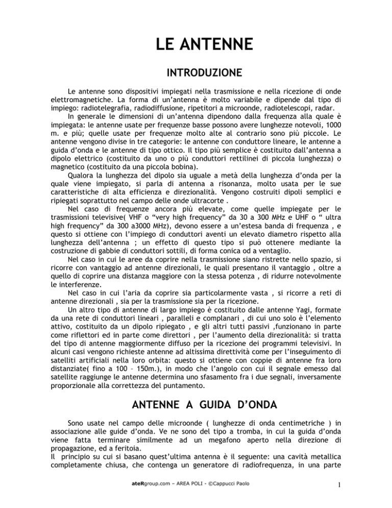 LE ANTENNE INTRODUZIONE Le antenne sono dispositivi impiegati nella trasmissione e nella ricezione di onde elettromagnetiche. La forma di un’antenna è molto variabile e dipende dal tipo di impiego: radiotelegrafia, radiodiffusione, ripetitori a microonde, radiotelescopi, radar. In generale le dimensioni di un’antenna dipendono dalla frequenza alla quale è impiegata: le antenne usate per frequenze basse possono avere lunghezze notevoli, 1000 m. e più; quelle usate per frequenze molto alte al contrario sono più piccole. Le antenne vengono divise in tre categorie: le antenne con conduttore lineare, le antenne a guida d’onda e le antenne di tipo ottico. Il tipo più semplice è costituito dall’antenna a dipolo elettrico (costituito da uno o più conduttori rettilinei di piccola lunghezza) o magnetico (costituito da una piccola bobina). Qualora la lunghezza del dipolo sia uguale a metà della lunghezza d’onda per la quale viene impiegato, si parla di antenna a risonanza, molto usata per le sue caratteristiche di alta efficienza e direzionalità. Vengono costruiti dipoli semplici e ripiegati soprattutto nel campo delle onde ultracorte . Nel caso di frequenze ancora più elevate, come quelle impiegate per le trasmissioni televisive( VHF o “very high frequency” da 30 a 300 MHz e UHF o “ ultra high frequency” da 300 a3000 MHz), devono essere a un’estesa banda di frequenza , e questo si ottiene con l’impiego di conduttori aventi un elevato diametro rispetto alla lunghezza dell’antenna ; un effetto di questo tipo si può ottenere mediante la costruzione di gabbie di conduttori sottili, di forma conica od a ventaglio. Nel caso in cui le aree da coprire nella trasmissione siano ristrette nello spazio, si ricorre con vantaggio ad antenne direzionali, le quali presentano il vantaggio , oltre a quello di coprire una distanza maggiore con la stessa potenza , di ridurre notevolmente le interferenze. Nel caso in cui l’aria da coprire sia particolarmente vasta , si ricorre a reti di antenne direzionali , sia per la trasmissione sia per la ricezione. Un altro tipo di antenne di largo impiego è costituito dalle antenne Yagi, formate da una rete di conduttori lineari , paralleli e complanari , di cui uno solo è l’elemento attivo, costituito da un dipolo ripiegato , e gli altri tutti passivi ,funzionano in parte come riflettori ed in parte come direttori , per l’aumento della direzionalità: si tratta del tipo di antenne maggiormente diffuso per la ricezione dei programmi televisivi. In alcuni casi vengono richieste antenne ad altissima direttività come per l’inseguimento di satelliti artificiali nella loro orbita: questo si ottiene con coppie di antenne fra loro distanziate( fino a 100 – 150m.), in modo che l’angolo con cui il segnale emesso dal satellite raggiunge le antenne determina uno sfasamento fra i due segnali, inversamente proporzionale alla correttezza del puntamento. ANTENNE A GUIDA D’ONDA Sono usate nel campo delle microonde ( lunghezze di onda centimetriche ) in associazione alle guide d’onda. Ve ne sono del tipo a tromba, in cui la guida d’onda viene fatta terminare similmente ad un megafono aperto nella direzione di propagazione, ed a feritoia. Il principio su cui si basano quest’ultima antenna è il seguente: una cavità metallica completamente chiusa, che contenga un generatore di radiofrequenza, in una parte ateRgroup.com – AREA POLI - ©Cappucci Paolo 1 della quale venga praticata un’apertura, diventa una sorgente di onde elettromagnetiche per lo spazio circostante, analogamente ad un dipolo. In un’antenna a feritoia la lunghezza dell’apertura è pari a mezza lunghezza d’onda, mentre la sua lunghezza è notevolmente più piccola. Per aumentare la direttività, in corrispondenza dell’apertura, può essere aggiunta una tromba. ANTENNE DI TIPO OTTICO L’ottica ordinaria può essere estesa al campo delle radiazioni elettromagnetiche, in particolare al campo delle microonde: così vengono realizzate antenne a riflettore ed antenne con lenti. Nel primo tipo di antenne ottiche viene impiegata un’opportuna sorgente di radiazione (un dipolo, una tromba od una feritoia), posta nel fuoco di una struttura riflettente di forma opportuna (per es. a paraboloide ) realizzata con materiale ad alta conduttività elettrica; nel secondo tipo invece, impiegabile con vantaggio alle lunghezze d’onda più corte, con strutture paragonabili alle lenti ottiche, si può per esempio far convergere un fascio parallelo nel fuoco della lente in ricezione, e viceversa in trasmissione si può convertire un fascio di raggi divergenti dalla sorgente in fascio parallelo. Per piccole lenti si può impiegare strutture costituite dai materiali dielettrici omogenei, come il polistirolo. Per lenti di grandi dimensioni invece vengono impiegati sistemi più complicati con guide d’onda. Le antenne di tipo ottico hanno fondamentale importanza nelle comunicazioni di segnali ad altissime frequenze, a grandi distanze in quanto le onde ultracorte e le microonde (con frequenza superiore ai 30MHz ), non venendo riflesse dalla ionosfera, hanno traiettoria rettilinea e la portata, limitata dalla curvatura terrestre, è quella ottica; in questi casi allora vengono impiegati ripetitori intermedi, costituiti da un complesso di una antenna ricevente, da amplificatori di antenna e da antenne trasmittenti, sempre dello stesso tipo ottico. Molti degli impianti su lunghissime distanze sono oggi sostituiti con vantaggio da ripetitori o riflettori installati su satelliti artificiali. DIPOLO MARCONIANO Il dipolo marconiano è costituito da un conduttore rettilineo verticale, di altezza h, con l’estremo inferiore messo a terra (attraverso il generatore a radiofrequenza). Assimilato ad una linea aperta senza perdite, esso presenta, nel generico punto a distanza d dall’estremo superiore, un’impedenza d’ingresso puramente reattiva. Nel punto d=h, posto a terra, l’impedenza deve es