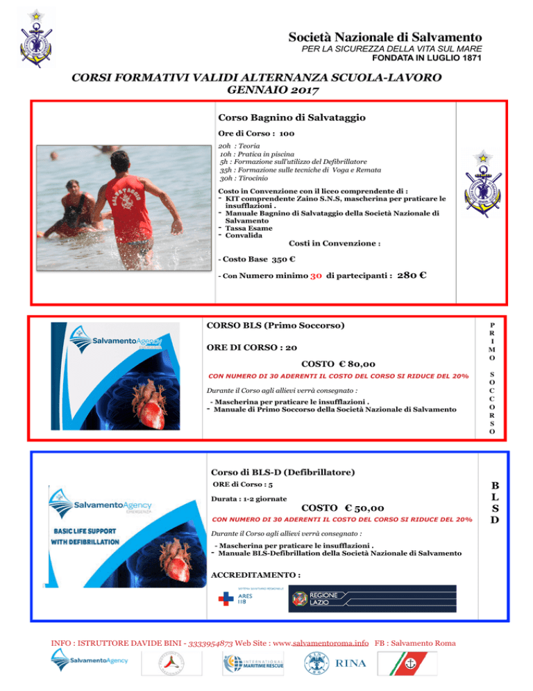 Società Nazionale di Salvamento PER LA SICUREZZA DELLA VITA SUL MARE FONDATA IN LUGLIO 1871 CORSI FORMATIVI VALIDI ALTERNANZA SCUOLA-LAVORO GENNAIO 2017 Corso Bagnino di Salvataggio Ore di Corso : 100 20h : Teoria 10h : Pratica in piscina 5h : Formazione sull’utilizzo del Defibrillatore 35h : Formazione sulle tecniche di Voga e Remata 30h : Tirocinio ! Costo in Convenzione con il liceo comprendente di : - KIT comprendente Zaino S.N.S, mascherina per praticare le insufflazioni . - Manuale Bagnino di Salvataggio della Società Nazionale di Salvamento - Tassa Esame - Convalida Costi in Convenzione : - Costo Base 350 € - Con Numero minimo 30 di partecipanti : 280 € CORSO BLS (Primo Soccorso) ORE DI CORSO : 20 COSTO € 80,00 CON NUMERO DI 30 ADERENTI IL COSTO DEL CORSO SI RIDUCE DEL 20% Durante il Corso agli allievi verrà consegnato : - Mascherina per praticare le insufflazioni . - Manuale di Primo Soccorso della Società Nazionale di Salvamento ! P R I M O S O C C O R S O Corso di BLS-D (Defibrillatore) ORE di Corso : 5 Durata : 1-2 giornate COSTO € 50,00 CON NUMERO DI 30 ADERENTI IL COSTO DEL CORSO SI RIDUCE DEL 20% Durante il Corso agli allievi verrà consegnato : - Mascherina per praticare le insufflazioni . - Manuale BLS-Defibrillation della Società Nazionale di Salvamento ACCREDITAMENTO : INFO : ISTRUTTORE DAVIDE BINI - 3333954873 Web Site : www.salvamentoroma.info FB : Salvamento Roma B L S D Società Nazionale di Salvamento PER LA SICUREZZA DELLA VITA SUL MARE FONDATA IN LUGLIO 1871 Bagnino di Salvataggio Riconoscimenti Legali del Brevetto -Brevetto Ministeriale (in ottemperanza alle leggi vigenti e alla nota 8 / 4 / 77Pt. 12010 del Ministero dell’Interno Direzione Generale della Protezione Civile). -CREDITO Formativo nelle scuole secondarie ,LICEI e UNIVERSITÀ (DPR 23/07/1998 n. 323 art.12 e DM n. 49 del 24/02/2000) -CREDITO per concorsi in MARINA, CAPITANERIA di PORTO , ESERCITO art.8, comma2,lettera b del D.M.1° settembre 2004 arruolamento V.F.P.1[Punti 4,0 Marina e Capitaneria][Punti 1,5Esercito] - “Titolo Professionale di merito “ e Annotazione matricolare Brevetto per il personale militare dell’ESERCITO (-bando arruolamento V.F.P.1) ,della Marina Militare (DM 01/09/2004, art8), dell'Aeronautica Militare dell'Arma dei Carabinieri e della Polizia di Stato -Titolo equipollente alla “prova di nuoto e voga” per il rilascio del Libretto di Navigazione - Iscrizione nelle matricole della “Gente di mare” (dp. Prot. n.° 4135556 del 17/06/1998Min. dei Trasporti e della Navigazione - Direzione Generale del Lavoro Marittimo e Portuale) ARGOMENTI PORTANTI E TECNICHE TRATTATE NEL CORSO BAGNINO DI SALVATAGGIO Teoria - Figura del Bagnino - Responsabilità di livello civile e Penale con il Brevetto - Anatomia Generale - Calcolo Battito Cardiaco e Respirazione - BLS Professionale su Adulto Lattante Bambino Donna incinta - Traumi - Fratture - Ferite - Ictus Ipotermia Ipertermia Attacco epilettico - Congestione - Ustioni ,Folgorazioni - Manovra Heimlich - Punture insetti morsi ecc. - Traumi subacquei - Annegamento - La Piscina , strutture e disinfettanti - Visualizzazione BLSD ( defibrillatore ) e Ausili di Soccorso ( Pallone ambu, mascherine ecc) - Nozioni Base Parte Mare ( Onde , Buche , Spiagge, Venti) Acqua : - Tecniche salvataggio dei BAGNANTI ( Tranquilli , Annegati , Appanicati , Stanchi) - Salvataggio traumatizzati - Apnea - base di Resistenza e velocità natatoria - Tuffo del Bagnino - utilizzo di ausili di soccorso Tecniche voga : -conoscenza base delle tecniche di Remata e vogata con utilizzo di pattino, mosconi e altri mezzi di soccorso ( SUP) - virata Tirocinio : -esperienza sul campo nelle piscine - approfondimento delle tecniche di sorveglianza in piscina e negli stabilimenti - Responsabilità del Bagnino in orario lavorativo - norme comportamentali conoscenza , ordinanze marittime della capitaneria di porto e regolamenti delle piscine INFO : ISTRUTTORE DAVIDE BINI - 3333954873 Web Site : www.salvamentoroma.info FB : Salvamento Roma Società Nazionale di Salvamento PER LA SICUREZZA DELLA VITA SUL MARE FONDATA IN LUGLIO 1871 PRIMO SOCCORSO-BLS ARGOMENTI PORTANTI E TECNICHE TRATTATE NEL CORSO - Figura del Primo Soccorritore - Responsabilità di livello civile e Penale con il Brevetto - Anatomia Generale - Calcolo Battito Cardiaco e Respirazione - Prevenzione incidenti, comportamenti da eseguire in condizioni di pericolo - BLS Professionale su Adulto -Lattante- Bambino -Donna incinta - Traumi - Fratture - Ferite - Ictus Ipotermia Ipertermia - Attacco epilettico - Infarto - Congestione - Ustioni ,Folgorazioni - Manovra Heimlich - Punture insetti morsi ecc. - Visualizzazione BLSD ( defibrillatore ) e Ausili di Soccorso ( Pallone ambu, mascherine ecc) BLS-D Argomenti del corso - Responsabilità sull’utilizzo di un Defibrillatore - Anatomia Generale - Calcolo del Battito e Respirazione - BLS, Tecniche di Rianimazione di base Adulto - PBLS Tecniche di Rianimazione di Base Bambino e Lattante - Utilizzo del Defibrillatore BLS-D Adulto, Donna incinta - PBLS-D Bambini , Lattanti Al termine di questo corso gli allievi saranno in grado di: • riconoscere i segni e i sintomi delle vittime colpite da arresto cardiaco improvviso; • fornire un’appropriata assistenza durante un arresto respiratorio o cardiaco; • dimostrare l’abilità nell’utilizzare e prestare soccorso con un AED; • elencare le procedure per un corretto uso ed un’efficace manutenzione del AED. La certificazione che sarà rilasciata, superando gli obiettivi previsti dal programma del corso, attesta l’addestramento al primo soccorso a supporto delle funzioni vitali (Basic Life Support), con l’ausilio dell’ AED (Automatic External Defibrillator Comprende 5 Corsi: BLS adulto; BLS pediatrico; BLSD adulto; PBLSD pediatrico e Manovre di disostruzione adulti e bambini in un unica sessione BLSD adulto e pediatrico. Riconoscimenti Legali degli Attestati -Attestati Ministeriali (in ottemperanza