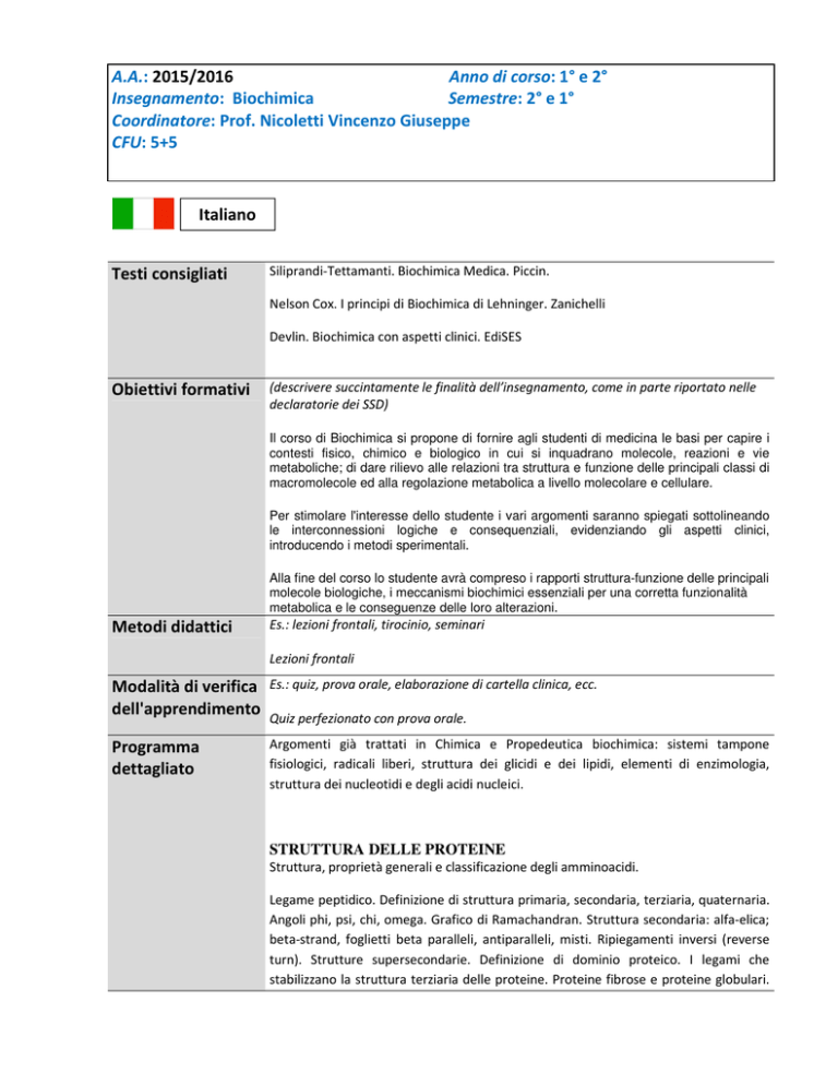 A.A.: 2015/2016 Anno di corso: 1° e 2° Insegnamento: Biochimica Semestre: 2° e 1° Coordinatore: Prof. Nicoletti Vincenzo Giuseppe CFU: 5+5 Italiano Testi consigliati Siliprandi-Tettamanti. Biochimica Medica. Piccin. Nelson Cox. I principi di Biochimica di Lehninger. Zanichelli Devlin. Biochimica con aspetti clinici. EdiSES Obiettivi formativi (descrivere succintamente le finalità dell’insegnamento, come in parte riportato nelle declaratorie dei SSD) Il corso di Biochimica si propone di fornire agli studenti di medicina le basi per capire i contesti fisico, chimico e biologico in cui si inquadrano molecole, reazioni e vie metaboliche; di dare rilievo alle relazioni tra struttura e funzione delle principali classi di macromolecole ed alla regolazione metabolica a livello molecolare e cellulare. Per stimolare l'interesse dello studente i vari argomenti saranno spiegati sottolineando le interconnessioni logiche e consequenziali, evidenziando gli aspetti clinici, introducendo i metodi sperimentali. Alla fine del corso lo studente avrà compreso i rapporti struttura-funzione delle principali molecole biologiche, i meccanismi biochimici essenziali per una corretta funzionalità metabolica e le conseguenze delle loro alterazioni. Metodi didattici Es.: lezioni frontali, tirocinio, seminari Lezioni frontali Modalità di verifica dell'apprendimento Es.: quiz, prova orale, elaborazione di cartella clinica, ecc. Programma dettagliato Argomenti già trattati in Chimica e Propedeutica biochimica: sistemi tampone fisiologici, radicali liberi, struttura dei glicidi e dei lipidi, elementi di enzimologia, struttura dei nucleotidi e degli acidi nucleici. Quiz perfezionato con prova orale. STRUTTURA DELLE PROTEINE Struttura, proprietà generali e classificazione degli amminoacidi. Legame peptidico. Definizione di struttura primaria, secondaria, terziaria, quaternaria. Angoli phi, psi, chi, omega. Grafico di Ramachandran. Struttura secondaria: alfa-elica; beta-strand, foglietti beta paralleli, antiparalleli, misti. Ripiegamenti inversi (reverse turn). Strutture supersecondarie. Definizione di dominio proteico. I legami che stabilizzano la struttura terziaria delle proteine. Proteine fibrose e proteine globulari. Classificazione strutturale delle proteine. Proteine fibrose: cheratine, fibroina della seta, collageno, elastina. Il collageno: struttura primaria, struttura secondaria (tripla elica allungata); sintesi e modificazioni post-traduzionali (idrossilazione delle proline e della lisina; ruolo dell’acido ascorbico; glicosilazioni; trasformazione del pro-collageno in collageno; ossidazione delle lisine e formazione di legami crociati). Proteine di membrana. Folding e denaturazione delle proteine. Misfolding proteico e patologie umane. Porfirine e gruppo eme. Struttura della mioglobina, dell’emoglobina e delle catene globiniche. Classificazione delle catene globiniche. Curva di saturazione con ossigeno dell'emoglobina e della mioglobina. L’emoglobina come proteina allosterica. Struttura dell’ossiemoglobina e della deossiemoglobina. Effetto Bohr; 2,3 BPG. Emoglobina e trasporto ematico della CO2. Emoglobina e regolazione dell’equilibrio acido-base. Emoglobina fetale. Basi molecolari delle emoglobinopatie e talassemie. Principi fondamentali delle tecniche per il dosaggio e la purificazione delle proteine (precipitazione, cromatografia, elettroforesi, ultracentrifugazione, dosaggi immunologici). Principi fondamentali delle tecniche per il sequenziamento e per la determinazione della struttura tridimensionale (cristallografia a raggi X, NMR) delle proteine. BIOENERGETICA MITOCONDRIALE Richiami di termodinamica chimica; variazione di energia libera standard; chimica dell'ATP e composti ad alta energia; Ruolo dell'ATP nella bioenergetica. Relazione tra variazione di energia libera standard e differenza di potenziale standard di ossidoriduzione. Coenzimi piridin-nucleotidici: NAD e NADP; struttura e funzione come trasportatori di idrogeno; coenzimi mobili; acido nicotinico e nicotinamide (vitamina PP). Catena mitocondriale di trasporto degli elettroni: membrana mitocondriale interna ed esterna; potenziali standard di ossidoriduzione dei componenti della catena di trasporto degli elettroni. Organizzazione della catena di trasporto degli elettroni in complessi lipoproteici della membrana interna (complesso I - II - III - IV) e componenti mobili (ubichinone e citocromo C). Coenzimi flavinici (Struttura e funzione come trasportatori di idrogeno; FMN e FAD, riboflavina o vitamina B2 ); Ferrosolfoproteine; Struttura e funzione dei citocromi; Struttura e funzioni del: Complesso I (NADHubichinone ossido reduttasi), Complesso II ( succinato-ubichinone ossido reduttasi), Complesso III (ubichinolo-citocromo C ossido reduttasi); Complesso IV (citocromo ossidasi). Inibitori del trasporto degli elettroni. Fosforilazione ossidativa: ATP sintasi mitocondriale (complesso V): struttura e funzione dei fattori F1 e Fo; rapporto P/O; ipotesi dell'accoppiamento chemiosmotico; gradiente elettrochimico di H+; controllo respiratorio; disaccoppianti. Termogenina e tessuto adiposo bruno. BIOCHIMICA METABOLICA Vitamine e coenzimi. Tiamina, riboflavina, piridossina, nicotinamide, acido pantotenico, coenzima A, biotina, acido folico, retinolo, calciferolo, acido ascorbico, funzioni della vitamina B12 Metabolismo glicidico Glicidi di importanza biologica: glicogeno, amido, disaccaridi, monosaccaridi. Glicolisi aerobica ed anaerobica: reazioni chimiche, enzimi e significato funzionale. Origine dell'acido lattico e lattico deidrogenasi (LDH). Fermentazione alcolica. Bilancio energetico della glicolisi. Decarbossilazione ossidativa dell'acido piruvico. Il ciclo degli acidi tricarbossilici o ciclo di Krebs: reazioni e bilancio energetico. Localizzazione mitocondriale degli enzimi. Glicogeno sintesi e glicogenolisi. Regolazione del metabolismo del glicogeno epatico e muscolare. Gluconeogenesi. Meccanismo d'azione dell'adrenalina, del