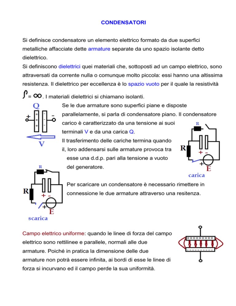 CONDENSATORI Si definisce condensatore un elemento elettrico formato da due superfici metalliche affacciate dette armature separate da uno spazio isolante detto dielettrico. Si definiscono dielettrici quei materiali che, sottoposti ad un campo elettrico, sono attraversati da corrente nulla o comunque molto piccola: essi hanno una altissima resistenza. Il dielettrico per eccellenza è lo spazio vuoto per il quale la resistività = . I materiali dielettrici si chiamano isolanti. Se le due armature sono superfici piane e disposte parallelamente, si parla di condensatore piano. Il condensatore carico è caratterizzato da una tensione ai suoi terminali V e da una carica Q. Il trasferimento delle cariche termina quando il, loro addensarsi sulle armature provoca tra esse una d.d.p. pari alla tensione a vuoto del generatore. Per scaricare un condensatore è necessario rimettere in connessione le due armature attraverso una resitenza. Campo elettrico uniforme: quando le linee di forza del campo elettrico sono rettilinee e parallele, normali alle due armature. Poiché in pratica la dimensione delle due armature non potrà essere infinita, ai bordi di esse le linee di forza si incurvano ed il campo perde la sua uniformità. Si è verificato sperimentalmente che la carica Q e la tensione V sono direttamente proporzionali: C = Q/V [Farad] C : CAPACITA’ del condensatore la cui unità di misura è chiamata FARAD [F] Un condensatore presenta la capacità di 1 Farad quando, applicando alle sue armature la tensione di 1 Volt si accumula la carica di 1 Coulomb. In pratica, essendo tale unità eccessivamente grande. Si impiegano i seguenti sottomultipli Nel campo elettrico del condensatore piano possono essere messi in evidenza le seguenti grandezze unitarie: Intensità di campo o gradiente di potenziale E=V/d [Volt/metro] Densità di carica sigma= =Q/A [Coulomb/m2] Sapendo che C= Q/V= *A/E*d= /E*(A/d)= *A/d /E rappresenta l’elemento qualitativo del dielettrico ed è costante per un ma dato materiale. Esso prende il nome di costante dielettrica ( ) 0: costante dielettrica nel vuoto (=aria secca) e vale 8,86*10-12[F/m]= 8,86[pF/m] r: costante dielettrica relativa (= / 0) Esercizio 1: determinare la capacità di un condensatore piano avente armature di area A=12 [dm2] a distanza d= 0,05 [mm] con dielettrico Soluzione: C= r* 0=4*8,86= r=4 35,4 [pF/m] *A/d= 35,4*0,12 / (0,05*10-3) = 85.000 [pF] =85 [nF] Esercizio 2: calcola la capacità di un condensatore che presenta una carica di 50 [µC] sulle armature per una tensione applicata di 10 [V] Soluzione: C = Q/V = 50*10-6 [C] / 10 [V] = 5*10-6 [F] = 5 [µF] Esercizio 3: calcola la carica accumulata sulle armature di un condensatore che ha la capacità di 0,001[µF], quando ai suoi capi viene applicata una tensione di 1[KV] Soluzione: Q = C*V = 0,001*10-6*1000 = 0,000001 [C] = 1 [µC] Esercizio 4: calcola la capacità di un condensatore piano ad aria secca con armature quadrate di lato 0,1 [m] poste alla distanza di 0,01 [m] Soluzione: = 0 (in quanto r=1) C= 0*A/d = 8,85*(0,12)/0,01 = 8,85 [pF] CORRENTE DI FUGA : nessun materiale isolante è perfetto e così attraverso il dielettrico di un condensatore in realtà passa sempre una piccolissima corrente detta corrente di fuga o corrente di perdita. Un condensatore reale può essere rappresentato da un circuito con un condensatore ideale avente in parallelo una resistenza elevata, ma non infinita, rappresentante la resistenza del dielettrico. INDUZIONE DIELETTRICA: con tale termine si intendono i fenomeni elettrostatici che interessano la sostanza interposta tra le armature di un condensatore. Gli elettroni dell’orbita più esterna rimangono ancorati al nucleo, ma per effetto delle forze colombiane, ovalizzano la propria orbita. Aumentando la tensione applicata ad un condensatore, si verifica un aumento della deformazione molecolare. Superato un valore limite, si verifica una violenta rottura dei legami che connettono gli elettroni ai nuclei atomici: questo provoca una scarica elettrica accompagnata da luce e rumore. Se il dielettrico è gassoso si ha la ionizzazione del gas, mentre se è solido si perfora: in ogni caso perde le sue capacità isolanti. Il massimo valore di tensione di lavoro che un dielettrico può sopportare prende il nome di rigidità dielettrica: Vi sono dei casi in cui la scarica viene utilmente sfruttata: p.e. nelle candele d’automobile Nei motori ad accensione comandata (a ciclo Otto) la candela d'accensione è il dispositivo elettrico inserito nella testa di ognuno dei cilindri atto a generare una scintilla che avvii la combustione della carica fresca. Nei motori ad accensione spontanea la combustione è invece avviata da una compressione, e le cosiddette candelette hanno il solo scopo di riscaldare il combustibile in una precamera durante gli avviamenti a freddo.