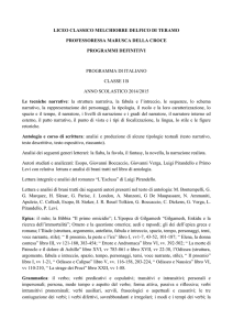 Percorso formativo disciplinare Disciplina: ____________________ ITALI ANO______________ CLASSE _1 Fa_____ LICEO_____RINALDINI__________ Anno scolastico ____2015-2016________ Prof. _____________G. Carboni_______ Ripasso delle parti variabili ed invariabili del discorso. Questioni importanti di ortografia. La punteggiatura, i suoi segni e la loro importanza. Il verbo ESSERE quando è copula e quando è predicato verbale. Gli ausiliari ESSERE e AVERE. Ripasso di modi e tempi dei verbi italiani. Verbi transitivi e verbi intransitivi. Forma attiva e forma passiva. Analisi logica, anche in preparazione al Latino: soggetto, predicato, complemento oggetto. I vari complementi. La forma attiva e quella passiva. Differenza fondamentale tra troncamento ed elisione. R. La Capria, CHE COS’E’ LA LETTERATURA. Lettura commentata del brano e riflessioni sull’enorme importanza della lettura. J. Marìas, CONTINUA A PENSARE. Lettura ragionata del brano e riflessioni sull’importanza della cultura e del sapere. LE TECNICHE NARRATIVE: La struttura narrativa. Che cos’è un testo narrativo; la scomposizione del testo in sequenze. M. TOURNIER, Lo specchio magico, un testo per capire. La fabula e l’intreccio. M. BONTEMPELLI, Il ladro Luca, ancora sulle sequenze narrative. G.G.MARQUEZ, Il fantasma Ludovico. Visione del film LE ALI DELLA LIBERTA’, con riflessioni e dibattito. Lo schema narrativo. E. HEMINGWAY, Una storia molto breve. H.SLESAR, Giorno d’esame. LA RAPPRESENTAZIONE DEI PERSONAGGI. J.D. SALINGER, L’anticonformismo. Lettura e ragionamento su tematiche adolescenziali. LO SPAZIO E IL TEMPO. LA FIABA E LA FAVOLA: C.COLLODI, Il naso di Pinocchio._LA LETTERATURA PSICOLOGICA: L. PIRANDELLO, Il treno ha fischiato. La struttura della COMUNICAZIONE e la fondamentale importanza del rispetto delle sue sei componenti. Funzioni: fàtica, metalinguistica, poetica. IL NARRATORE E IL PATTO NARRATIVO. C.R. ZAFON, L’ingresso nel “ Cimitero dei Libri Dimenticati “. Lettura graduale in classe del romanzo FAHRENHEIT 451, di Ray Bradbury ( non terminata ). IL PUNTO DI VISTA E LA FOCALIZZAZIONE: J. JOYCE, Eveline. I. CALVINO, La resistenza vista dallo sguardo di un bambino. Riflessioni. I vari tipi di testo: descrittivo, espositivo ecc. N. AMMANITI, Un ragazzo diverso dagli altri. APULEIO, La favola di Amore & Psiche. Il TESTO DESCRITTIVO: tutte le sue caratteristiche. Cos’è l’EPICA, e sua straordinaria importanza. L’epos e il mythos. Lettura di brani dalla GENESI. La QUESTIONE OMERICA. Lettura di brani dall’Iliade. La figura di Achille, antieroe,e quella di Ettore, vero eroe. Cenni alla astuzia di Odisseo, nel racconto della vicenda nell’antro di Polifemo. Assegnata, per l’Estate, lettura di alcuni romanzi. Il Docente Prof.___G. Carboni_____________ I Rappresentanti degli studenti ….............................................. …..............................................