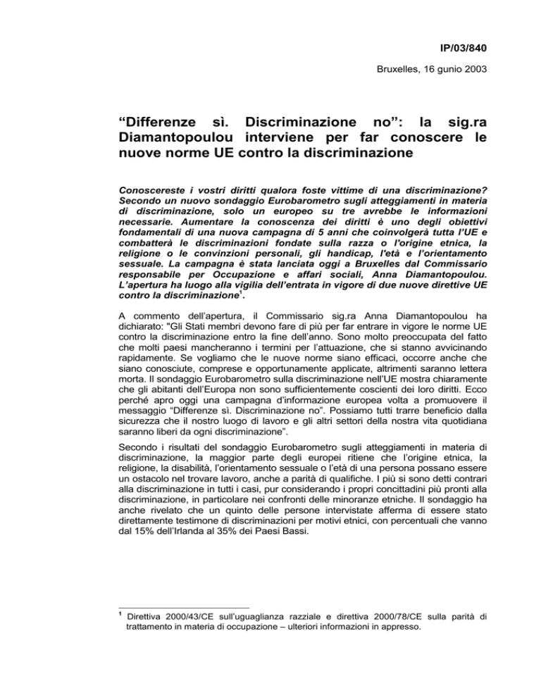IP/03/840 Bruxelles, 16 gunio 2003 “Differenze sì. Discriminazione no”: la sig.ra Diamantopoulou interviene per far conoscere le nuove norme UE contro la discriminazione Conoscereste i vostri diritti qualora foste vittime di una discriminazione? Secondo un nuovo sondaggio Eurobarometro sugli atteggiamenti in materia di discriminazione, solo un europeo su tre avrebbe le informazioni necessarie. Aumentare la conoscenza dei diritti è uno degli obiettivi fondamentali di una nuova campagna di 5 anni che coinvolgerà tutta l’UE e combatterà le discriminazioni fondate sulla razza o l'origine etnica, la religione o le convinzioni personali, gli handicap, l'età e l’orientamento sessuale. La campagna è stata lanciata oggi a Bruxelles dal Commissario responsabile per Occupazione e affari sociali, Anna Diamantopoulou. L’apertura ha luogo alla vigilia dell’entrata in vigore di due nuove direttive UE contro la discriminazione1. A commento dell’apertura, il Commissario sig.ra Anna Diamantopoulou ha dichiarato: "Gli Stati membri devono fare di più per far entrare in vigore le norme UE contro la discriminazione entro la fine dell’anno. Sono molto preoccupata del fatto che molti paesi mancheranno i termini per l’attuazione, che si stanno avvicinando rapidamente. Se vogliamo che le nuove norme siano efficaci, occorre anche che siano conosciute, comprese e opportunamente applicate, altrimenti saranno lettera morta. Il sondaggio Eurobarometro sulla discriminazione nell’UE mostra chiaramente che gli abitanti dell’Europa non sono sufficientemente coscienti dei loro diritti. Ecco perché apro oggi una campagna d’informazione europea volta a promuovere il messaggio “Differenze sì. Discriminazione no”. Possiamo tutti trarre beneficio dalla sicurezza che il nostro luogo di lavoro e gli altri settori della nostra vita quotidiana saranno liberi da ogni discriminazione”. Secondo i risultati del sondaggio Eurobarometro sugli atteggiamenti in materia di discriminazione, la maggior parte degli europei ritiene che l’origine etnica, la religione, la disabilità, l’orientamento sessuale o l’età di una persona possano essere un ostacolo nel trovare lavoro, anche a parità di qualifiche. I più si sono detti contrari alla discriminazione in tutti i casi, pur considerando i propri concittadini più pronti alla discriminazione, in particolare nei confronti delle minoranze etniche. Il sondaggio ha anche rivelato che un quinto delle persone intervistate afferma di essere stato direttamente testimone di discriminazioni per motivi etnici, con percentuali che vanno dal 15% dell’Irlanda al 35% dei Paesi Bassi. 1 Direttiva 2000/43/CE sull’uguaglianza razziale e direttiva 2000/78/CE sulla parità di trattamento in materia di occupazione – ulteriori informazioni in appresso. La consapevolezza dei diritti varia da un paese all’altro, ma nel complesso due terzi degli intervistati dice che non conoscerebbe i propri diritti se fosse vittima di discriminazione. Un obiettivo fondamentale della campagna d’informazione è colmare questa lacuna e far conoscere diritti e doveri sanciti dalle nuove norme europee, nonché sensibilizzare tutti sui benefici di una maggiore diversità in generale. Con lo slogan “Differenze sì. Discriminazione no”2, la campagna si concentrerà, nel primo anno, sulla discriminazione sul luogo di lavoro, rivolgendosi in particolare ai sindacati e ai datori di lavoro. Il manifesto della campagna mostra l’aspetto estremo della discriminazione sul luogo di lavoro, con sagome identiche e prive di tratti distintivi che svolgono un normale lavoro d’ufficio. La didascalia “Le nostre differenze fanno la differenza” richiama l’attenzione sugli aspetti positivi della diversità sia per i datori di lavoro che per i lavoratori. Come hanno dimostrato i recenti premi europei per la diversità sul posto di lavoro3, sempre più aziende sono interessate alla diversità per motivi economici, e non soltanto per soddisfare le norme. Le politiche della diversità fanno sempre più spesso parte della strategia più generale delle imprese volta a consolidare il capitale umano e a incoraggiare creatività e innovazione. I datori di lavoro riconoscono anche che la diversità può promuovere l’immagine della loro azienda e conferirle un vantaggio concorrenziale nei rapporti con clienti, fornitori e azionisti. Il sito Internet della campagna - www.stop-discrimination.info -, in rete da oggi, comprende una guida pratica alle nuove norme europee e una sintesi del sondaggio Eurobarometro. I gruppi consultivi nazionali, composti da autorità nazionali, parti sociali e ONG, svilupperanno nei prossimi mesi, nel quadro della campagna, azioni nazionali con manifestazioni, seminari e attività di comunicazione. La partecipazione dei soggetti sopra indicati è fondamentale per garantire la soddisfazione delle esigenze specifiche di ciascun paese e il collegamento con le attività d’informazione in atto. Lo scorso gennaio è stato istituito un gruppo consultivo a livello UE, composto da rappresentanti delle parti sociali europee, dalla Piattaforma europea delle ONG sociali e da rappresentanti di governo degli Stati membri, che fornirà il proprio parere sugli aspetti paneuropei della campagna, ad es. per quanto riguarda il manifesto, lo slogan, il sito. Contesto La nuova normativa europea adottata nel 2000 vieta la discriminazione razziale sul lavoro e in altri settori, come la formazione, l’istruzione e l’accesso a beni e servizi, compreso l’alloggio. Un secondo strumento normativo proibisce la discriminazione sul lavoro e in materia di formazione per motivi di religione e convinzioni personali, handicap, età e orientamento sessuale. - La direttiva sulla parità di trattamento indipendentemente dalla razza e dall'origine etnica vieta la discriminazione fondata sulla razza o l’origine etnica e riguarda la maggior parte dei settori della vita quotidiana in cui direttamente o in