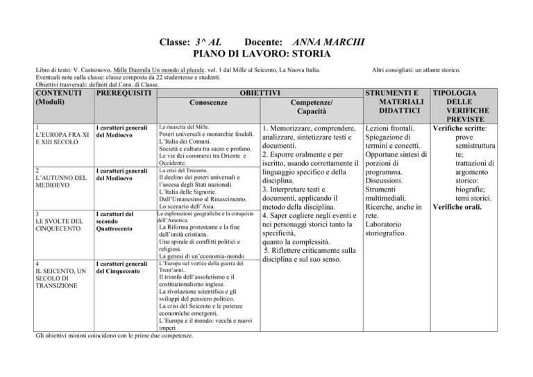 Classe: 3^ AL Docente: ANNA MARCHI PIANO DI LAVORO: STORIA Libro di testo: V. Castronovo, Mille Duemila Un mondo al plurale, vol. 1 dal Mille al Seicento, La Nuova Italia. Eventuali note sulla classe: classe composta da 22 studentesse e studenti. Obiettivi trasversali: definiti dal Cons. di Classe. CONTENUTI (Moduli) PREREQUISITI OBIETTIVI 1 L’EUROPA FRA XI E XIII SECOLO I caratteri generali del Medioevo La rinascita del Mille. 2 L’AUTUNNO DEL MEDIOEVO I caratteri generali del Medioevo La crisi del Trecento. 3 LE SVOLTE DEL CINQUECENTO I caratteri del secondo Quattrocento 4 IL SEICENTO, UN SECOLO DI TRANSIZIONE I caratteri generali del Cinquecento Conoscenze Poteri universali e monarchie feudali. L’Italia dei Comuni. Società e cultura tra sacro e profano. Le vie dei commerci tra Oriente e Occidente. Il declino dei poteri universali e l’ascesa degli Stati nazionali L’Italia delle Signorie. Dall’Umanesimo al Rinascimento. Lo scenario dell’Asia. Le esplorazioni geografiche e la conquista dell’America. La Riforma protestante e la fine dell’unità cristiana. Una spirale di conflitti politici e religiosi. La genesi di un’economia-mondo L’Europa nel vortice della guerra dei Trent’anni.. Il trionfo dell’assolutismo e il costituzionalismo inglese. La rivoluzione scientifica e gli sviluppi del pensiero politico. La crisi del Seicento e le potenze economiche emergenti. L’Europa e il mondo: vecchi e nuovi imperi Gli obiettivi minimi coincidono con le prime due competenze. Altri consigliati: un atlante storico. STRUMENTI E MATERIALI DIDATTICI TIPOLOGIA DELLE Competenze/ VERIFICHE Capacità PREVISTE 1. Memorizzare, comprendere, Lezioni frontali. Verifiche scritte: analizzare, sintetizzare testi e Spiegazione di prove documenti. termini e concetti. semistruttura 2. Esporre oralmente e per Opportune sintesi di te; iscritto, usando correttamente il porzioni di trattazioni di linguaggio specifico e della programma. argomento disciplina. Discussioni. storico: 3. Interpretare testi e Strumenti biografie; documenti, applicando il multimediali. temi storici. metodo della disciplina. Ricerche, anche in Verifiche orali. 4. Saper cogliere negli eventi e rete. nei personaggi storici tanto la Laboratorio specificità, storiografico. quanto la complessità. 5. Riflettere criticamente sulla disciplina e sul suo senso. PIANO DI LAVORO: FILOSOFIA Libro di testo: N. Abbagnano, G. Fornero, Filosofia La ricerca del pensiero, voll. 1a Dalle origini ad Aristotele, 1b Dall’Ellenismo alla Scolastica, Paravia CONTENUTI (Moduli) PREREQUISITI OBIETTIVI Conoscenze Le indagini sulla natura: il pensiero Le coordinate storico-culturali della presocratico civiltà greca arcaica. La ricerca del principio: - la scuola di Mileto; - Pitagora e i pitagorici - Eraclito Il problema dell’essere: - Parmenide - Zenone Il principio come sostanza complessa: - Empedocle - Anassagora - Democrito e l’atomismo L’indagine sull’uomo: i sofisti, Protagora, 2 Le coordinate Gorgia e Socrate L’ETÀ CLASSICA storico-culturali della Platone civiltà greca classica Aristotele Le filosofie ellenistiche e il neoplatonismo 3 Le coordinate - stoicismo L’ETÀ storico-culturali della - epicureismo ELLENISTICA civiltà ellenistica - scetticismo - neoplatonismo: Plotino La Patristica e Agostino 4 Il Cristianesimo e i La Scolastica e Tommaso L’ETÀ TARDOcaratteri storico ANTICA E culturali dell’alto MEDIEVALE medioevo Gli obiettivi minimi coincidono con le prime due competenze. 1 L’ETÀ ARCAICA Competenze/ Capacità 1. Memorizzare, comprendere, analizzare sintetizzare testi. 2. Esporre oralmente e per iscritto, usando correttamente il linguaggio specifico della disciplina. 3. Saper interpretare i testi, riflettendo criticamente. 4. Saper mettere in relazione le diverse proposte filosofiche col presente. STRUMENTI E MATERIALI DIDATTICI Lezioni frontali. Spiegazione di termini e concetti. Discussioni. Strumenti multimediali. Ricerche, anche in rete. TIPOLOGIA DELLE VERIFICHE PREVISTE Verifiche scritte: prove semistruttura te. trattazioni di argomento filosofico: saggio breve o articolo di giornale. Verifiche orali. Anna Marchi