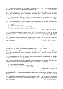 Corso di Laurea in Scienze Naturali e Ambientali Prova scritta di Fisica Generale 18 Luglio 2016 Problema 1 All’interno di un ascensore di massa M ed altezza H si trovano una persona, di massa mp , ferma sopra ad una bilancia (di massa trascurabile) ed una massa m appesa ad un estremo di una molla (di costante elastica k e massa trascurabile) il cui altro estremo è fissato al soffitto. ~ diretta verso L’ascensore sta scendendo con un’accelerazione costante A il basso, con A < g dove ~g è l’accelerazione di gravità. All’interno dell’ascensore la persona e la massa m appesa alla molla sono ferme. Si determini: 1) l’allungamento della molla, 2) il peso indicato dalla bilancia, 3) la tensione del cavo che sostiene l’ascensore. Adesso si supponga che la persona lanci verso l’alto, da un’altezza h rispetto al pavimento dell’ascensore, una pallina di massa mb con velocità iniziale ~v0b . Ricordando che l’altezza dell’ascensore è H 4) si trovi il valore massimo che il modulo della velocità ~v0b può avere con la condizione che la pallina non tocchi il soffitto dell’ascensore. 5) Si determini, infine, quanto tempo impiega la pallina a raggiungere il pavimento dell’ascensore supponendo che la velocità iniziale sia quella calcolata nella risposta precedente. Problema 2 Si consideri una distribuzione di carica cilindrica che abbia il raggio di base R = 4cm ed un’altezza che, per i nostri scopi, possa essere considerata ”infinita”, in pratica un lungo (”infinito”) filo rettilineo di raggio R. La densità di carica sia ρ = 2, 5mC/m3 . 6) Si trovi la carica racchiusa da questa distribuzione in un tratto (parallelo all’asse del cilindro) di lunghezza pari a L = 70cm. 7) Utilizzando il Teorema di Gauss si trovi il modulo del campo elettrico a distanza r1 = 2cm dall’asse del cilindro ”infinito” e 8) a distanza r2 = 5cm dall’asse del cilindro ”infinito”. Adesso si consideri un guscio cilindrico, anch’esso di lunghezza ”infinita”, di raggio interno rint e raggio esterno rext , con una densià di carica costante ρ1 > 0. Utilizzando il Teorema di Gauss si determini il modulo del campo elettrico 9) per r < rint e 10) per r > rext . Soluzioni Problema 1 1) All’interno dell’ascensore - che risulta essere un sistema non inerziale data la sua accelerazione ~ e tutto è fermo. Sulla massa collegata alla molla agiscono tre forze: il peso (m~g ), la forza elastica (−k ∆l) la forza apparente (siamo in un sistema non inerziale) dovuta all’accelerazione verso il basso dell’ascensore, ~ Quindi in definitiva sulla massa m agiscono questa forza apparente agente sulla massa m sarà F~a = −mA. due forze verso l’alto (forza elastica e forza apparente) e una forza verso il basso (la forza peso) e siccome, come già detto, tutto è fermo, si avrà equilibrio fra queste tre forze: k∆l + mA = mg da cui l’allungamento della molla richiesto: ∆l = m(g − A) k Si noti che se fosse A > g la molla risulterebbe compressa. 2) Il peso indicato dalla bilancia è pari al (/uguaglia il) modulo della forza agente su di essa dovuta alla persona, tale forza non è altro che una delle due forze di azione-reazione fra bilancia e persona. Sulla ~ del piano della bilancia persona agiscono tre forze: la forza peso, la forza apparente e la reazione R ~ ad essere una forza della coppia azione-reazione fra bilancia e persona, ed è proprio questa reazione R ~ ed è appunto questa ad essere ”segnata” dalla bilancia stessa. infatti la forza agente sulla bilancia è −R ~ agente sulla persona equivale a trovare il peso indicato dalla Cosı̀ determinare il modulo della reazione R bilancia. Allora, tenuto conto di tutto quello che abbiamo detto scriviamo la seconda legge di Newton per la persona ferma rispetto all’ascensore: mp g − mp A − R = 0 da cui si ricava R = mp (g − A) cioè il peso indicato dalla bilancia. 3) La seconda legge di Newton per il sistema ”ascensore” è: M g + mp g + mg − T = (M + mp + m)A da cui la tensione del cavo richiesta: T = (M + mp + m)(g − A) 4) La pallina di massa mb una volta che lascia la mano della persona è sottoposta a due forze: la forza peso mb g rivolta verso il basso e la forza apparente mb A rivolta verso l’alto; in pratica è come se fosse sottoposta ad un’accelerazione di gravità ridotta, pari a g−A, diretta verso il basso e costante, quindi il suo moto sarà uniformemente accelerato. Detto questo per trovare la velocità massima richiesta, v0bmax , cioè la massima velocità che permette comunque alla pallina di non colpire il soffitto dell’ascensore, possiamo utilizzare la relazione del moto uniformemente accelerato che lega velocità, accelerazione e spostamento (imponendo che sia 0 la velocià all’altezza del soffitto dell’ascensore): 2 0 − v0bmax =H −h −2(g − A) da cui v0bmax = q 2(H − h)(g − A) 5) Considerando come riferimento un asse verticale diretto verso l’alto e con origine sul pavimento dell’ascensore, il tempo ∆tb che serve alla pallina per raggiungere il pavimento si ottiene utilizzando la legge oraria del moto uniformemente accelerato: − g−A 2 ∆t + v0bmax ∆t + h = 0 2 le cui soluzioni sono: ∆t1,2 = −v0bmax ± q 2 v0bmax + 2(g − A)h −(g − A) e quella che ci interessa è quella con il segno +, cioè quella che risulta positiva (dovendo essere ∆t un intervallo di tempo), quindi ∆tb = v0bmax + q 2 v0bmax + 2(g − A)h (g − A) Problema 2 6) Per calcolare la carica racchiusa qL in un tratto L è sufficiente moltiplicare la densità (costante) per il volume di questo tratto (cilindro di raggio di base R e altezza L), quindi: qL = ρV = ρπR2 L = 8, 80µC 7) Consideriamo come superficie gaussiana un cilindro, coassiale alla distribuzione di carica, di raggio r1 e altezza h. Il campo elettrico per la simmetria cilindrica della distribuzione di carica sarà diretto radialmente e sarà uscente (poiché la carica è positiva), cioè giacerà su 