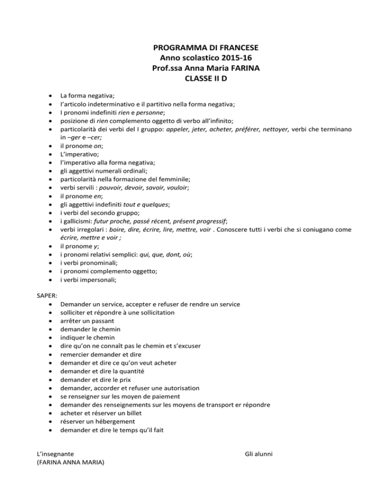 PROGRAMMA DI FRANCESE Anno scolastico 2015-16 Prof.ssa Anna Maria FARINA CLASSE II D SAPER: La forma negativa; I’articolo indeterminativo e il partitivo nella forma negativa; I pronomi indefiniti rien e personne; posizione di rien complemento oggetto di verbo all’infinito; particolarità dei verbi del I gruppo: appeler, jeter, acheter, préférer, nettoyer, verbi che terminano in –ger e –cer; il pronome on; L’imperativo; l’imperativo alla forma negativa; gli aggettivi numerali ordinali; particolarità nella formazione del femminile; verbi servili : pouvoir, devoir, savoir, vouloir; il pronome en; gli aggettivi indefiniti tout e quelques; i verbi del secondo gruppo; i gallicismi: futur proche, passé récent, présent progressif; verbi irregolari : boire, dire, écrire, lire, mettre, voir . Conoscere tutti i verbi che si coniugano come écrire, mettre e voir ; il pronome y; i pronomi relativi semplici: qui, que, dont, où; i verbi pronominali; i pronomi complemento oggetto; i verbi impersonali; Demander un service, accepter e refuser de rendre un service solliciter et répondre à une sollicitation arrêter un passant demander le chemin indiquer le chemin dire qu’on ne connaît pas le chemin et s’excuser remercier demander et dire demander et dire ce qu’on veut acheter demander et dire la quantité demander et dire le prix demander, accorder et refuser une autorisation se renseigner sur les moyen de paiement demander des renseignements sur les moyens de transport er répondre acheter et réserver un billet réserver un hébergement demander et dire le temps qu’il fait L’insegnante (FARINA ANNA MARIA) Gli alunni