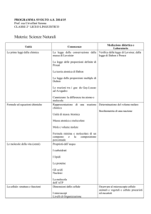 Liceo Scientifico Federico II di SveviaClasse : IBscientifico PROGRAMMA DI SCIENZE Prof.ssa Maria Grazia GiorgioAnno scolastico 2014/2015 Programma di Chimica Testo in uso :La Chimica per Noi - Autori : Fabio Tottola, Aurora Allegrezza e Marilena Righetti - Casa Editrice : Mondadori Sistema internazionale : Multipli e sottomultipli Grandezze Fondamentali : Massa, Lunghezza, Tempo e Temperatura Grandezze Derivate : Aria, Volume, Densità, Forza, Energia e Pressione Notazione scientifica Grandezze Intensive ed Estensive Precisone e Accuratezza Le cifre significative Stati di aggregazione della materia; Passaggi di stato Miscugli Omogenei ed Eterogenei Metodi di separazione : Distillazione, Cromatografia, Estrazione con solvente, Decantazione,Filtrazione e Centrifugazione Trasformazioni Chimiche e Fisiche Composti ed elementi, Simboli Chimici, Sostanze Pure Le Prime leggi della Chimica :Lavoiser “La conservazione della massa” Proust“La costanza della composizione nei composti” Dalton“La teoria atomica” e “La legge delle proporzioni multiple” GayLussac “Reazioni tra gas” Avogadro“ La teoria Atomico - Molecolare” Cannizzaro“La differenza tra atomo e molecola” Mendeleev “La tavola periodica degli elementi” Le equazioni chimiche: scrittura reazioni Massa Atomica e Massa Molecolare La Mole : L’unità del Chimico La Massa Molare Il volume molare dei gas Formula e composizione di un composto : La formula minima e molecolare di un composto Caratteristiche e proprietà delle soluzioni Soluto e solvente Solubilità : Soluzioni sature e insature 1 Programma di Biologia Testo in uso :Alberghina la Biologia – Autori: Lilia Alberghina e Franca Tonini Casa Editrice :Mondadori I livelli di Organizzazione della vita Le caratteristiche dei viventi Le proprietà della vita Il metodo sperimentale Un’applicazione del metodo scientifico alle scienze della vita Le strutture e le proprietà degli atomi I legami atomici L’acqua La scala dei pH Il carbonio I gruppi Funzionali I costituenti molecolari delle cellule : Le 4 macromolecole fondamentali Le proteine Gli acidi nucleici : DNA e RNA I Lipidi I Glucidi Moderna teoria cellulare Il Microscopio Le dimensioni della cellula La Cellula Procariote e la Cellula Eucariote La Cellula Vegetale Le Formazioni extracellulari prof.ssa Maria Grazia Giorgio 2