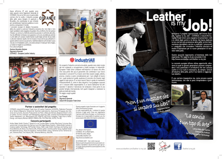 Avevo all’incirca 27 anni quando sono stato assunto come Segretario Generale di COTANCE. Ora ne ho 54 e non mi pento della carriera che ho scelto. L’industria europea della pelle aveva bisogno di qualcuno a Bruxelles che coordinasse le sue richieste per sensibilizzare l’opinione pubblica e io ero pronto a conquistare il mondo. I conciatori europei mi diedero l’occasione della vita: aiutarli a costruire l’industria conciaria che i loro figli e i loro nipoti sarebbero stati orgogliosi di guidare. Era un’offerta che non potevo rifiutare. La concia è un’attività economica piccola in confronto alle altre, ma che diffonde ricchezza e occupazione. Lo fa con una delle più antiche e umili delle arti umane; trasformando le pelli degli animali nel più bello e utile dei materiali. Quello che ho trovato e trovo tutt’ora più attraente in questo settore sono le sue persone, nobilitate dalla loro arte di dare nuova vita ad un irrimediabile scarto, cercando sempre il modo per farlo meglio, e rivelare al meglio la sua bellezza. È la cultura all’opera! Gustavo Gonzalez-Quijano Segretario Generale COTANCE - European Leather Industry Leather is my Job! Attraverso il progetto sponsorizzato dall’Unione Europea, ‘Leather is my Job! ’, COTANCE e industriAll-European Trade Union sono orgogliosi di presentare i volti e le storie degli uomini e le donne che hanno dedicato la loro carriera alla produzione della pelle. Le loro testimonianze dovrebbero servire a sradicare i preconcetti e i pregiudizi che circondano l’industria conciaria ed essere d’ispirazione per le nuove generazioni di lavoratori della pelle. David Hinds, Scottish Leather Group Questo opuscolo rappresenta un’istantanea delle loro esperienze. Per saperne di più consultate il link http://www.euroleather.com/leather-is-my-job. Lee Oddy, Charles F. Stead & Co Ltd Le concerie europee offrono ottime opportunità, attraverso le quali le giovani generazioni possono comprendere il loro potenziale in un’industria che non conosce confini e il cui ruolo è necessario, da sempre. Unisciti all’industria della pelle, porta il tuo talento e raggiungi i tuoi obiettivi. Ho scoperto l’industria conciaria da adulto, quando sono stato inviato dal mio sindacato a occuparmene a livello europeo. In industriAllEuropean Trade Union crediamo nell’industria e al lavoro che offre. Che cosa potrei dire ad un giovanotto che contempla il suo futuro lavorando in conceria? È un lavoro vero! Devi essere sveglio, attento, preciso, creativo e avere considerazione per i tuoi colleghi di lavoro con i quali produrrai la pelle, qualcosa di concreto che troverai negli oggetti di ogni giorno. È un buon lavoro! Sarai in grado di mantenerti finanziariamente. E, come in altre industrie, il tuo guadagno crescerà con il crescere delle responsabilità. È un lavoro bellissimo! Gli altri lavoratori ti daranno il benvenuto nel sindacato e farai parte di una grande famiglia internazionale, tutti quanti impegnati a realizzare la pelle più bella del mondo. Sii saggio, scegli la pelle! È una carriera impegnativa ma, come provano queste testimonianze, che vale la pena intraprendere e gratificante. Luc Triangle Segretario Generale industriAll-European Trade Union Questo progetto è stato finanziato con il supporto della Commissione Europea. La sola responsabilità per i contenuti di questa brochure è degli autori. Essa non rappresenta l’opinione dell’Unione Europea. La Commissione Europea non è responsabile di qualsiasi uso che possa essere fatto delle informazioni contenutevi. Per ulteriori informazioni: COTANCE, 40 rue Washington, B-1050 Bruxelles, Belgio [email protected] http://www.euroleather.com Immagine di copertina: Laurent Muzica, Tannerie Carriat Partner e sostenitori del progetto: COTANCE; industriAll-European Trade Union; UK Leather Federation; ACEXPIEL; Fédération Française de la Tannerie-Mégisserie; Verband der Deutchen Lederindustrie; Associacao Portuguesa dos Industriais de Curtumes; Asociatia Producatorilor de Piele si Blana din Romana; Bulgarian Branch Union of Leather, Furriers, Footwear and Haberdashery Industries; UNIC; Svenska Garveriidkareforeningen; Textile, Habillement, Cuir, Blanchisserie-CGT; FESETE; UGT-FICA; Confpeltex, Trade Union of Mine-, Energy- and Industry Workers (BDSZ), FEMCA-CISL, FILCTEM-CGIL, UILTEC, Pro-GE. © COTANCE 2017 - Tutti i diritti riservati. Nessuna parte di questa brochure può essere utilizzata o riprodotta in alcuna forma o per ogni altro scopo senza preventiva autorizzazione scritta di COTANCE. www.euroleather.com/leather-is-my-job Concerie partecipanti: Antiba, Bader GmbH, Charles F Stead & Co Ltd, Curtidos Badia, Curtidos Riba Guixá, Curtumes Boaventura Lda, Curtumes Iberia SA, Dermys Louro SA, Eagle Ottawa, Gmelich + Söhne GmbH, Institute of Creative Leather Technology, HCP-Gordon Choisy, Heller-Leder GmbH, Hutchings and Harding, Iacob Prod, INDUCOL SA, Miret y Cía, Pielorex SRL, Pittards Leather, Scottish Leather Group, Sudleder GmbH, Rino Mastrotto Group, Russo di Casandrino, Tanneries Bodin-Joyeux, Tanneries Carriat, Tanneries Dupire, Tanneries Roux, Taro Industry SRL, Tehnomat Merkuriy, Vesa SRL. e h c e r e i t s e m n u è ” i “Non r b i l i u s a r a p m si i Mariet Stéphane yeux Bodin-Jo Tannerie “La concia è un tipo di arte” Leticia Melo dos Santos Dottoranda, Inst itute for Creative Leat her Technology /leather.is.my.job «Il risultato della rifinizione mi dà grande soddisfazione. La pelle è raffinata; ha un colore uniforme, una certa brillantezza o tocco a seconda dei casi, un’uniformità di superficie, che fanno parte della tua anima e dello sforzo prodotto durante il lavoro» «Mi piace la grande varietà di problematiche che vanno risolte; il fatto che comprenda sia il lavoro d’ufficio che sul campo, mentre si migliora costantemente il processo per rispondere ai cambiamenti normativi» Maria Dulceata, Addetto alla rifinizione, Taro, Romania Gabriel Popescu,