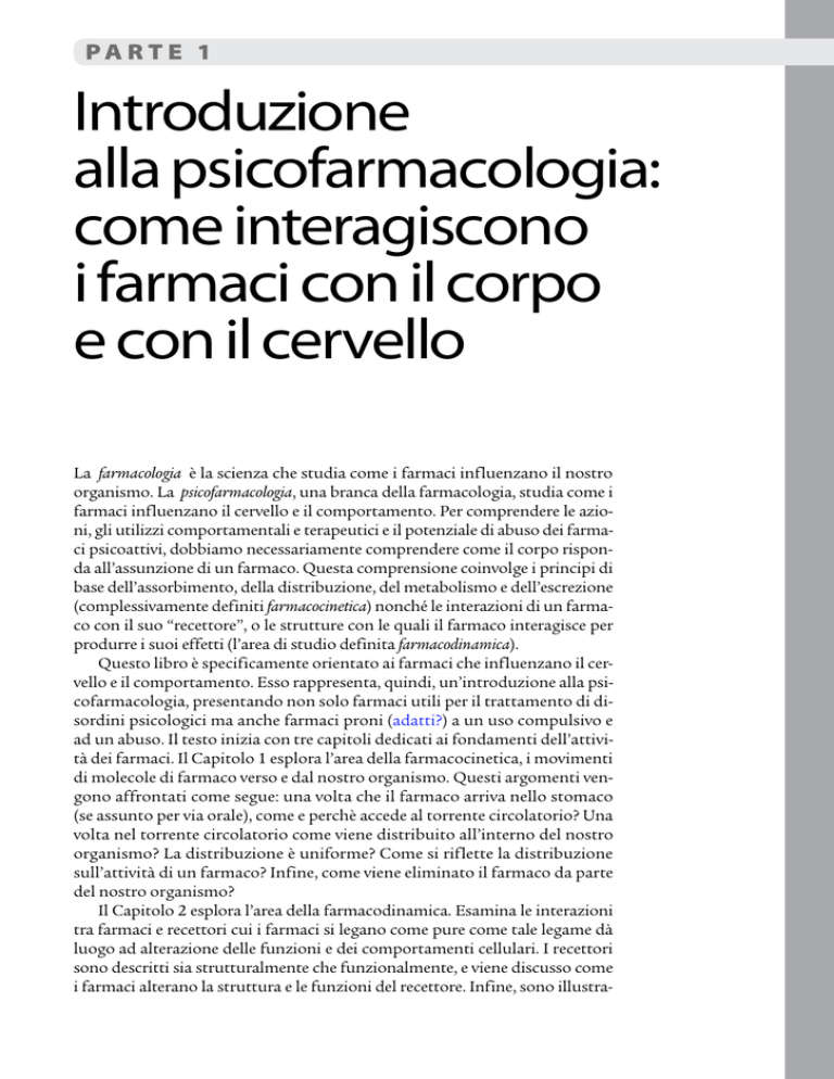 PA R T E 1 © 978-88-08-19583-8 Introduzione alla psicofarmacologia: come interagiscono i farmaci con il corpo e con il cervello La farmacologia è la scienza che studia come i farmaci influenzano il nostro organismo. La psicofarmacologia, una branca della farmacologia, studia come i farmaci influenzano il cervello e il comportamento. Per comprendere le azioni, gli utilizzi comportamentali e terapeutici e il potenziale di abuso dei farmaci psicoattivi, dobbiamo necessariamente comprendere come il corpo risponda all’assunzione di un farmaco. Questa comprensione coinvolge i principi di base dell’assorbimento, della distribuzione, del metabolismo e dell’escrezione (complessivamente definiti farmacocinetica) nonché le interazioni di un farmaco con il suo “recettore”, o le strutture con le quali il farmaco interagisce per produrre i suoi effetti (l’area di studio definita farmacodinamica). Questo libro è specificamente orientato ai farmaci che influenzano il cervello e il comportamento. Esso rappresenta, quindi, un’introduzione alla psicofarmacologia, presentando non solo farmaci utili per il trattamento di disordini psicologici ma anche farmaci proni (adatti?) a un uso compulsivo e ad un abuso. Il testo inizia con tre capitoli dedicati ai fondamenti dell’attività dei farmaci. Il Capitolo 1 esplora l’area della farmacocinetica, i movimenti di molecole di farmaco verso e dal nostro organismo. Questi argomenti vengono affrontati come segue: una volta che il farmaco arriva nello stomaco (se assunto per via orale), come e perchè accede al torrente circolatorio? Una volta nel torrente circolatorio come viene distribuito all’interno del nostro organismo? La distribuzione è uniforme? Come si riflette la distribuzione sull’attività di un farmaco? Infine, come viene eliminato il farmaco da parte del nostro organismo? Il Capitolo 2 esplora l’area della farmacodinamica. Esamina le interazioni tra farmaci e recettori cui i farmaci si legano come pure come tale legame dà luogo ad alterazione delle funzioni e dei comportamenti cellulari. I recettori sono descritti sia strutturalmente che funzionalmente, e viene discusso come i farmaci alterano la struttura e le funzioni del recettore. Infine, sono illustra- Parte 1 1 2 Parte 1 © 978-88-08-19583-8 te le modalità con le quali tali attività sono alla base degli effetti terapeutici e degli effetti collaterali. Il Capitolo 3 applica le conoscenze di farmacologia di base alle attività specifiche dei farmaci sul cervello e sul comportamento. Per i lettori che non possiedono una preparazione in neuroscienze, vengono spiegate la struttura e le funzioni dei neuroni, in considerazione del fatto che i farmaci psicoattivi esercitano i loro effetti su varie parti dei neuroni. Ci focalizzeremo in particolare sull’area di congiunzione tra neuroni, definita sinapsi. Studiando le modalità di trasmissione sinaptica e specifici neurotrasmettitori, iniziamo a comprendere il meccanismo d’azione dei farmaci psicoattivi come pure la complessità del funzionamento del cervello sia in salute che durante la presenza di patologie. Il processo della trasmissione sinaptica non è un processo statico, ma piuttosto i neuroni hanno la capacità di rimodellarsi continuamente, un fenomeno definito plasticità sinaptica. Questo processo è coinvolto nell’apprendimento e nella memoria ma anche in patologie come la depressione e l’ansia. In un cervello sano e funzionante questo processo di plasticità sinaptica porta a un continuo rimodellamento in risposta all’ambiente. I neuroni sani formano continuamente nuovi contatti sinaptici, mantenendo la meravigliosa architettura esistente attraverso sane interazioni con milioni di altri neuroni. PA R T E 2 © 978-88-08-19583-8 Farmaci utilizzati per il trattamento dei disturbi psicologici Ora che sono stati trattati i principi di base della farmacologia (farmacocinetica e farmacodinamica) e la fisiologia di base del sistema nervoso e della trasmissione sinaptica, i capitoli di questa parte del testo introducono i farmaci che sono usati per il trattamento dei disturbi psicologici. Questi farmaci includono gli antipsicotici tradizionali e atipici (Capitolo 4), gli antidepressivi (Capitolo 5), gli stabilizzatori dell’umore per il trattamento del disturbo bipolare (Capitolo 6) e i farmaci utilizzati tradizionalmente per il trattamento dell’ansia e dell’insonnia (Capitolo 7). Il Capitolo 8 discute i prodotti erboristici e altri prodotti naturali (per esempio gli acidi grassi omega-3) utilizzati nel trattamento di disturbi psicologici. Più avanti nel testo (Parte 5), discuteremo dell’utilizzo di questi farmaci in popolazioni particolari (i bambini e gli anziani) come pure nell’ambito dei principi generali della gestione dei disturbi della salute mentale. Attualmente siamo arrivati a un significativo avanzamento nel trattamento farmacologico di disturbi psicologici, permettendo ai soggetti affetti da tali patologie di condurre vite molto più “normali” di quanto lo sarebbero state in qualsiasi altro momento della storia dell’uomo. Gli obiettivi di questi cinque capitoli sono quindi quelli di impartire una conoscenza relativamente allo sviluppo storico delle terapie di ciascun disturbo, di coprire la farmacologia dei farmaci utilizzati al momento per il trattamento di questi disturbi, e infine di fornire la sensazione di eccitazione che si associa all’aspettativa di terapie ancora migliori. I farmaci sono stati compartimentalizzati in questi capitoli all’interno di titoli descrittivi (antidepressivi, stabilizzatori dell’umore, antipsicotici e così via), ma i titoli non sono in grado di definire o anche solo descrivere adeguatamente i farmaci. Per esempio, oltre a essere utilizzati per dare sollievo alla depressione maggiore, gli antidepressivi sono usati come farmaci antiansia, analgesici e antidistimici. Molti dei farmaci stabilizzatori dell’umore, oltre a essere utilizzati per il tratt
