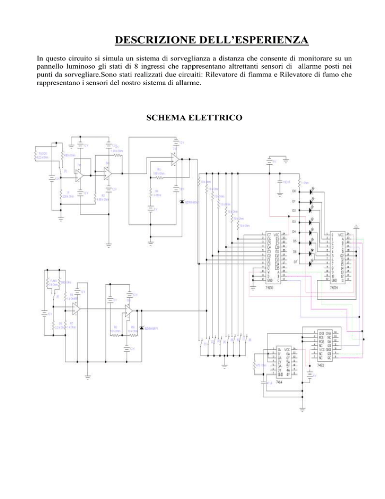 DESCRIZIONE DELL’ESPERIENZA In questo circuito si simula un sistema di sorveglianza a distanza che consente di monitorare su un pannello luminoso gli stati di 8 ingressi che rappresentano altrettanti sensori di allarme posti nei punti da sorvegliare.Sono stati realizzati due circuiti: Rilevatore di fiamma e Rilevatore di fumo che rappresentano i sensori del nostro sistema di allarme. SCHEMA ELETTRICO Introduzione teorica Il circuito realizzato è essenzialmente costituito dai seguenti blocchi: Acquisizione dati sensori Generatore di impulsi clock (astabile) Dmx Mux Interfacce di uscita Contatore binario a Modulo 8 Si parte ora ad analizzare il controllo del sistema di sorveglianza che spetta essenzialmente al MULTIPLEXER e al DEMULTIPLEXER.Gli ingressi 1 ÷ 8 rappresentano i sensori del sistema di allarme e sono costituiti da altrettanti interruttori normalmente aperti che vengono applicati agli ingressi E0 ÷ E7 del MULTIPLEXER 74LS150.Sono collegati in modo da fornire un livello alto quando sono aperti(OFF) ed un livello basso quando sono chiusi(ON).Si assume come stato di allarme la posizione ON e quindi il livello logico 0 sugli ingressi. Dalle specifiche fornite dal costruttore del MUX si evince che gli ingressi a disposizione sono 16 con un controllo di 4 selettori(A,B,C,D);per tanto dovendo utilizzare solamente otto degli ingressi, il selettore del bit più significativo (D) è stato posto a massa. Il pannello di controllo è costituito da 8 LED collegati alle uscite del DEMUX 74LS154 , attive a livello alto. Nel DEMUX (come nel MUX) volendo visualizzare solamente otto degli ingressi, il selettore del bit più significativo (D) è stato posto a massa.Gli ingressi di selezione de MUX e del DEMUX vengono fatte scorrere sequenzialmente dal contatore modulo 8 realizzato con l’integrato 74LS93.L’ingresso del contatore è comandato da un generatore di clock con frequenza di circa …….. realizzato con due porte trigger.Il clock fa scorrere sequenzialmente le otto combinazioni del contatore,per ognuna di queste viene riportato sull’uscita negata del multiplexer lo stato dell’ingressso selezionato.Il demultiplexer, come indicato nella tabella di verità nel DATA SHEET (vedi fonti)presenterà livello alto sull’uscita selezionata (LED spento) quando è presente un livello alto sull’ingresso G1 (negato), e se l’altro ingresso G2 (negato) è posto a massa . In conclusione quindi si verifica che,in presenza di un livello 0 su uno degli ingressi, questo viene invertito dal MUX e diventa livello logico 1 che applicato all’ingresso del DEMUX ,provocherà un livello logico “1” e lo spegnimento del led corrispondente,segnalando così lo stato di anomalia presente sull’ingresso selezionato. RILEVATORE DI FIAMMA Il circuito realizzato mi permette tramite una resistenza NTC di rilevare la presenza di calore segnalando tale anomalia in un sistema di sorveglianza. SCHEMA A BLOCCHI SCHEMA ELETTRICO Realizzazione pratica INSEGUITORE Adattatore di impedenza, serve a separare l’ingresso dall’uscita. La tensione presente sull’ingresso +,che cambia a seconda della temperatura presene sulla termoresistenza , è uguale alla tensione in uscita (V). AMPLIFICATORE NON INVERTENTE Il segnale presente in uscita sarà di ugual segno del segnale di ingresso poiché entra nel morsetto non invertente(+).Serve ad amplificare quel tanto per poter effettuare la comparazione di isteresi. COMPARATORE DI ISTERESI INVERTENTE CON TENSIONE DI RIFERIMENTO(6VR). Il comparatore di isteresi (Trigger di Schmit)è un operazionale con reazione positiva e pone rimedio ai problemi di un semplice comparatore di soglia creando una zona di insensibilità detta isteresi (VH),compresa tra due soglie di intervento VRL(tensione di soglia inferiore) e VRH(tensione di soglia superiore) Il nostro sistema di rilevamento di calore fornisce un segnale sotto forma di tensione.Quando il livello raggiunto equivale a una tensione di 5.5V (VRH) deve scattare l’allarme,sfruttando la commutazione tra i due livelli di uscita di un comparatore.Il segnale fornito dal trasduttore NTC varia lentamente.In aggiunta a ciò è stato tenuto conto di un rumore con ampiezza MAX di 2V.Nel dimensionare il comparatore troveremo il valore di VR,R1,R2. DIMENSIONAMENTO CIRCUITO Valore misurato della Resistenza NTC Ta (tenperatura ambiante) Tf (temperatura fuoco) 490 K? 422 K? AMBIENTE FIAMMA AMPLIFICAZIONE DELL’ A.O. NON INVERTENTE CALCOLO DELLA TENSIONE IN USCITA DELL’ A.O NON INVERTENTE AMBIENTE V2= V2+ * Av = 3.33 * 1.39 = 4.6 V FIAMMA V2= V2+ * Av = 3.76 * 1.39 = 5.24V COMPARATORE DI ISTERESI Si fissa la Resistenza R1 = 10 KΩ VH=2V; VRH=5V Calcolo della seguente formula R2 R2 = 0.09* (R1 + R2) R2 =0.09*R1 + 0.09*R2 R2-0.09*R2 = 0.09*R1 0.91*R2 = 0.09*R1 Se VRH = 5V calcolo VR con la seguente formula: 5=11*0.09 + VR* 0.9 5-0.99 = VR* 0.9 4= VR* 0.9 RILEVATORE DI FUMO Il circuito realizzato mi permette tramite una fotoresistenza di rilevare la presenza di fumo(resistenza completamente coperta)segnalando tale anomalia in un sistema di sorveglianza. La fotoresistenza è inserita in una tipica struttura a ponte all’ingresso di un comparatore che esegue il confronto tra i due valori di tensione,uno dei quali dipende dalla fotoresistenza.La tensione di riferimento del comparatore è fissato dal partitore R6 R7 ed è applicata all’ingresso non invertente del comparatore(alimentato con una tensione singola) . Il segnale prelevato ai capi della resistenza R5, inserita nel ramo della LDR , è applicato all’ingresso invertente.Allorchè la fotoresistenza viene coperta dal fumo , prevale l’ingresso non invertente mandando in saturazione positiva l’uscita V4.Essa viene applicata all’ingesso del comparatore di isteresi che supera la tensione di riferimento V2+(VRH =8.5 V) mandano in saturazione negativa l’uscita V5. SCHEMA A BLOCCHI SCHEMA ELETTRICO REALIZZAZIONE PRATICA Comparatore di soglia Il comparatore è un circuito non lineare 